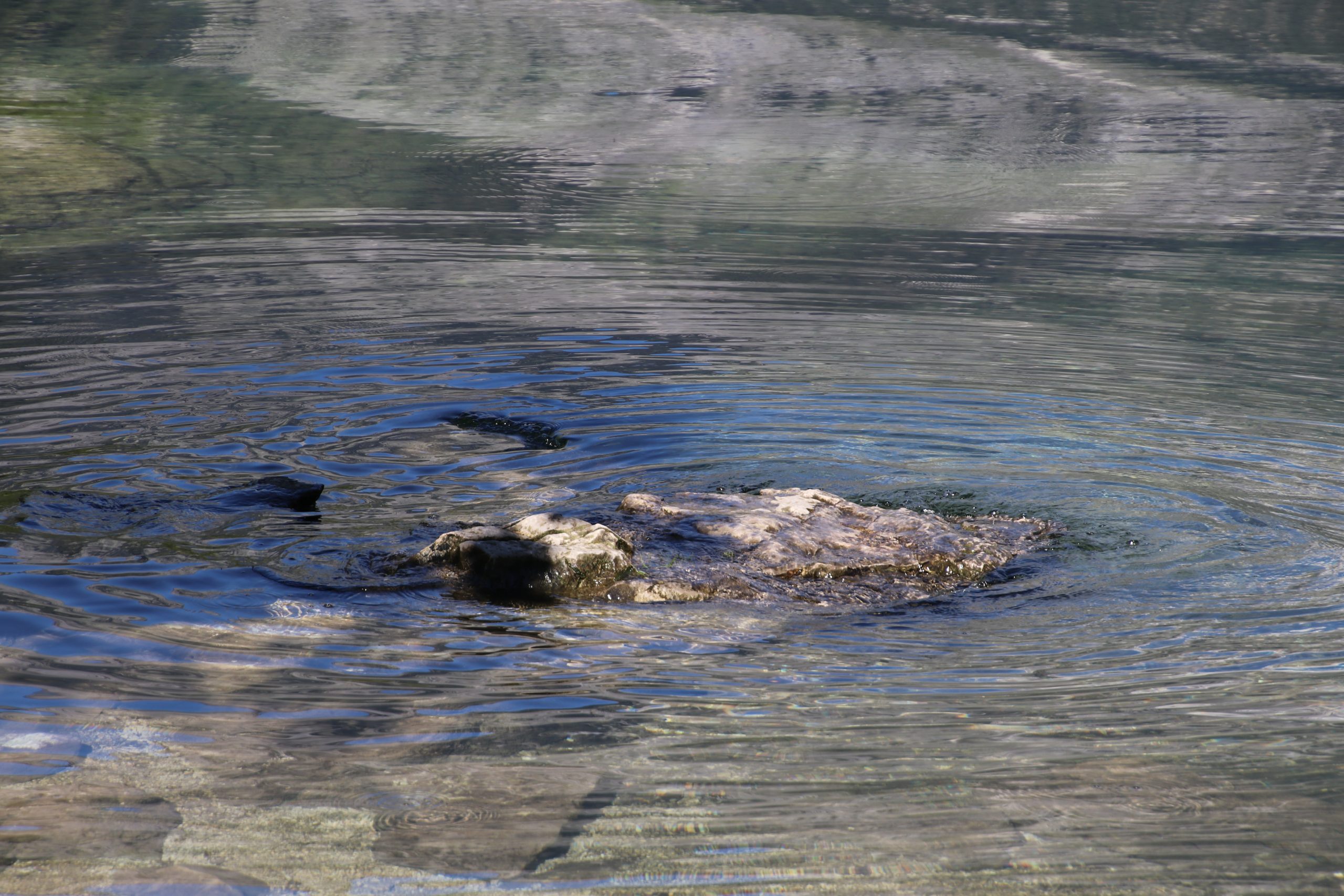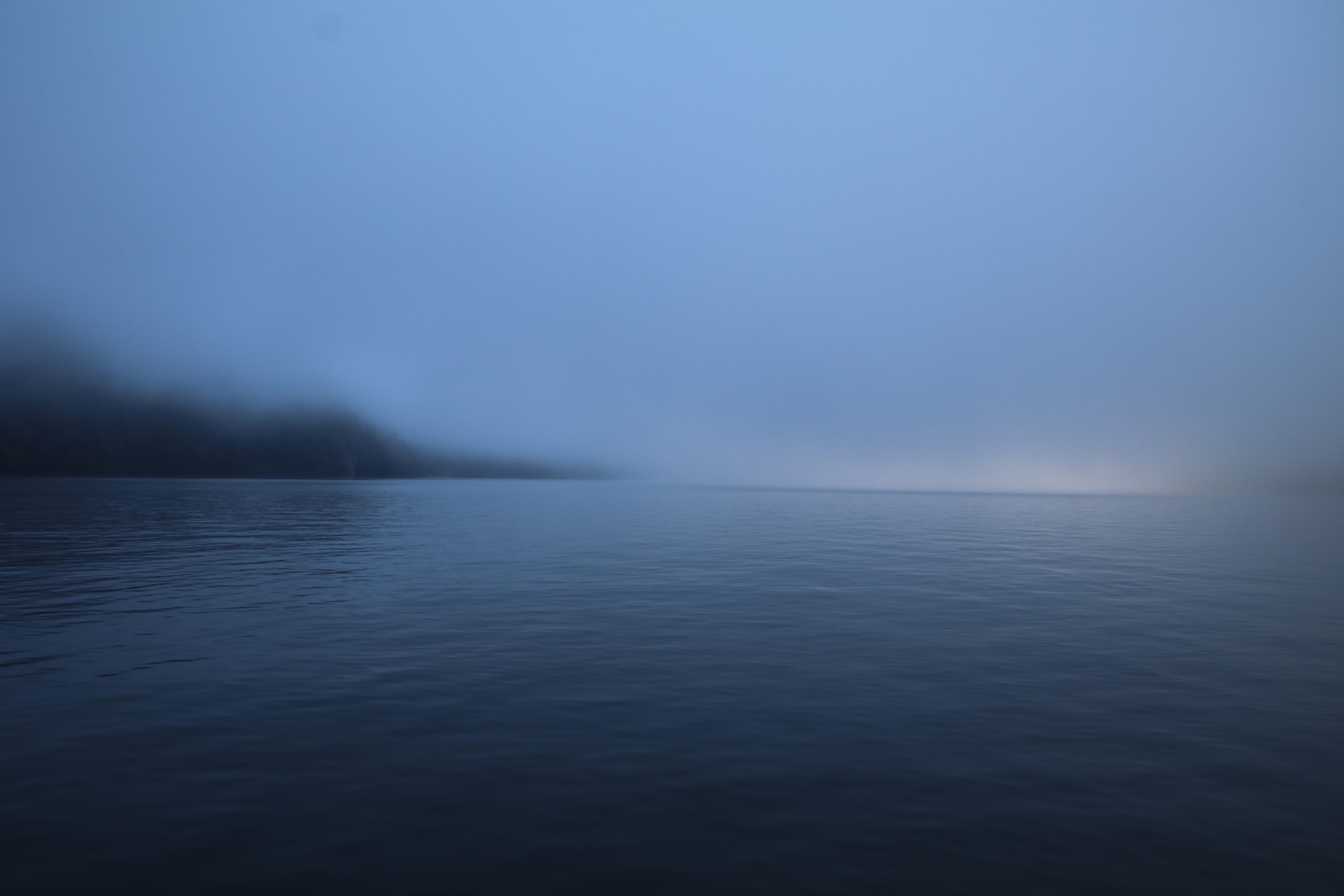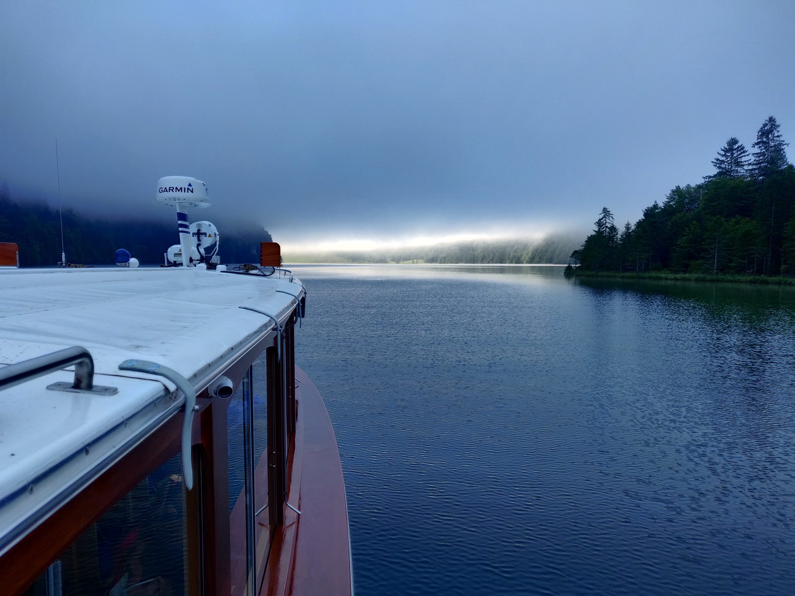 Die gesamte Überfahrt sehen wir mehr oder weniger gar nichts. Dafür erzählt uns der Kapitän viel Fakten und Anekdoten über den See. Wir erfahren, dass er teils fast 200 Meter tief ist und von vielen unterirdischen Quellen gespeist wird. Dadurch liegt die Temperatur im wesentlichen um die 4 Grad, nur die oberen Schichten erwärmen sich nennenswert. Im Sommer schaffen es die oberen Zentimeter gelegentlich auf knapp 20 Grad. Wenn man hier schwimmen geht, mahnt er, sollte man sehr flach schwimmen.