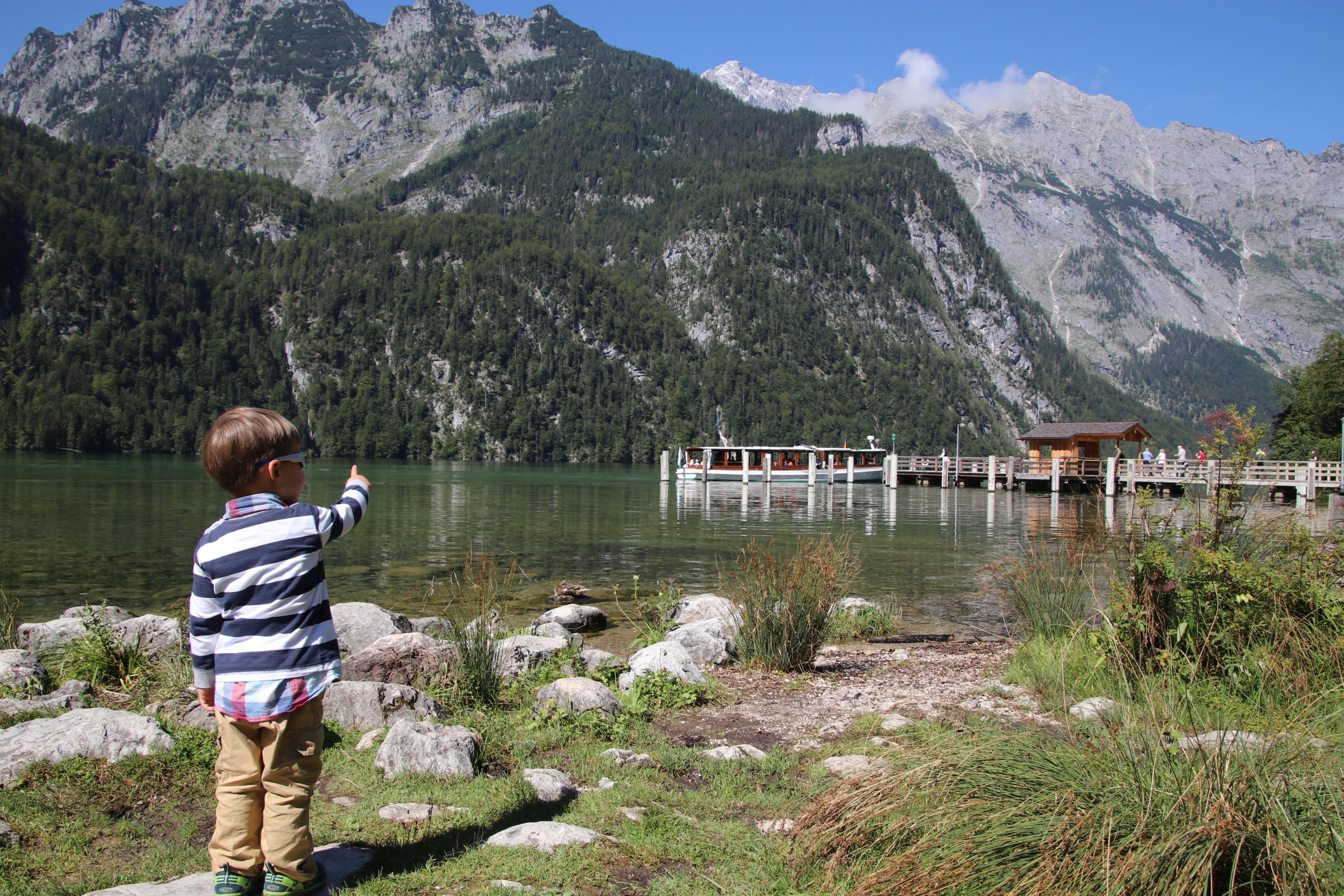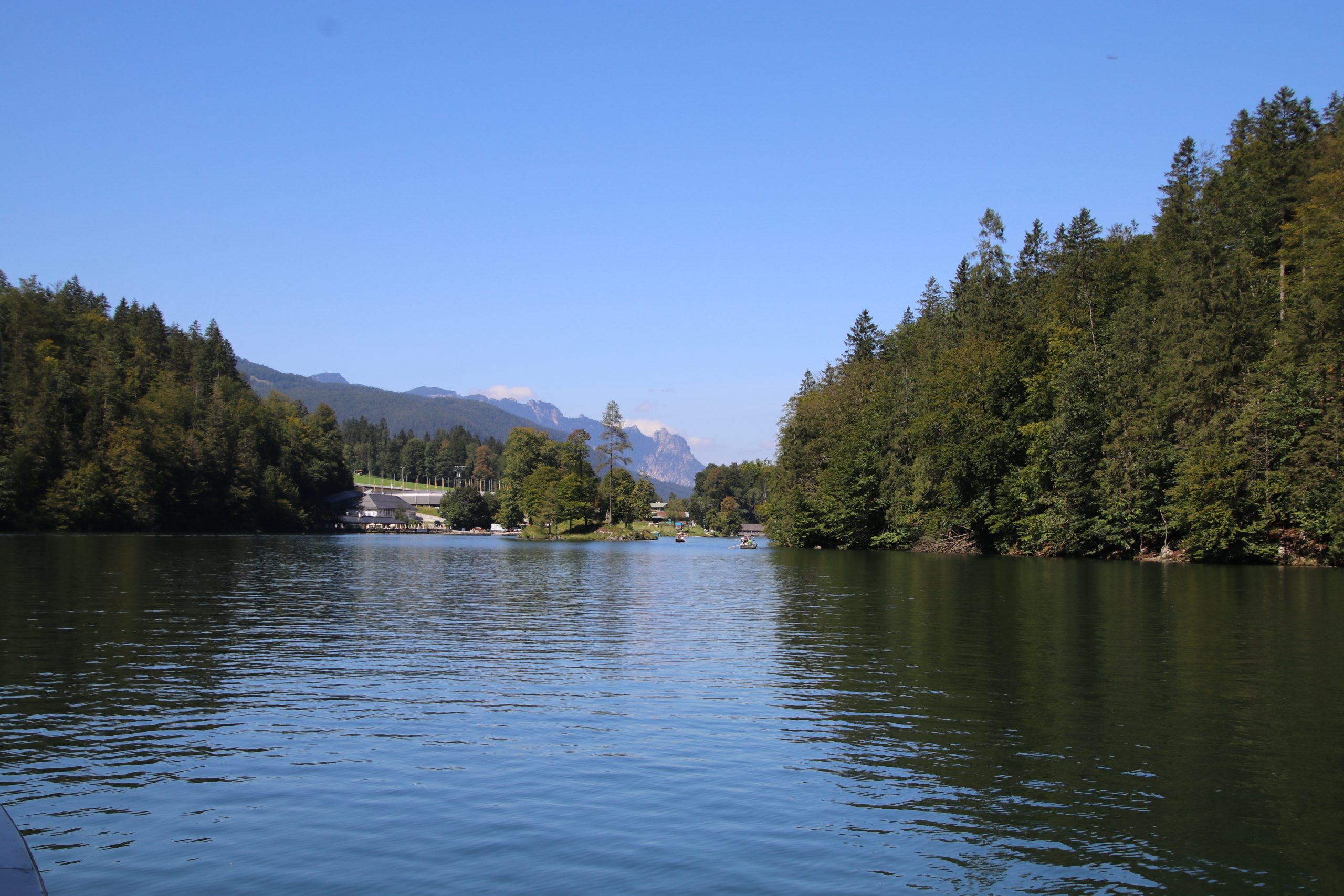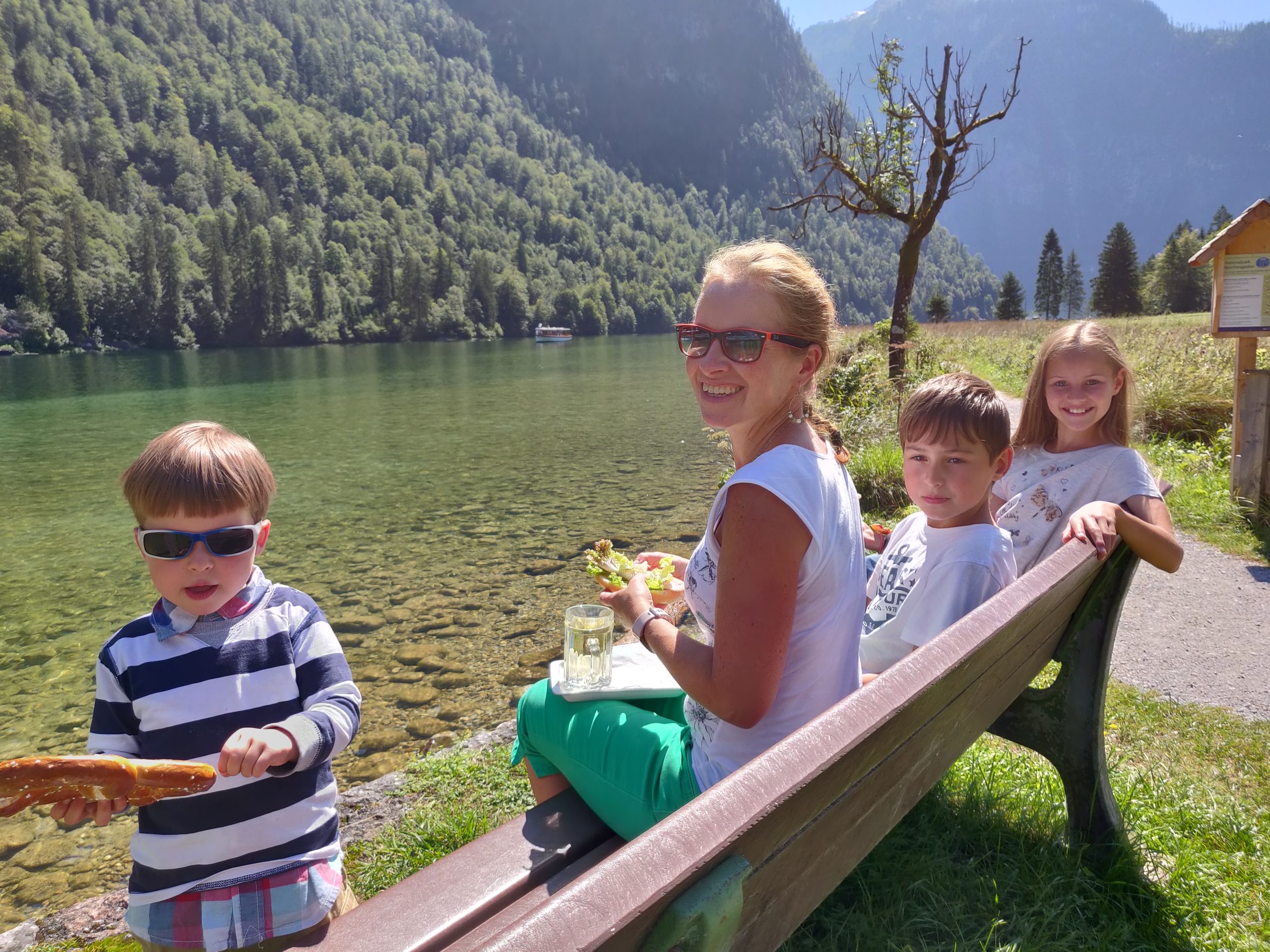 Eigentlich wollen wir direkt wieder zurück zum Camper fahren. Allerdings ist es inzwischen schon recht spät geworden und eine weitere Stunde wollen wir nicht auf das Mittagessen warten. Darum steigen wir in St. Bartholomä aus und holen uns Fisch und Bretzeln zum Mittag.