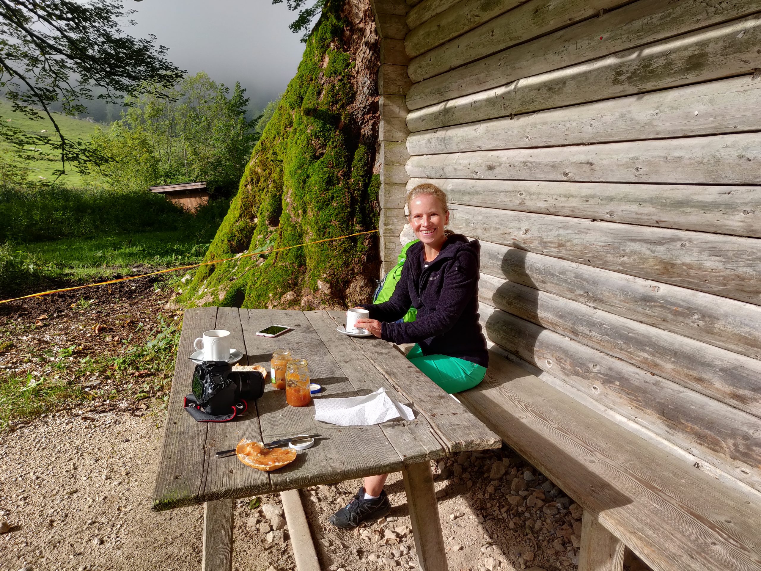 Nachdem wir ausgestiegen sind, machen wir erst einmal Frühstückspause. Wir haben Croissants, Brötchen und Marmelade im Gepäck. Kaffee bekommen wir vor Ort. Die Sonne gewinnt langsam Oberhand über den Nebel.