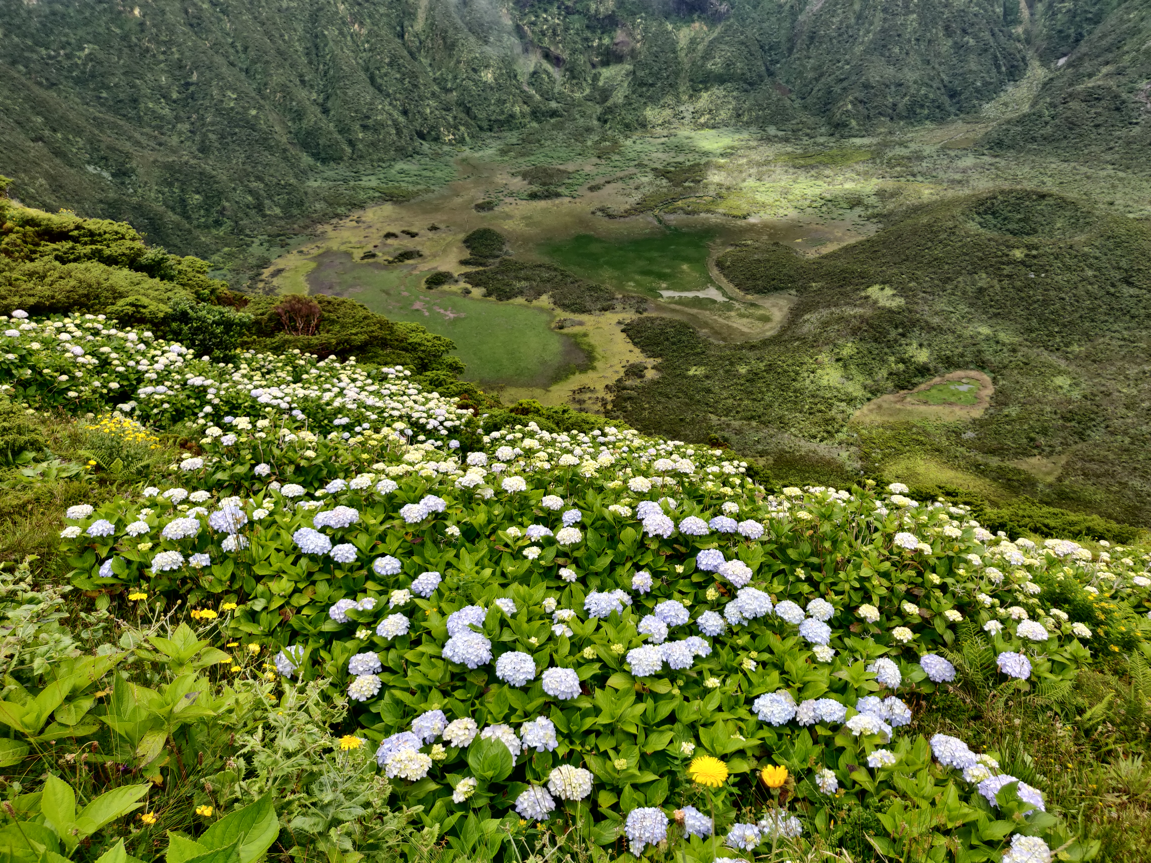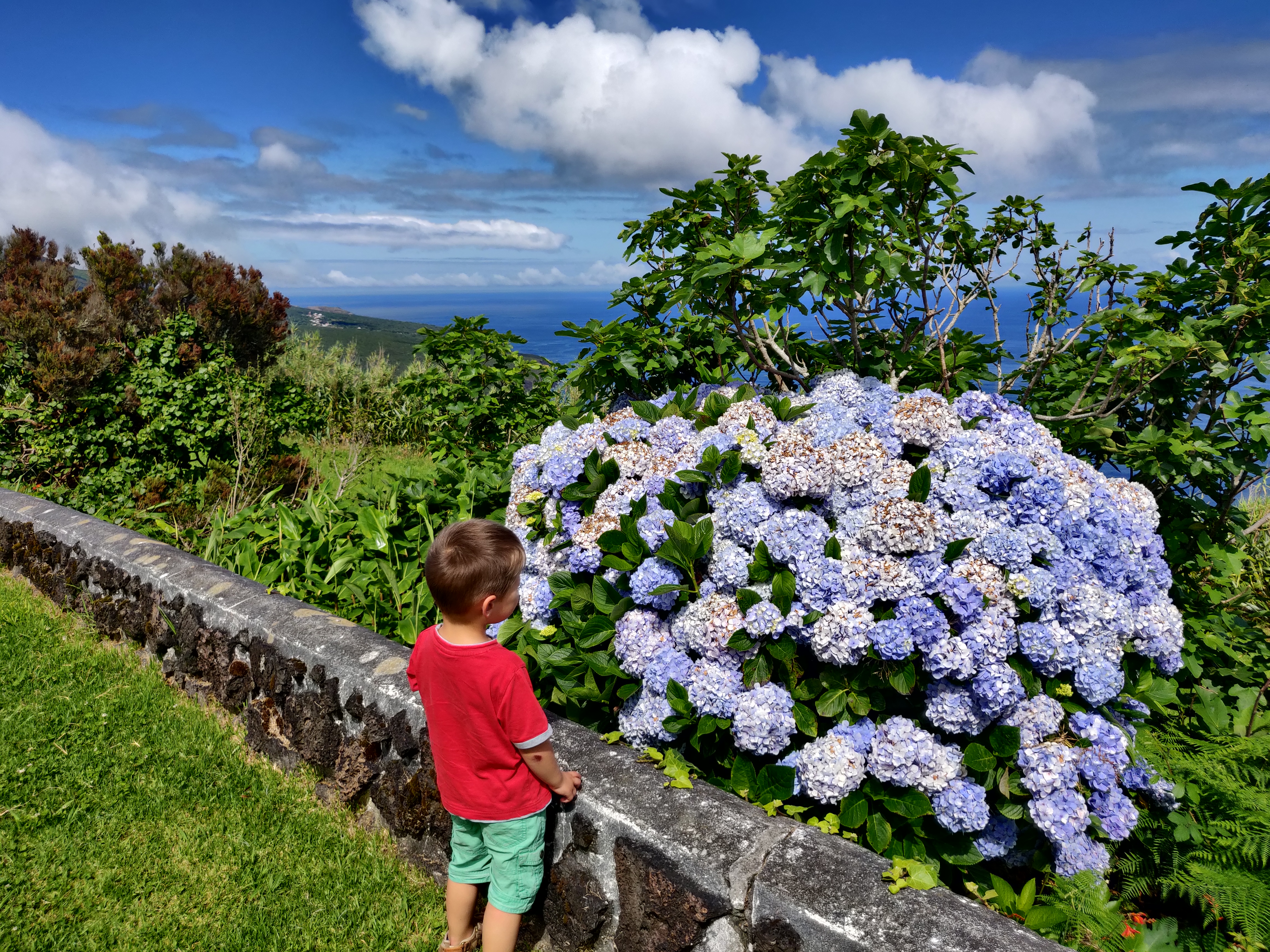 Wir starten vom Flughafen in Richtung Nordosten, mit dem Ziel, die Insel einmal zu umrunden. Schnell fält uns eine Besonderheit auf. Blau bühende Hortensien, welche hier heimisch sind, säumen alle Straßen der Insel.