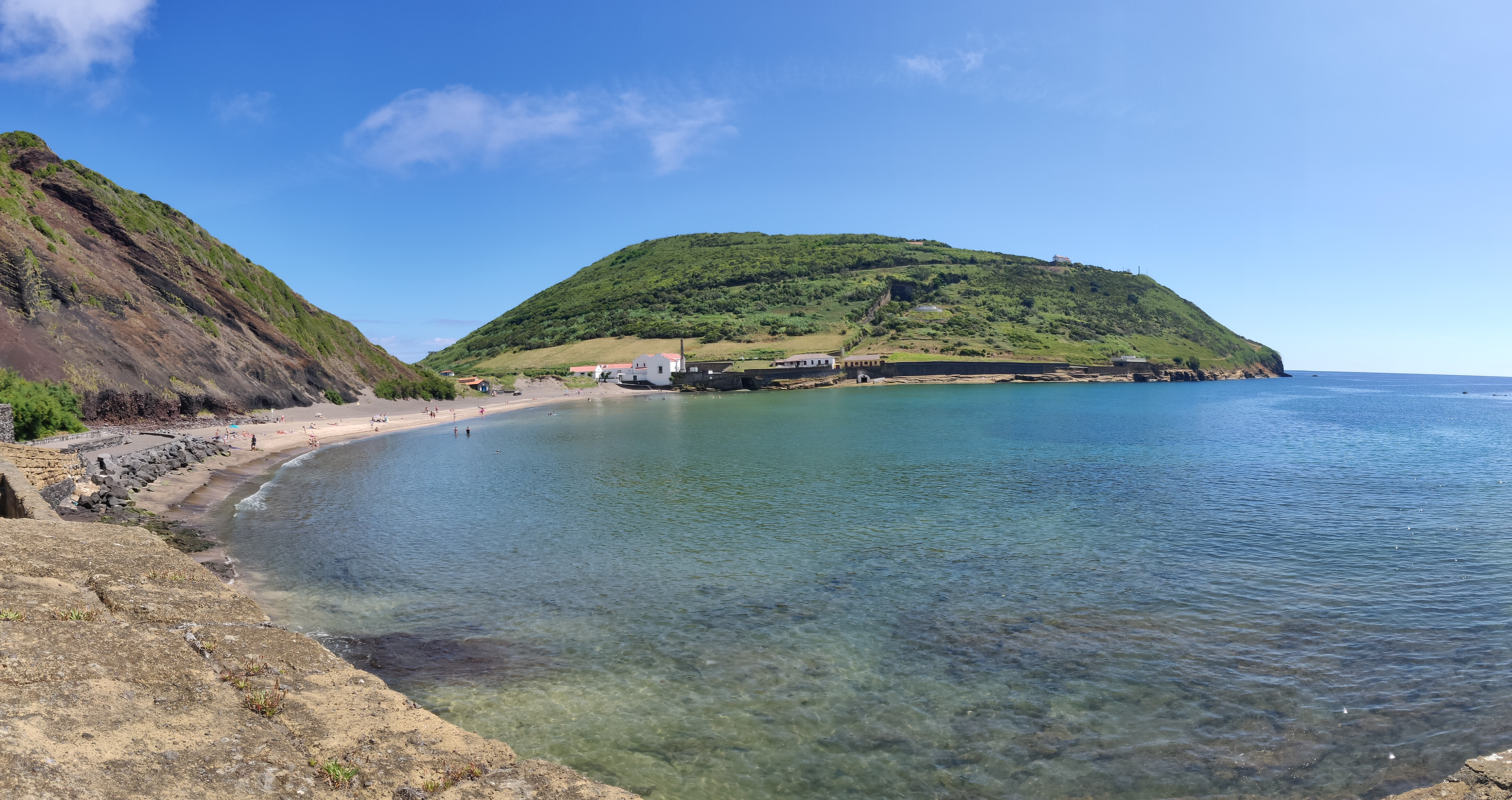 Wir fahren hinab nach Horta. Trotz der vielen Hortensien ist die Namensähnlichkeit nur zufällig. Bevor wir hier in die Fähre steigen, halten wir noch kurz die Füße in das lauwarme Meer am Sandstrand von Porto Pim. Das Wasser der Bucht ist extrem seicht und entsprechend warm, aber leider fehlt uns die Zeit für eine lange Badepause.