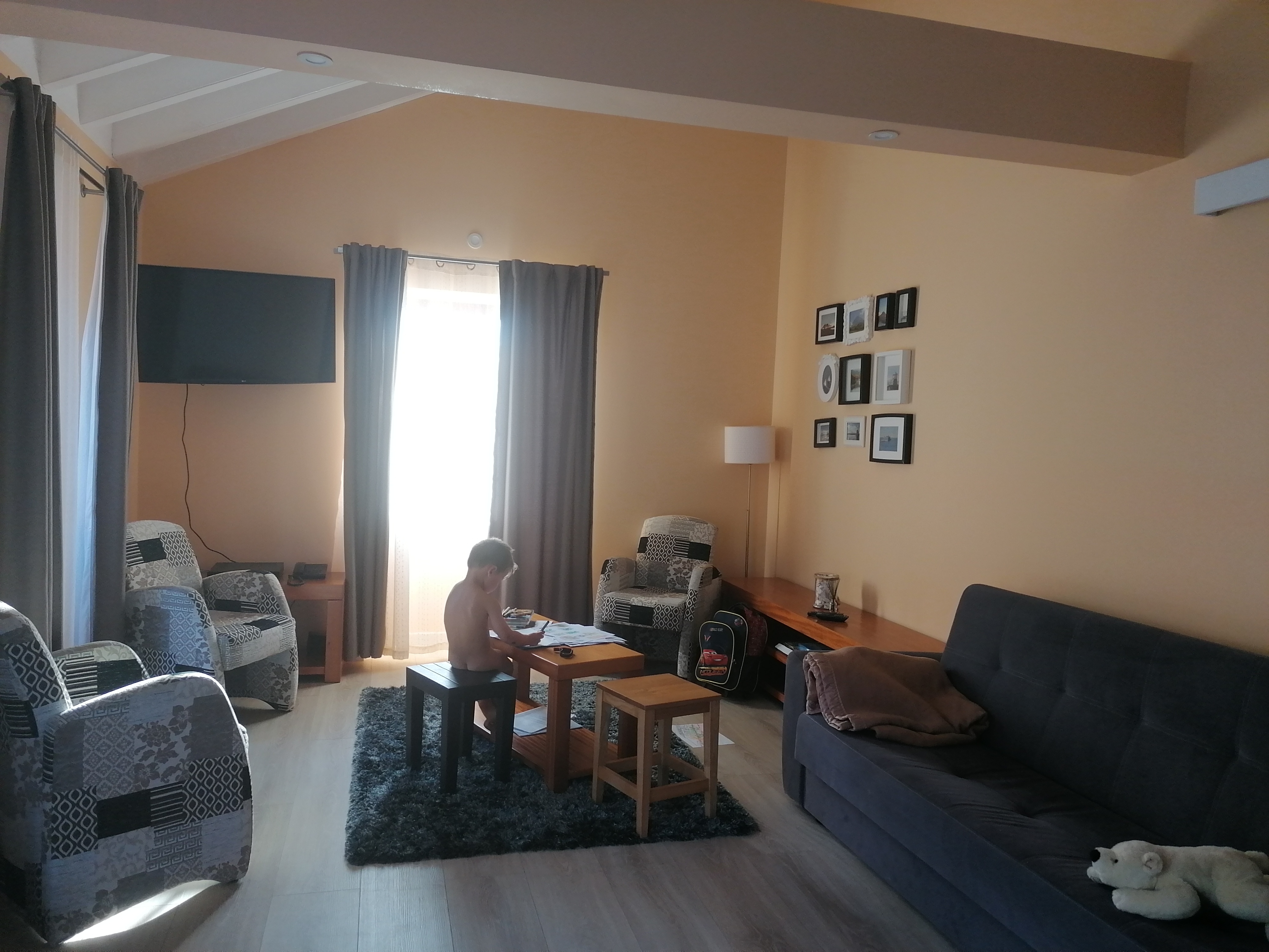 Das Ferienhaus gefällt uns sehr, es gibt zwei Schlafzimmer, zwei Bäder und ein großes Wohnzimmer mit offener Küche.