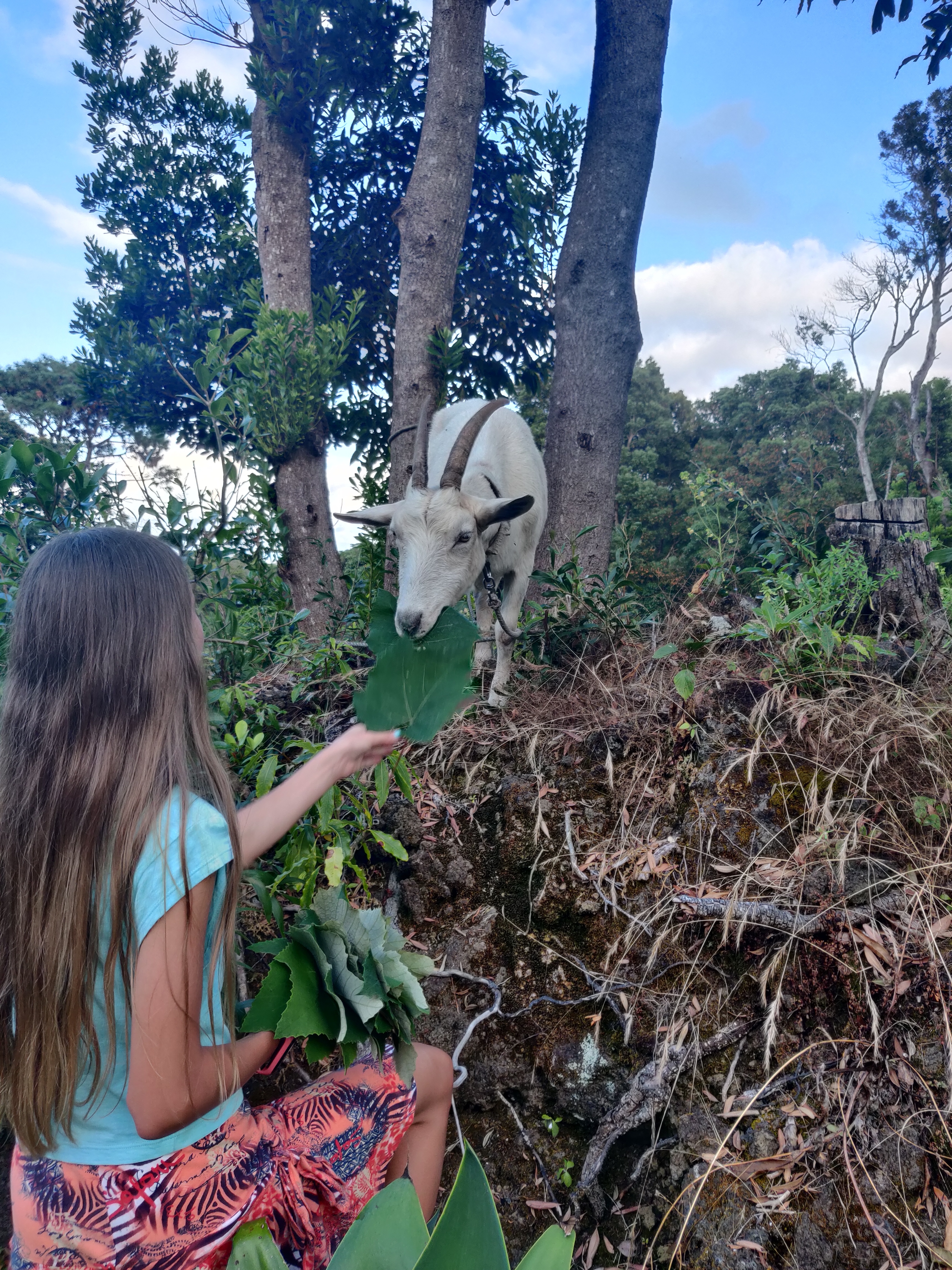 Zum (späten) Abendbrot sind wir wieder im Ferienhaus. Im Anschluss erkunde ich mit den Kindern noch das Gelände. Wir entdecken eine Ziege, Rotwild und Hühner.