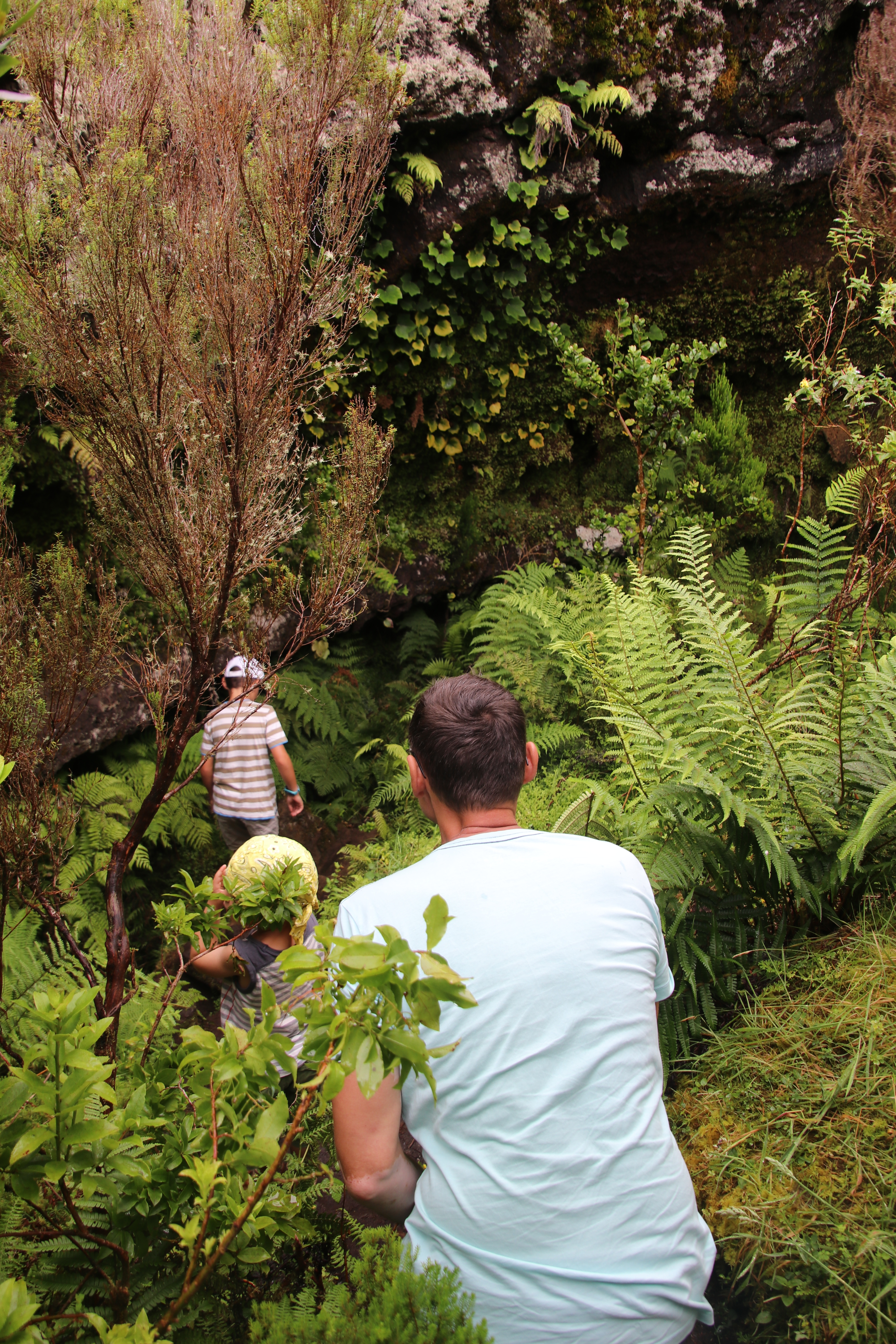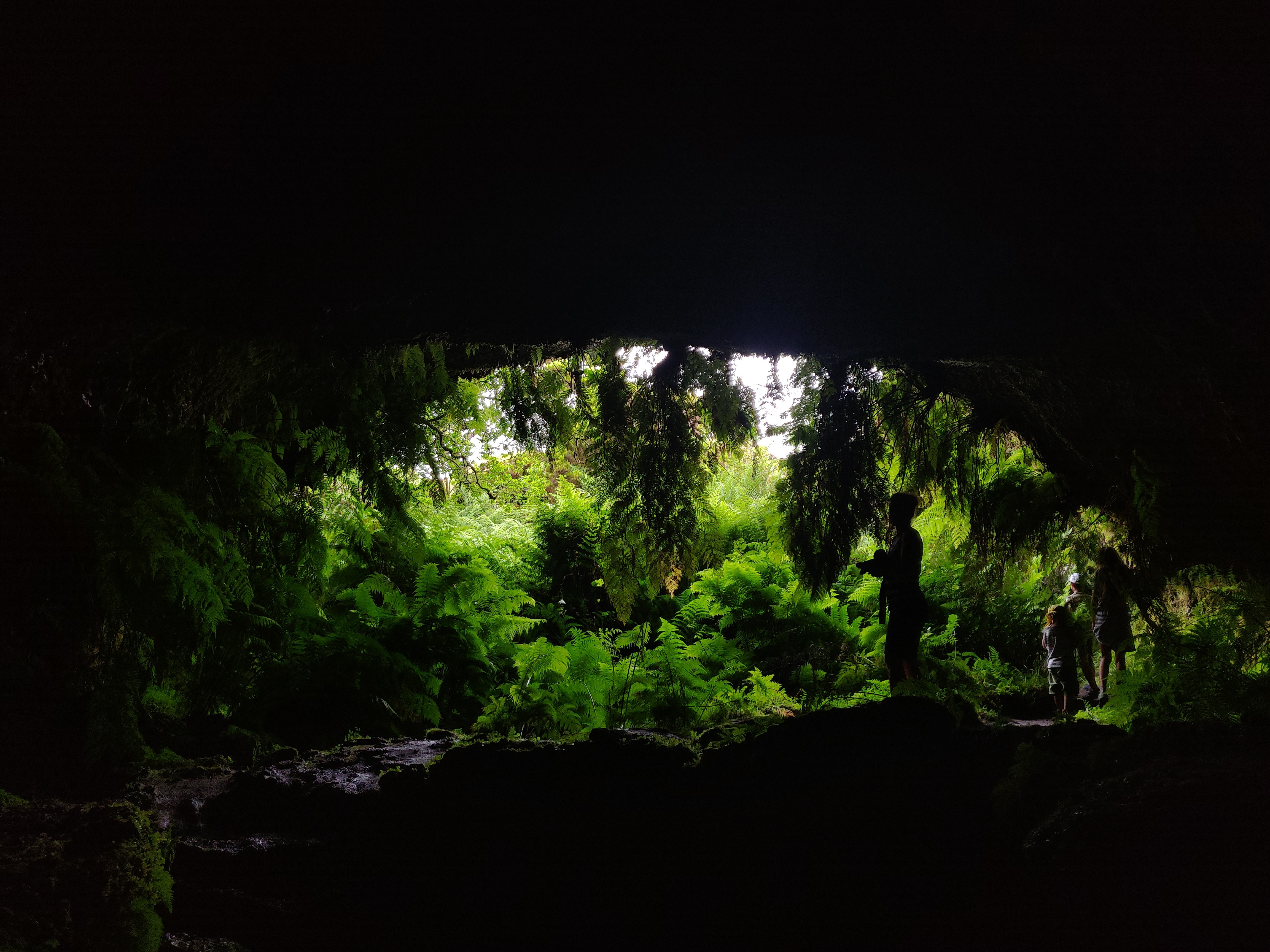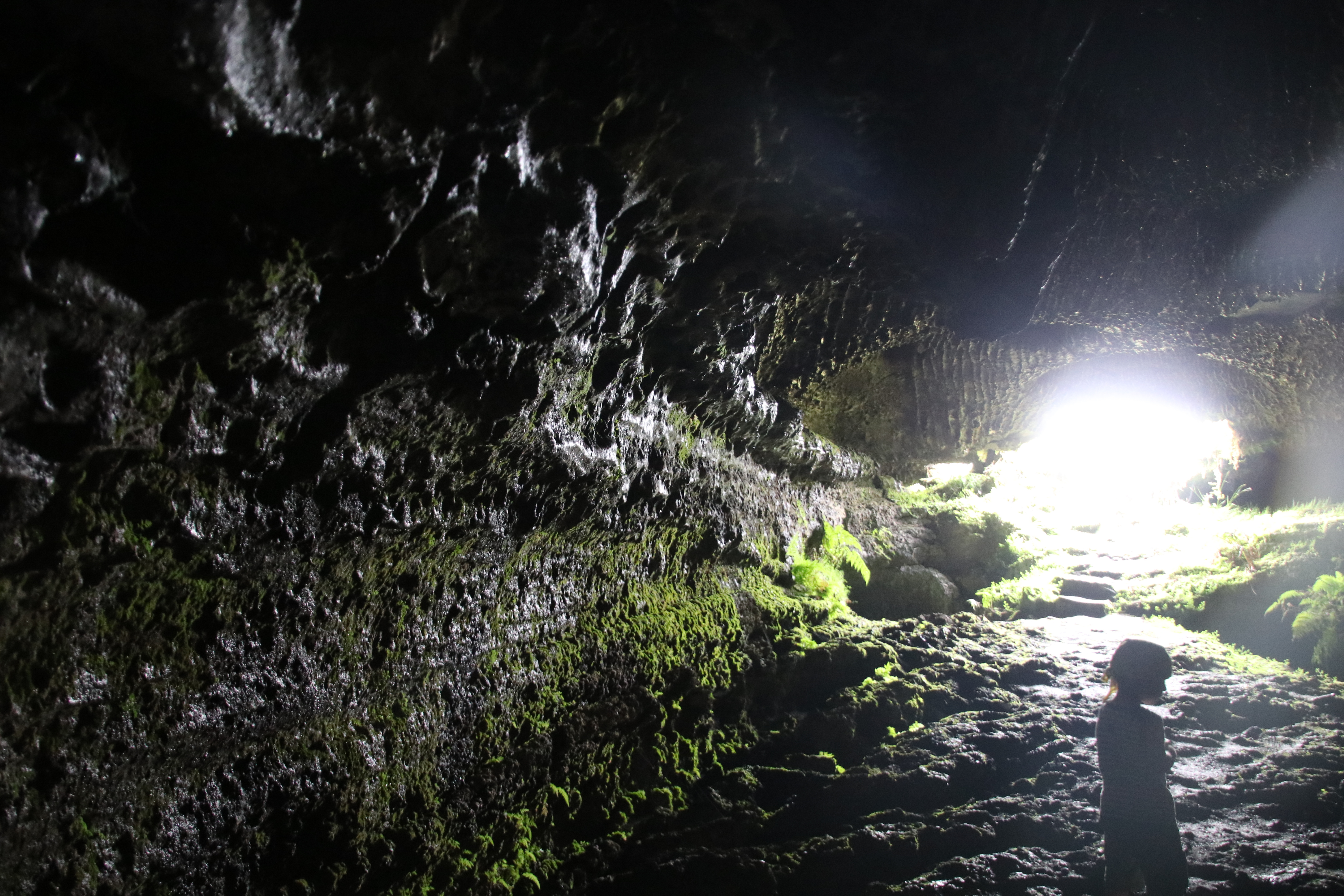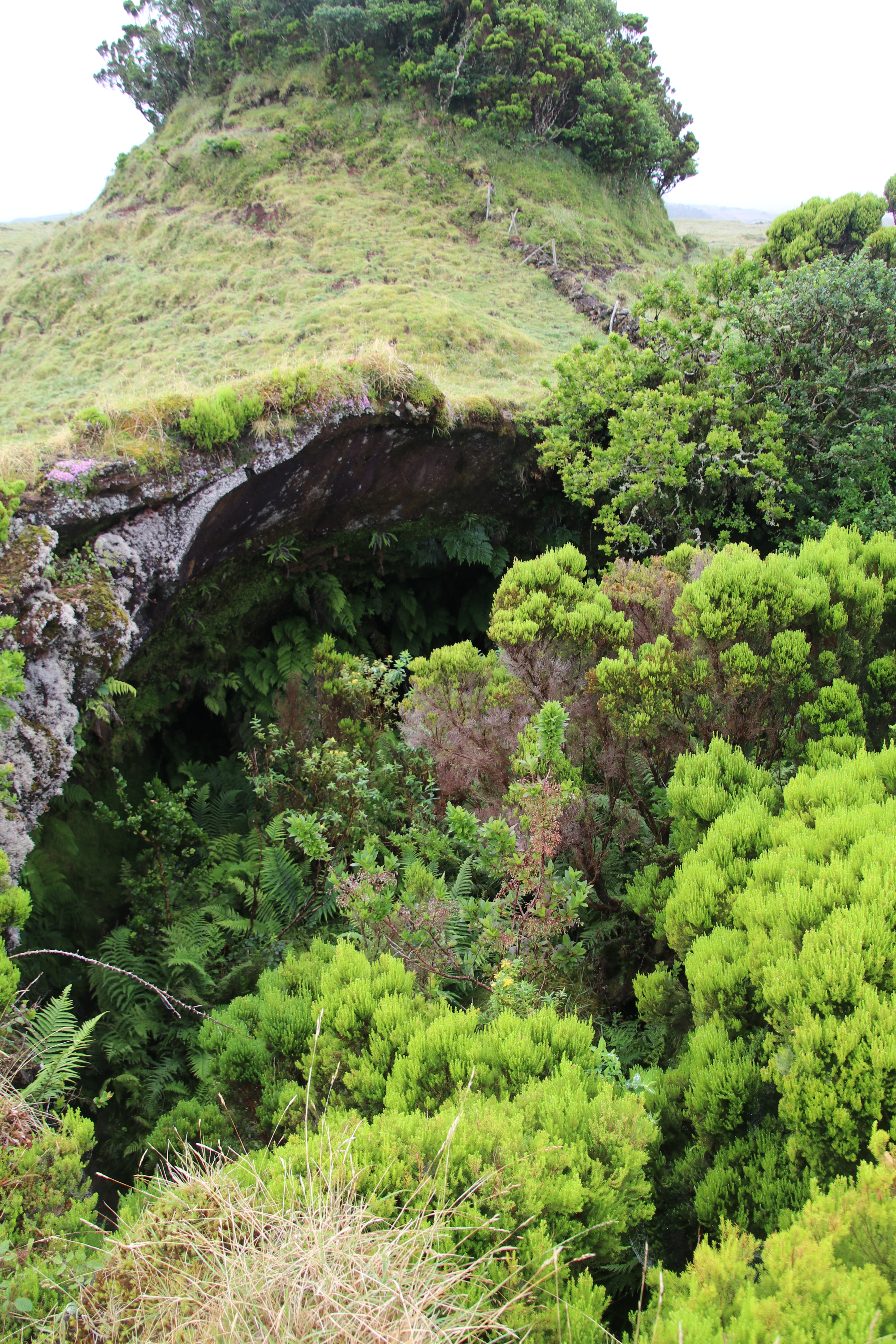 Diese Arte Höhle entsteht, wenn langsam fließende Lava von oben her erstarrt. Unter dieser Decke fließt die Lava noch gut isoliert weiter. Versiegt der Lavastrom, leert sich die Röhre und hinterlässt eine manchmal kilometerlange Höhle. Diese hier ist aber nach wenigen Metern verschüttet.