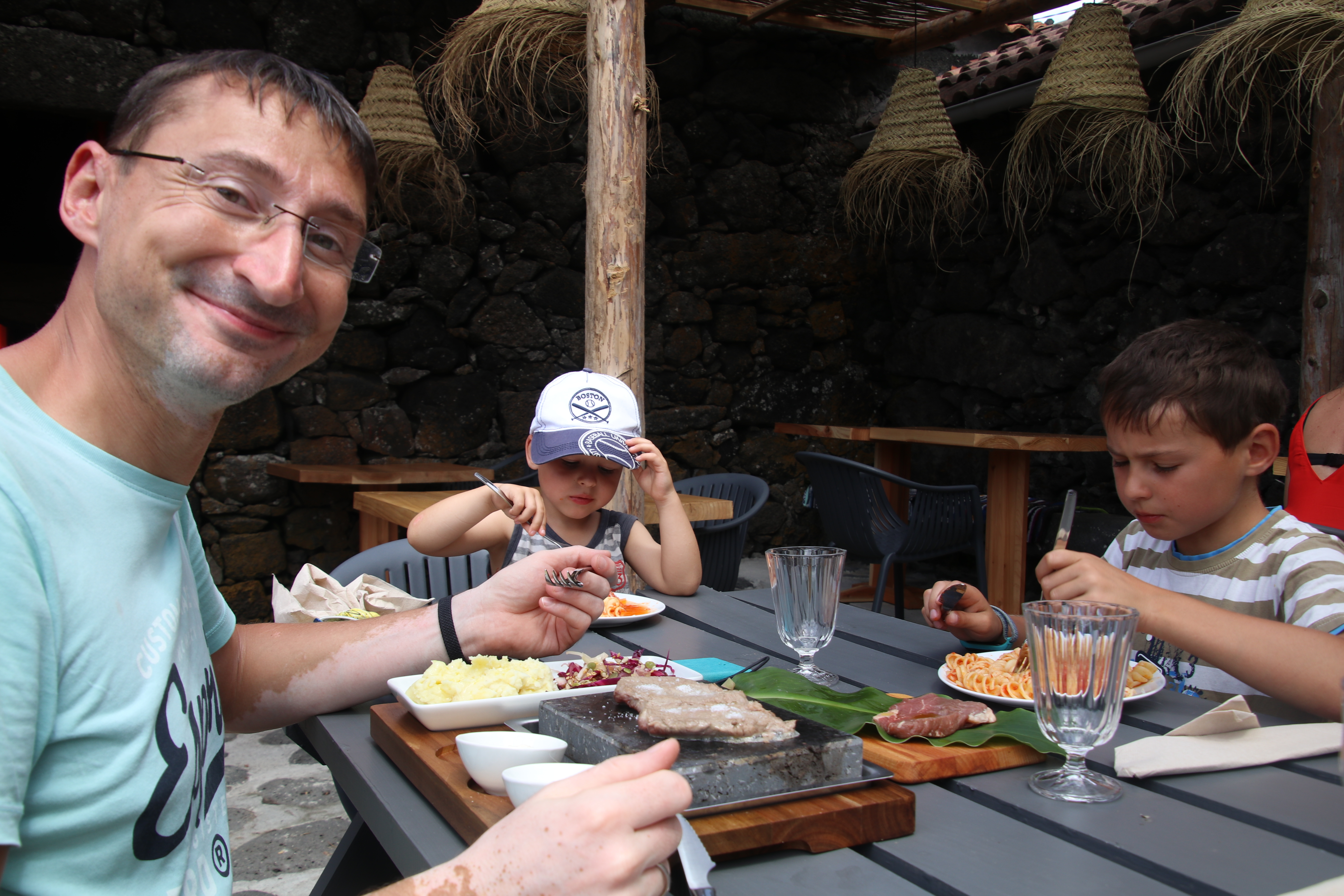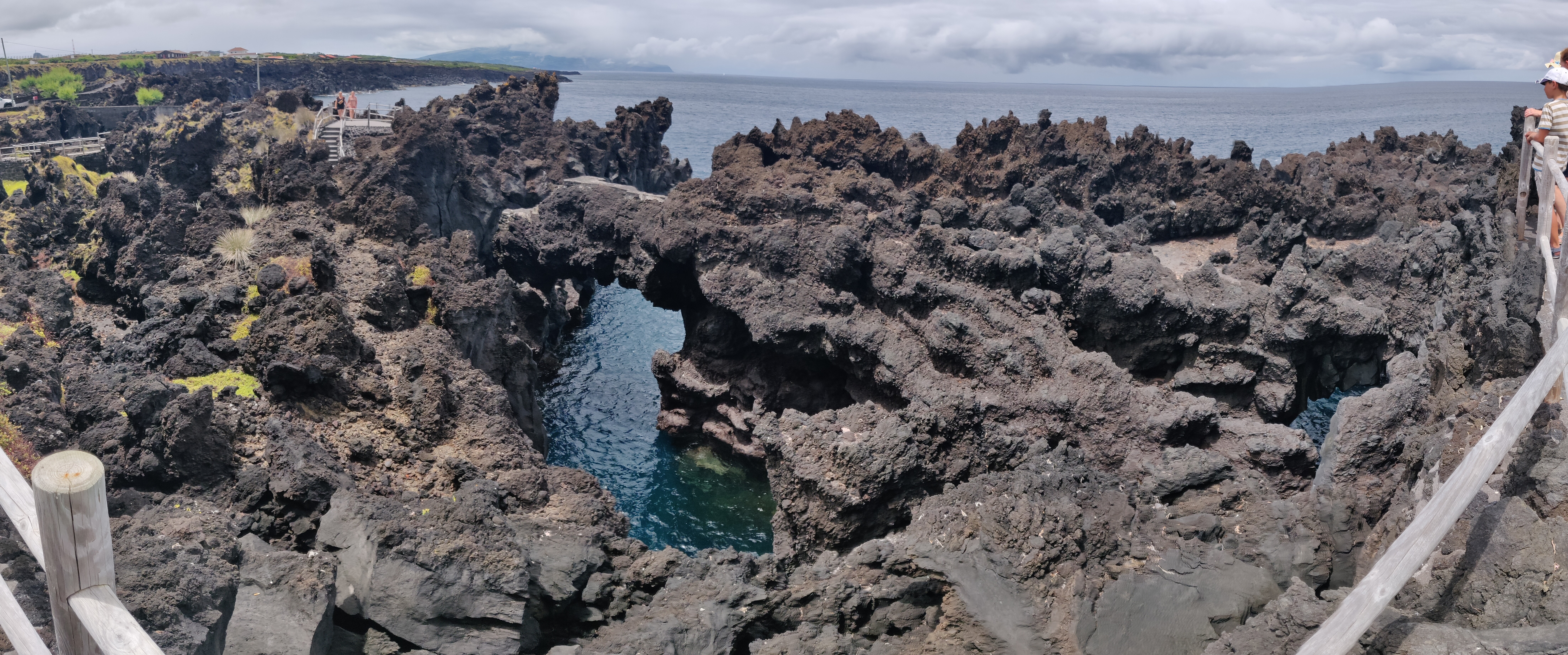 Nach einem exzelenten Essen (die 3 Kinder haben 5 Portionen Nudeln verdrückt) fahren wir weiter die Nordwestküste entlang, welche maßgeblich durch Lava geformt wurde und dieses Bild bis heute behalten hat. Wir stoppen an mehreren Stellen, an denen außergewöhnliche Felsformationen zu sehen sind.