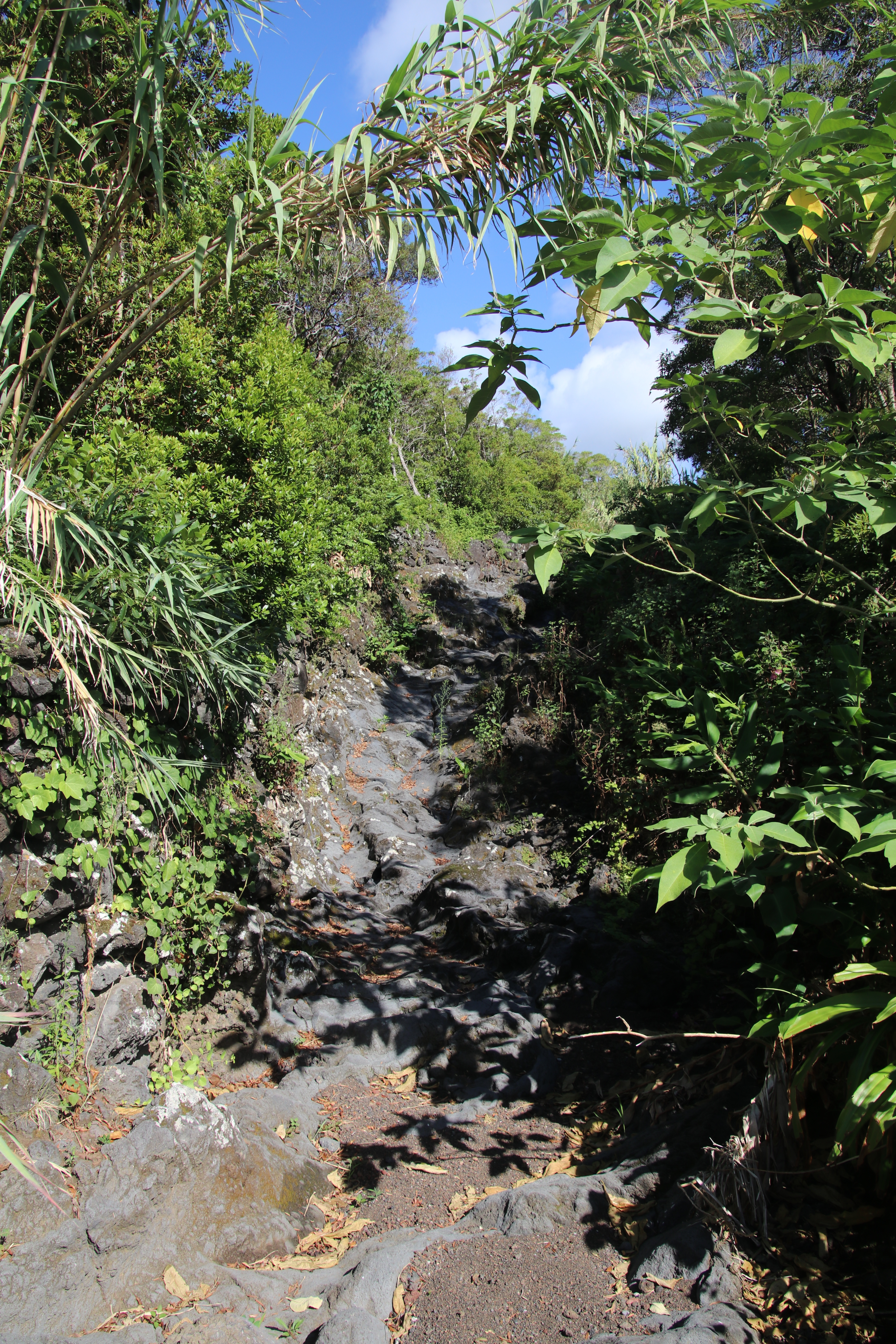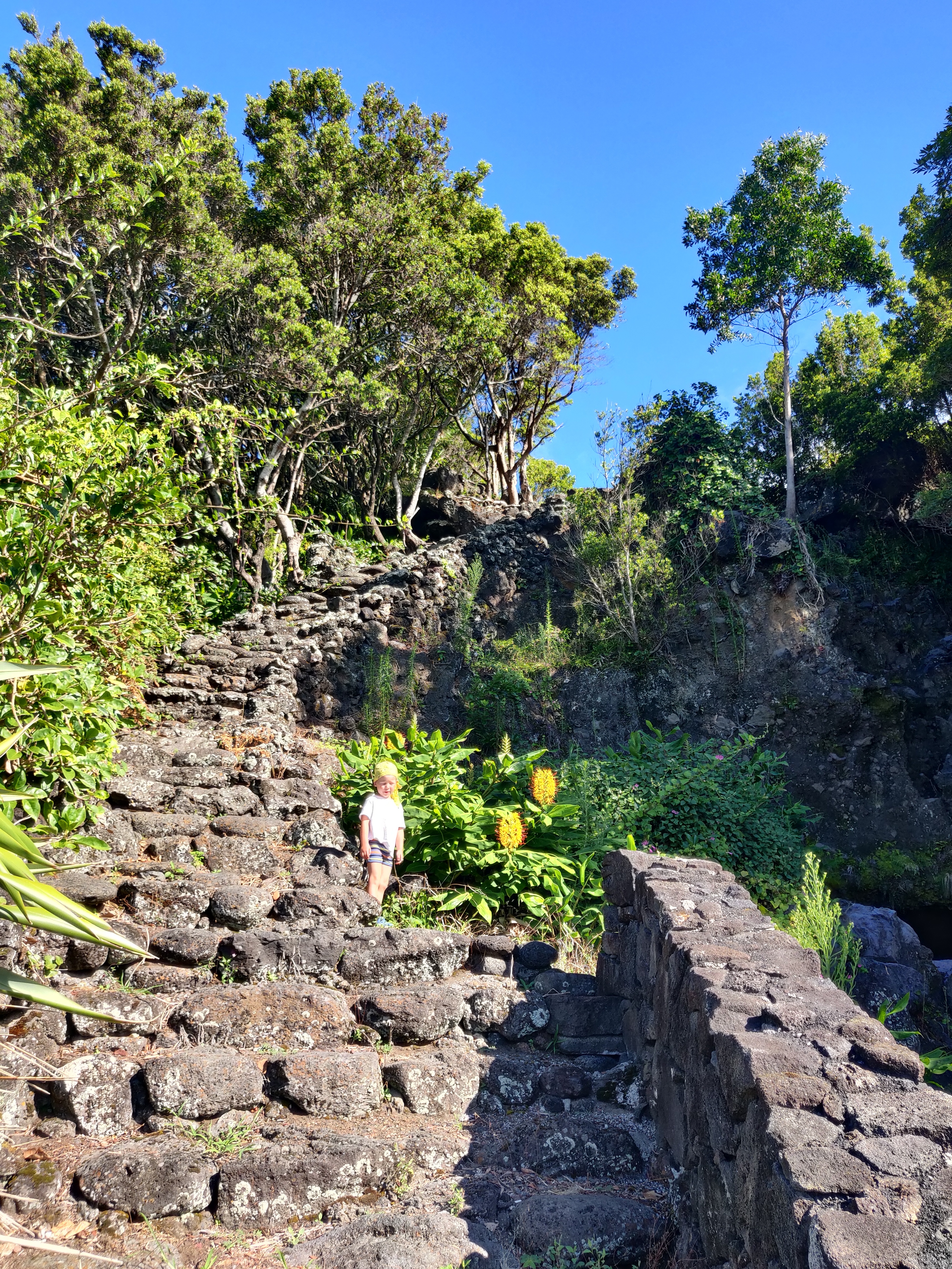 An der Badestelle angekommen, schauen wir erst einmal, wohin die urig aussehende Steintreppe führt, die wir beim letzen Mal schon gesehen haben. Sie endet zunächst an einem Bachlauf, der gerade kein Wasser führt und geht dann in einen Wanderweg über.