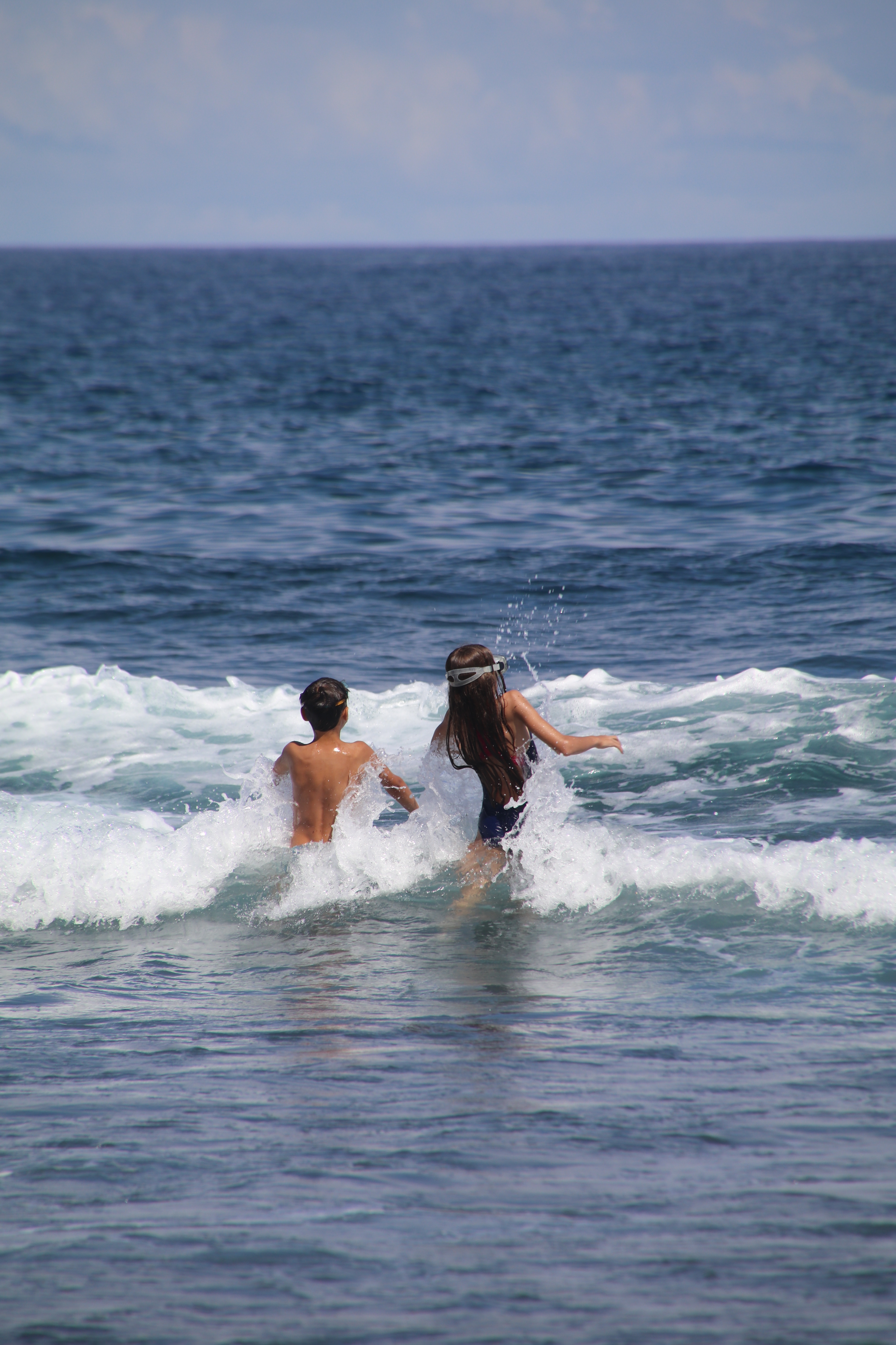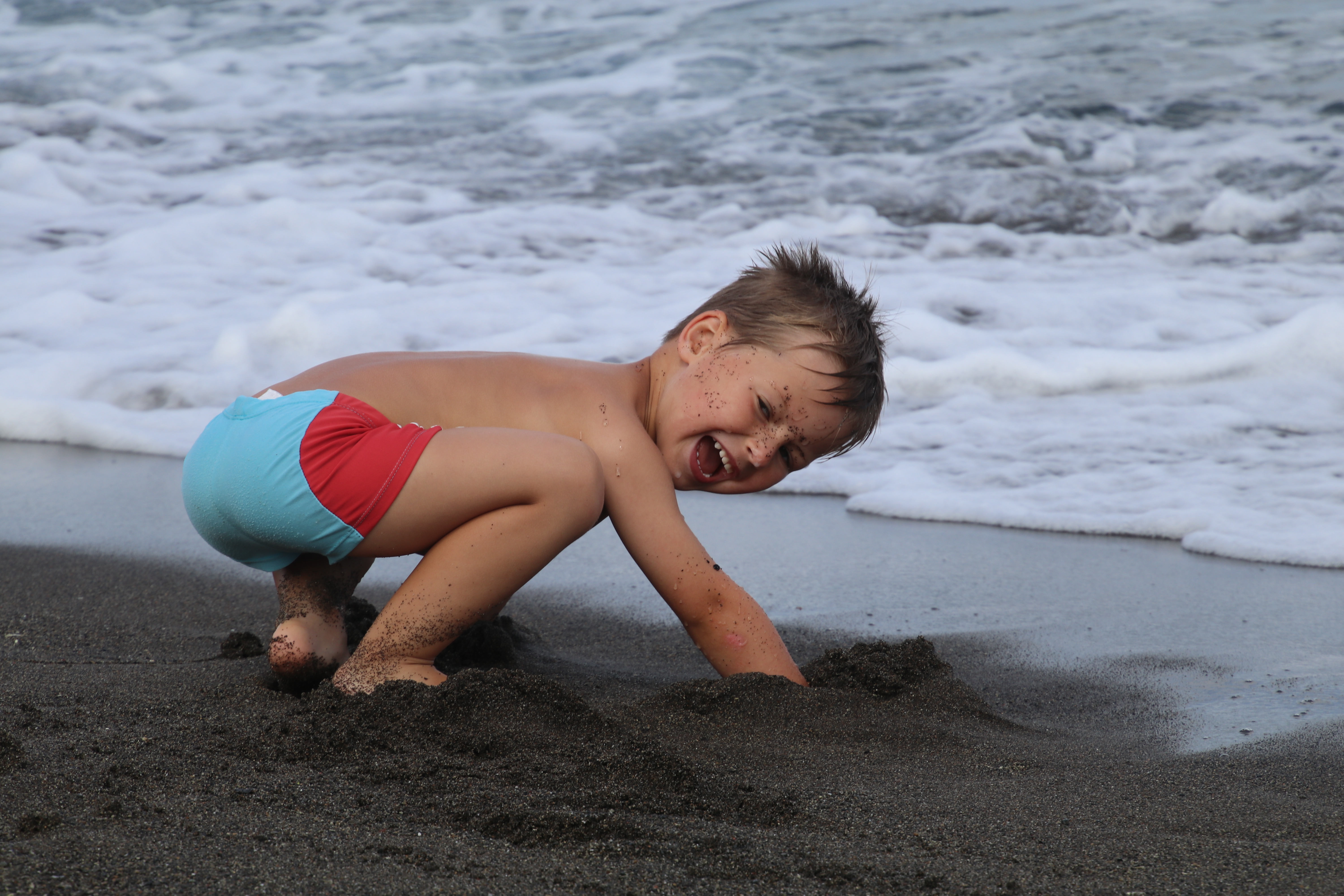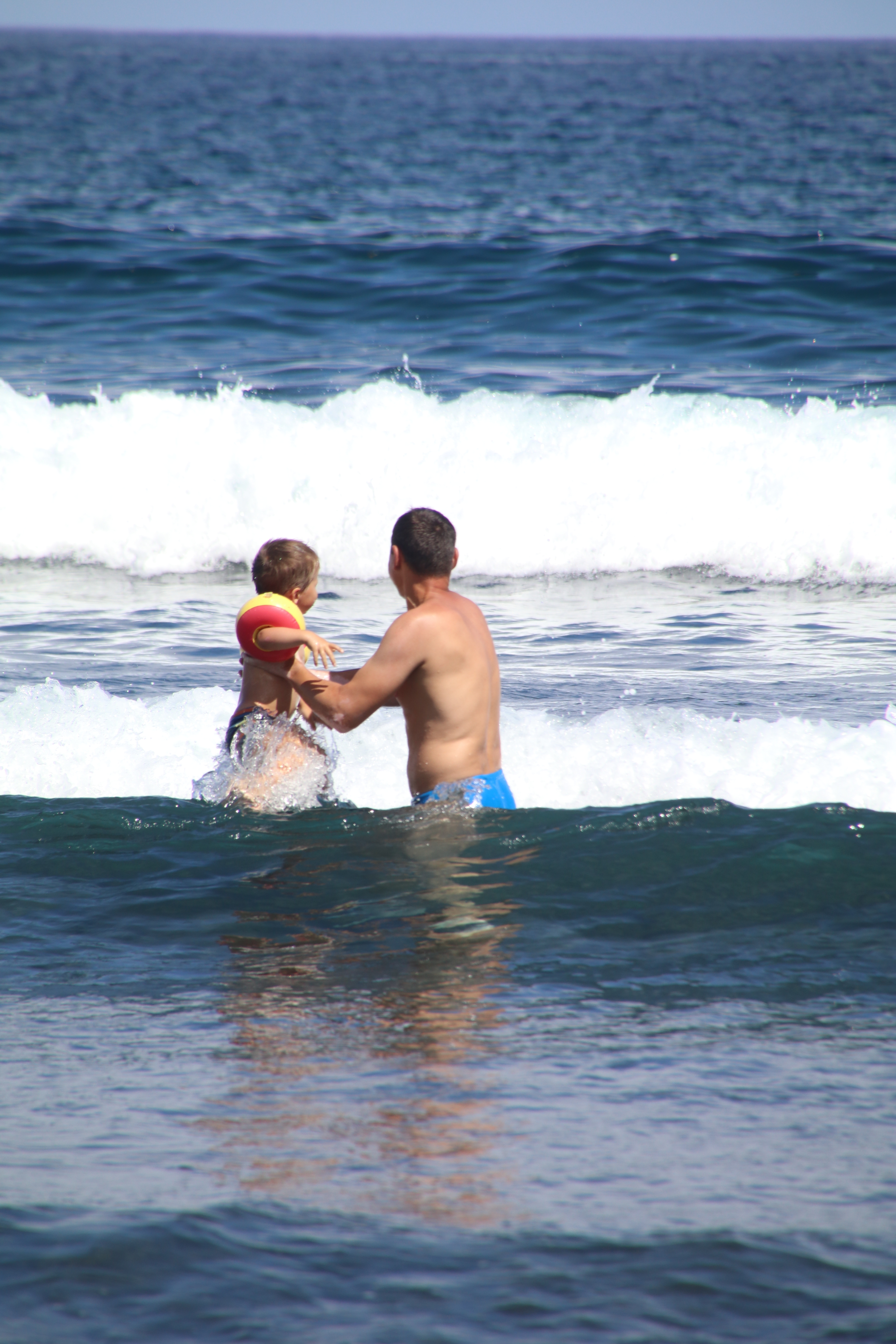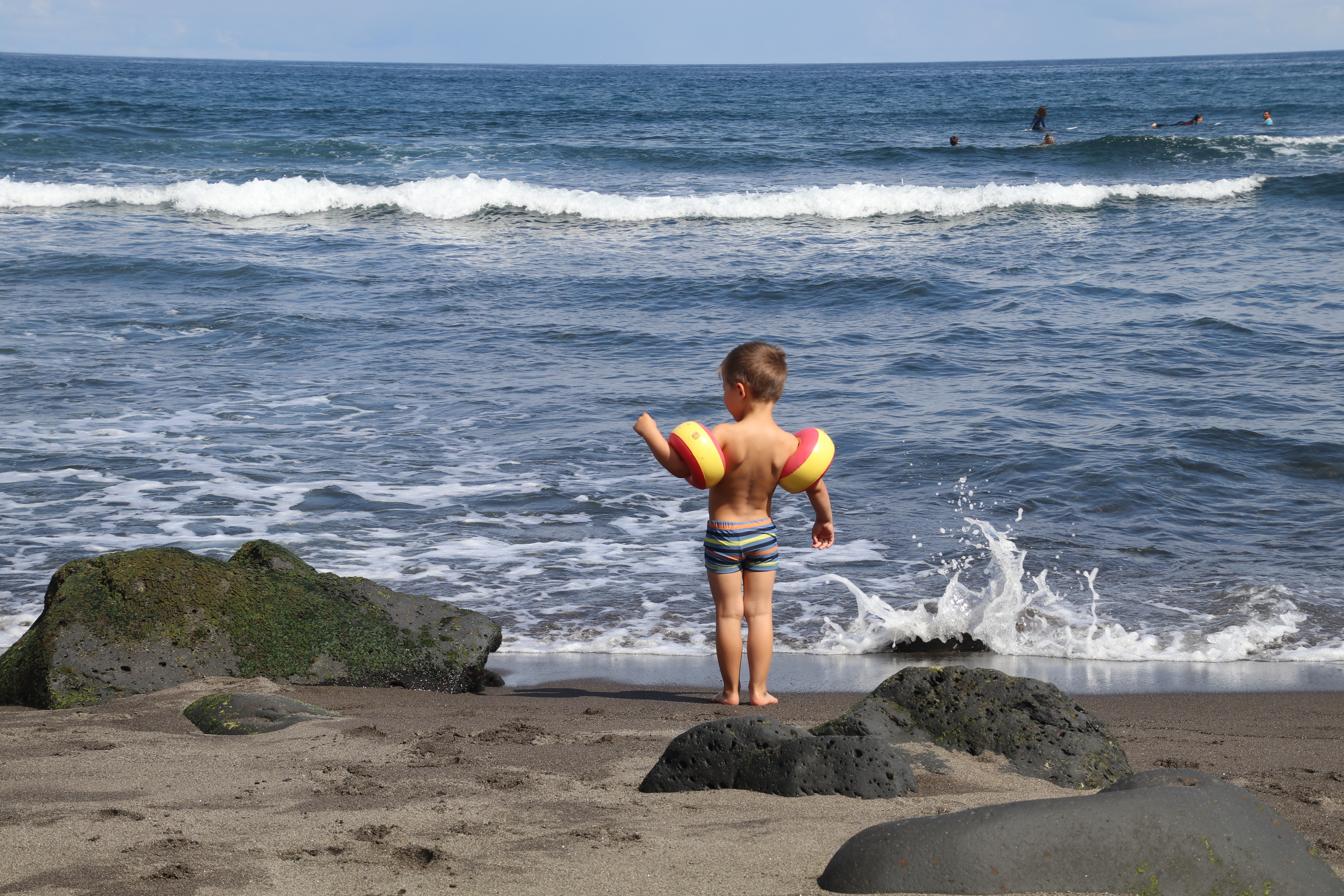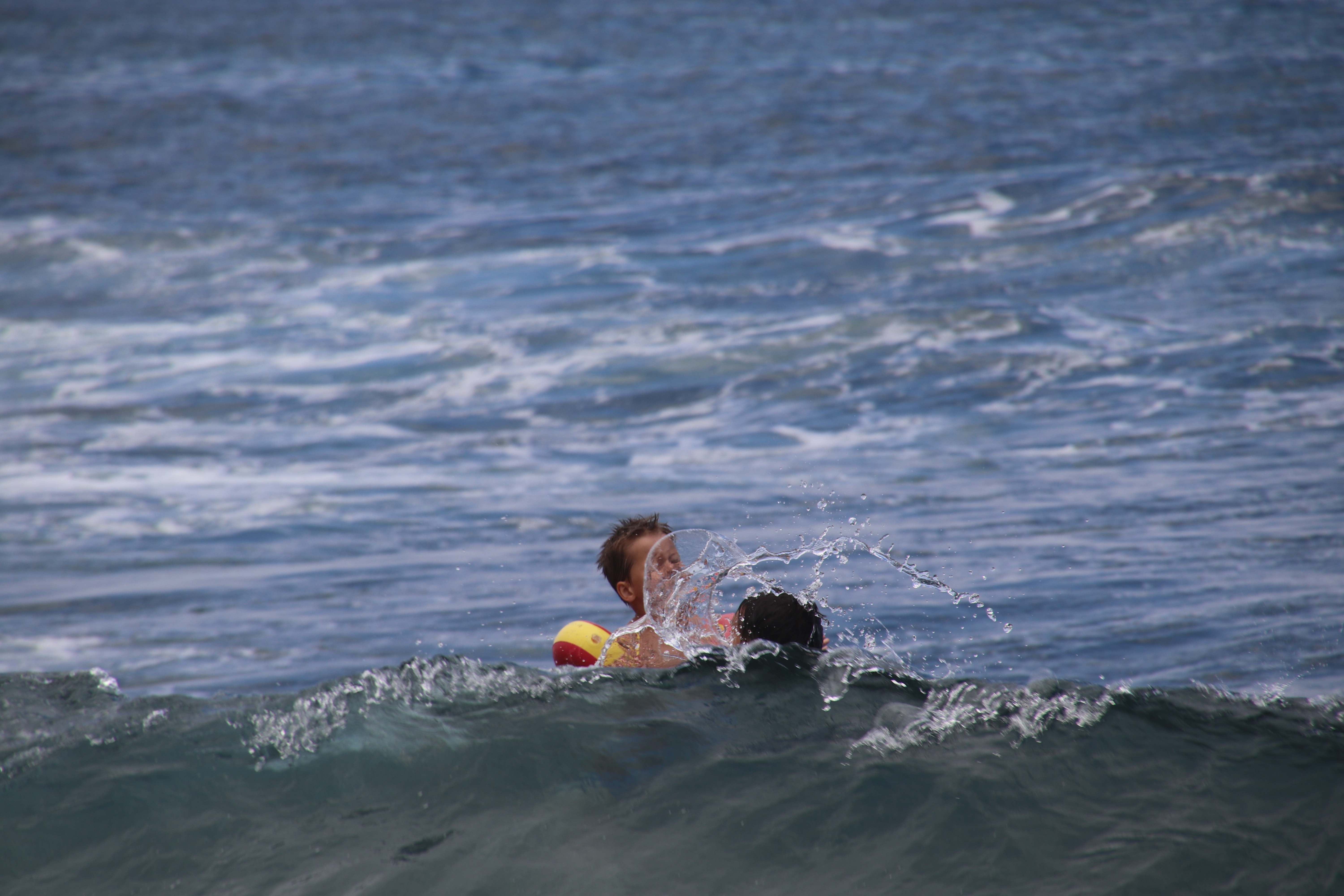 Auf dem Meer sind etwa einen Meter hohe, langgezogene Wellen, die außer uns auch jede Menge Surfer anziehen. Annabell und Felix stürzen sich sogleich ins Wasser. Wenig später kommt die Strandwacht und weist uns darauf hin, dass der Meeresboden hier steil abfällt, was neben den tollen Wellen auch für eine gefährliche Strömung sorgt. Wir ziehen zum Baden in die Mitte des Strandes um, der unter Beobachtung der Strandwacht steht.