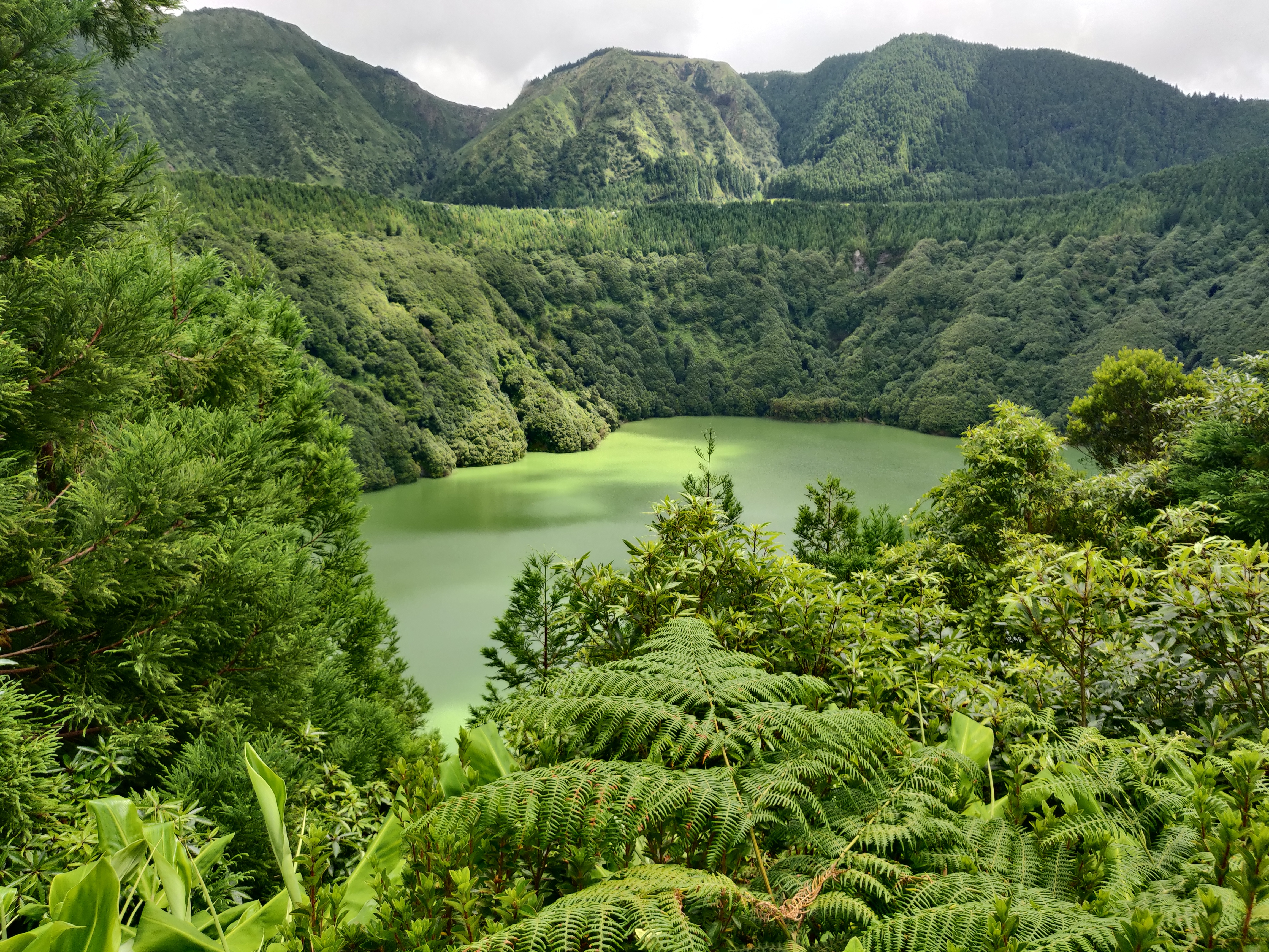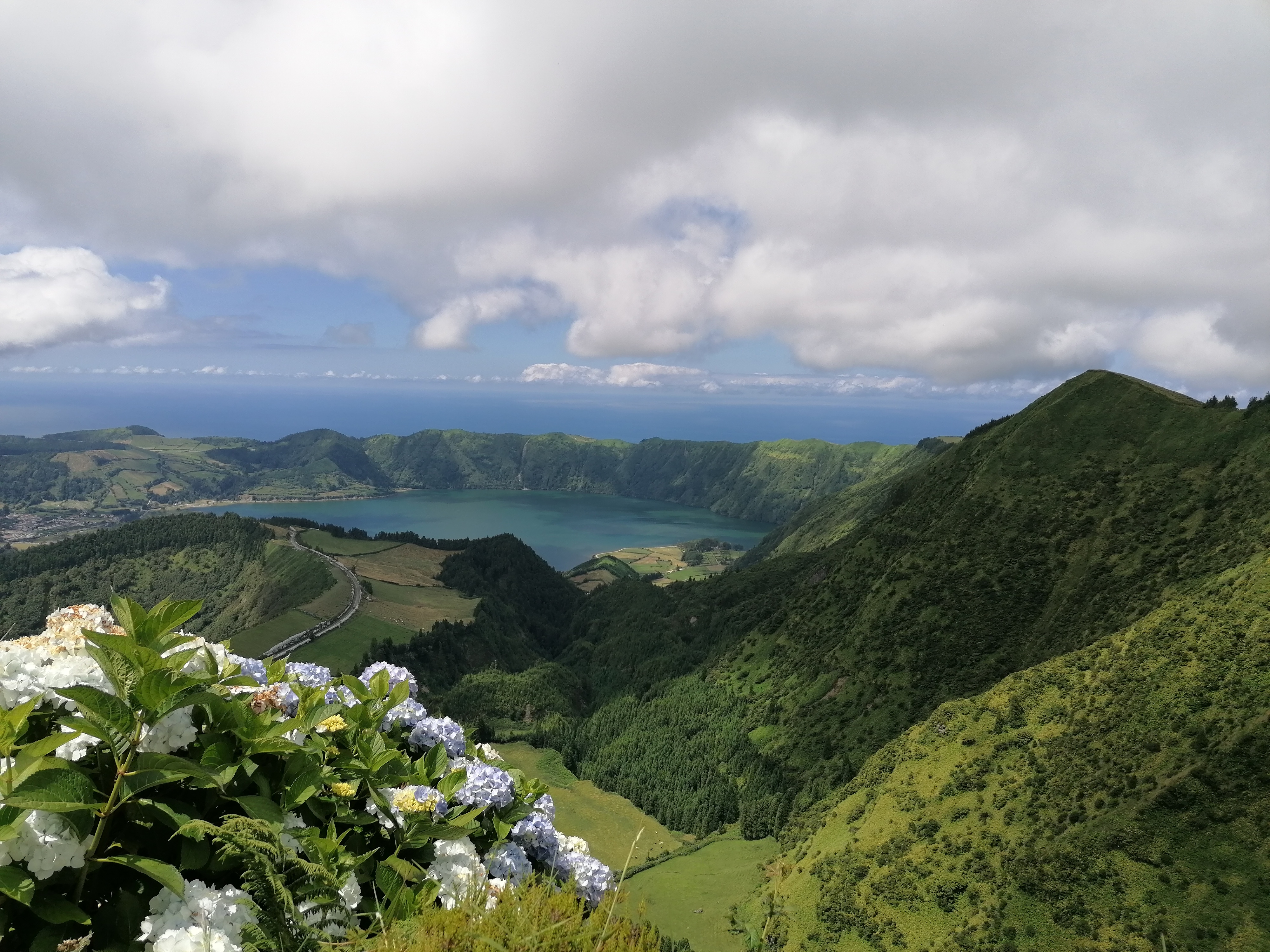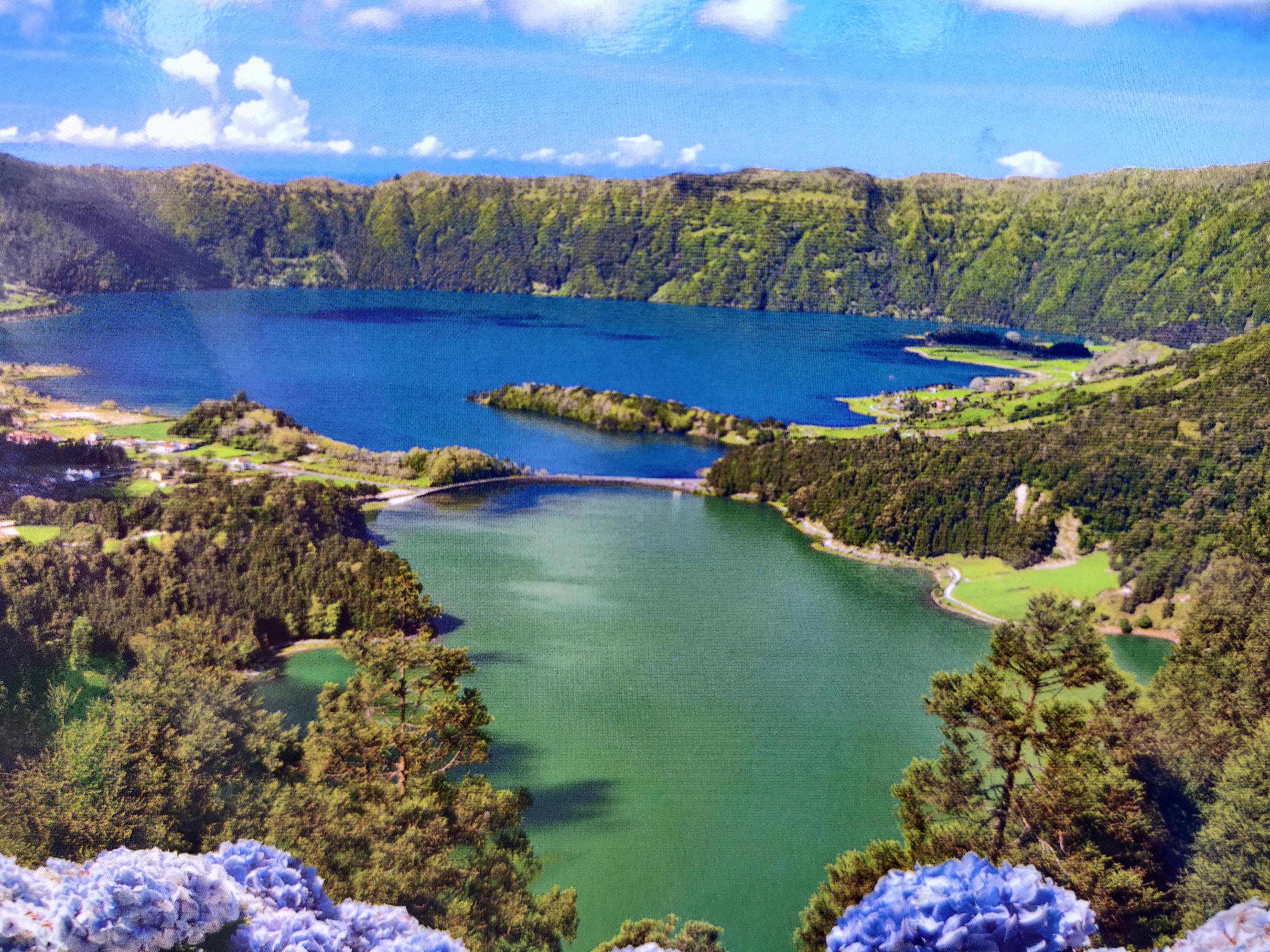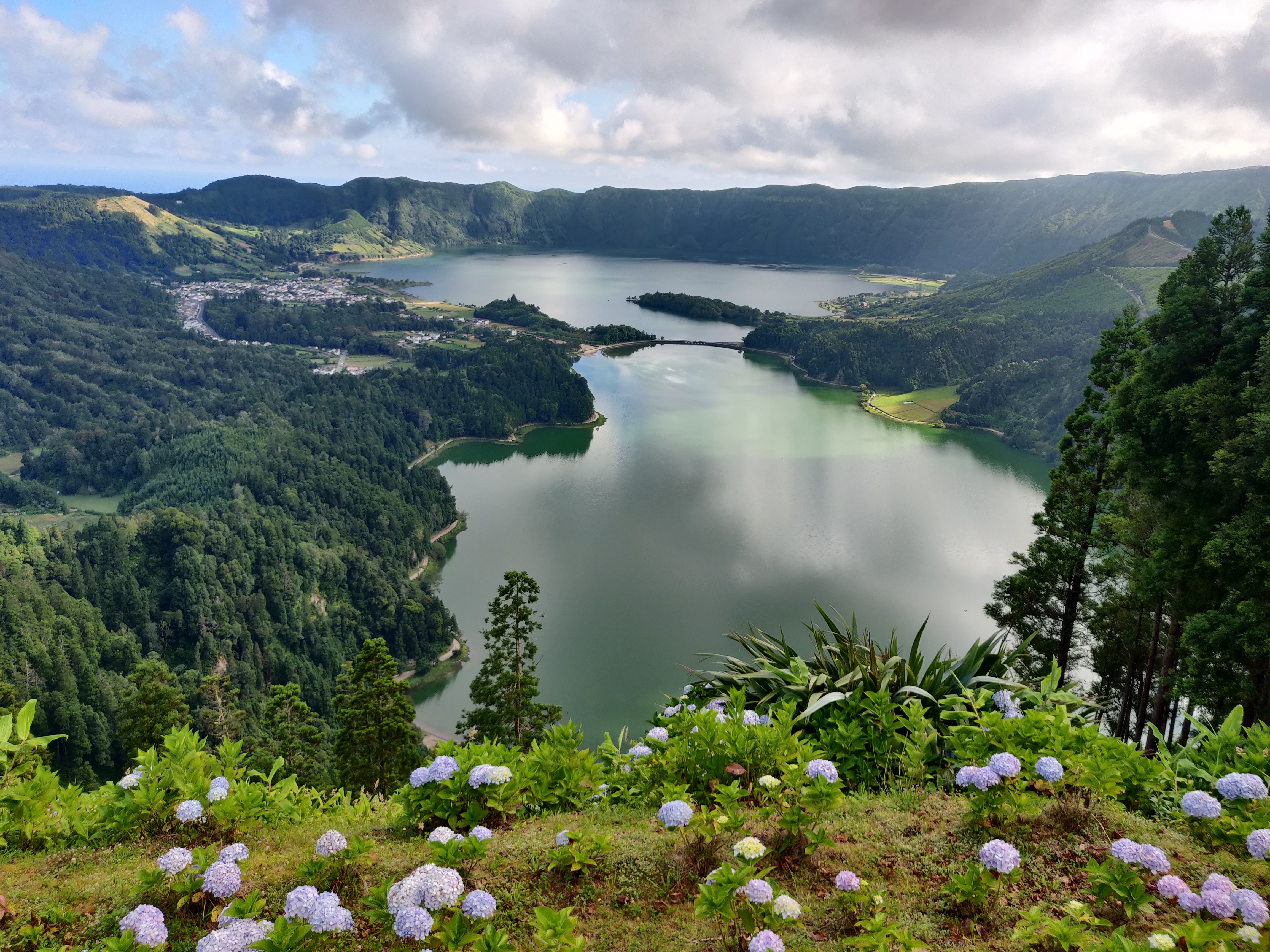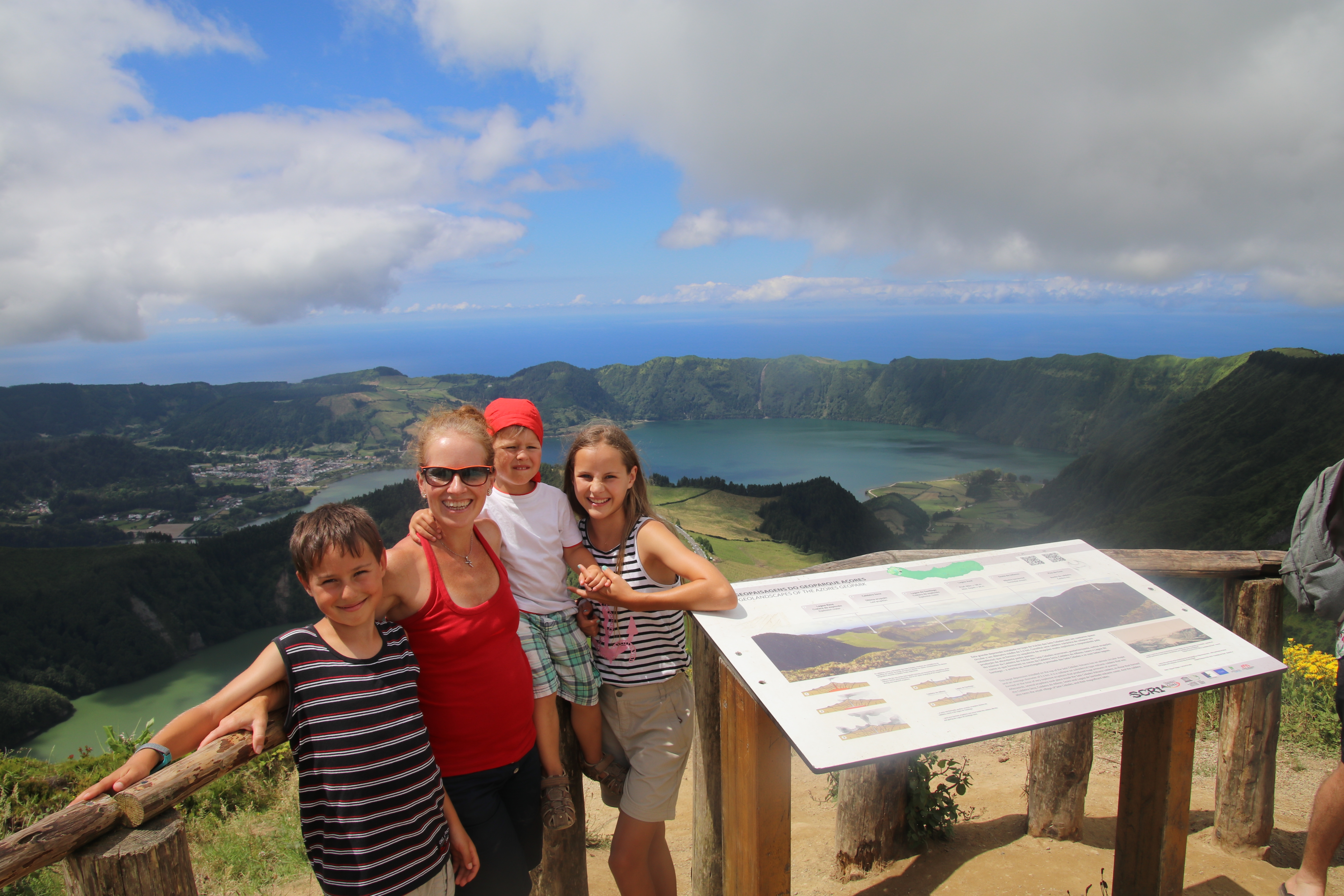 Die Caldera ist mit über 4 km² groß genug, um neben mehreren Seen und einigen Wiesen und Feldern auch ein kleines Städtchen zu beherbergen, welches vor allem vom Tourismus lebt. Die beiden größten Seen sind nach der Farbe ihres Wassers benannt - Lagoa Verde, der Grüne See und Lagoa Azul, der Blaue See. Bei wolkenfreiem Himmel wären die Farben ideal zu sehen.