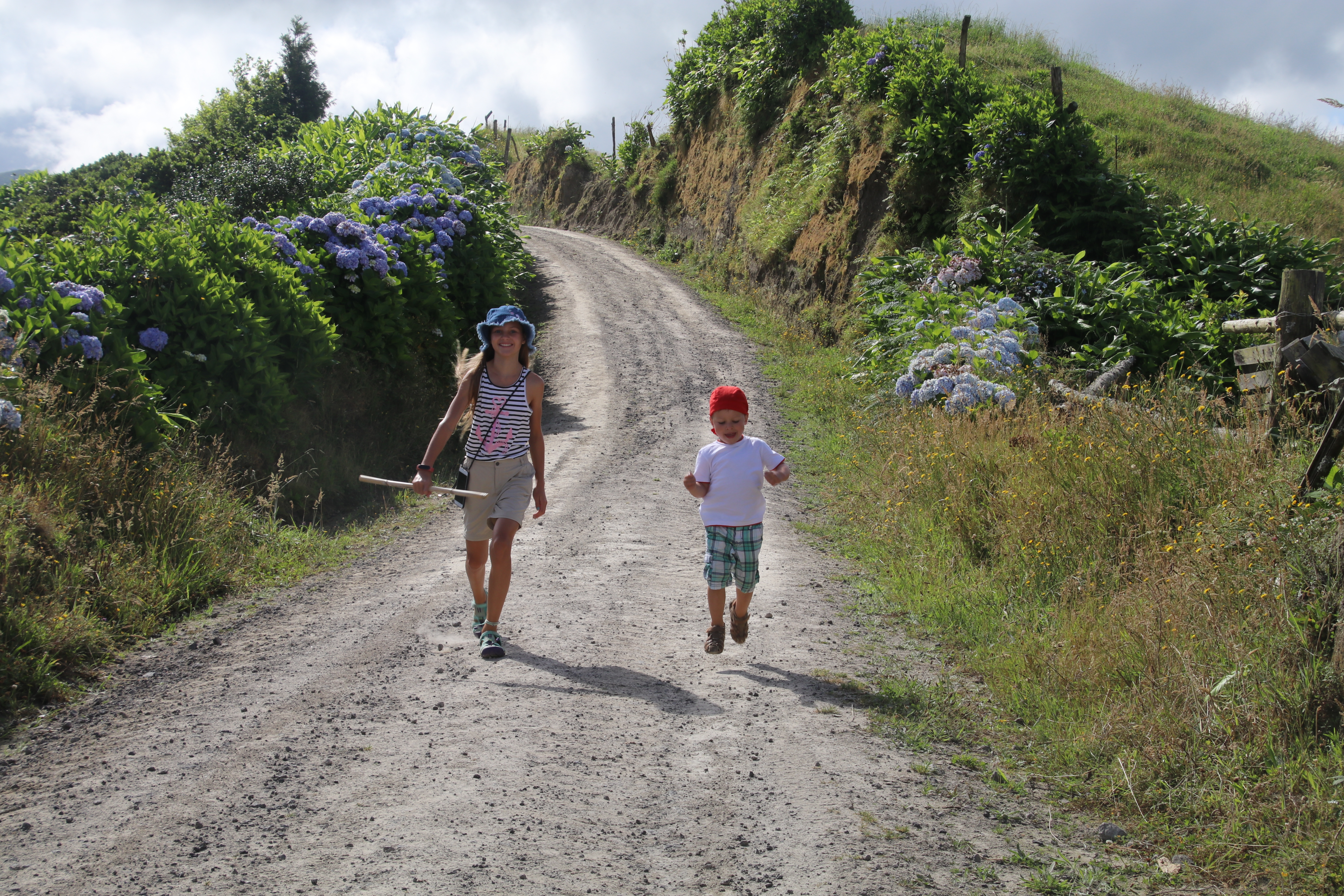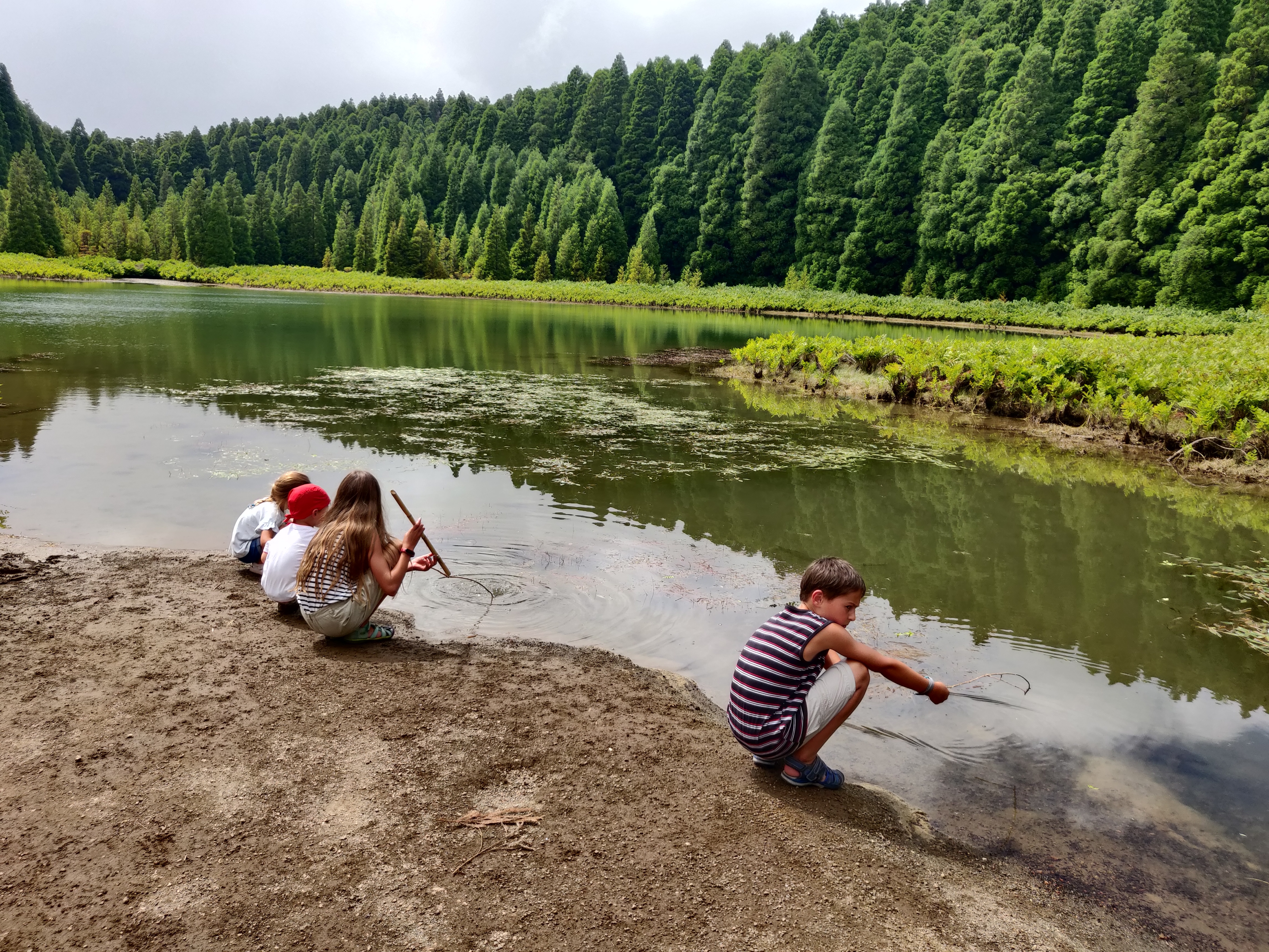 Der Rückweg führt uns am kleinen Lagoa Canario vorbei, wo die Kinder spontan eine Runde “angeln”.