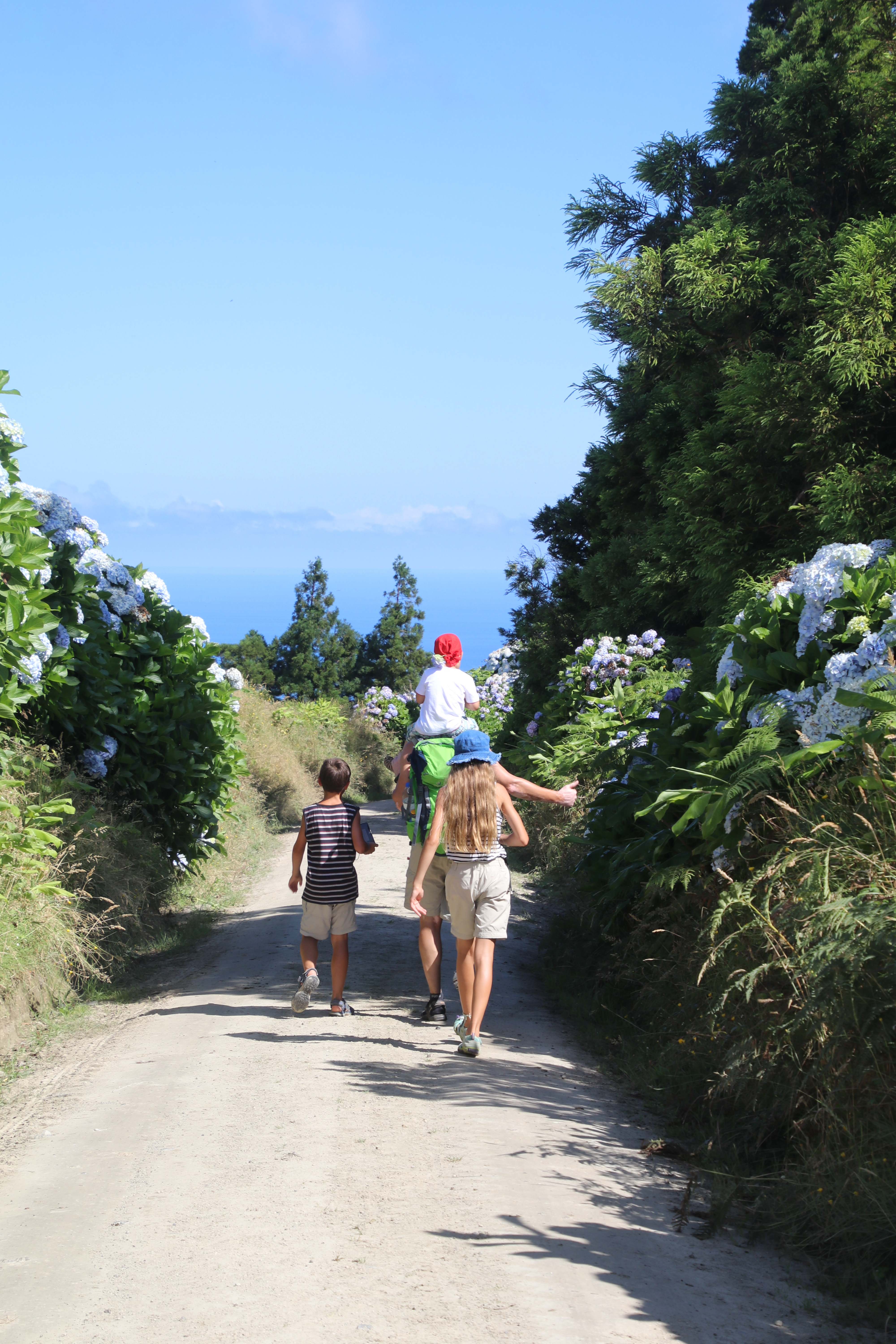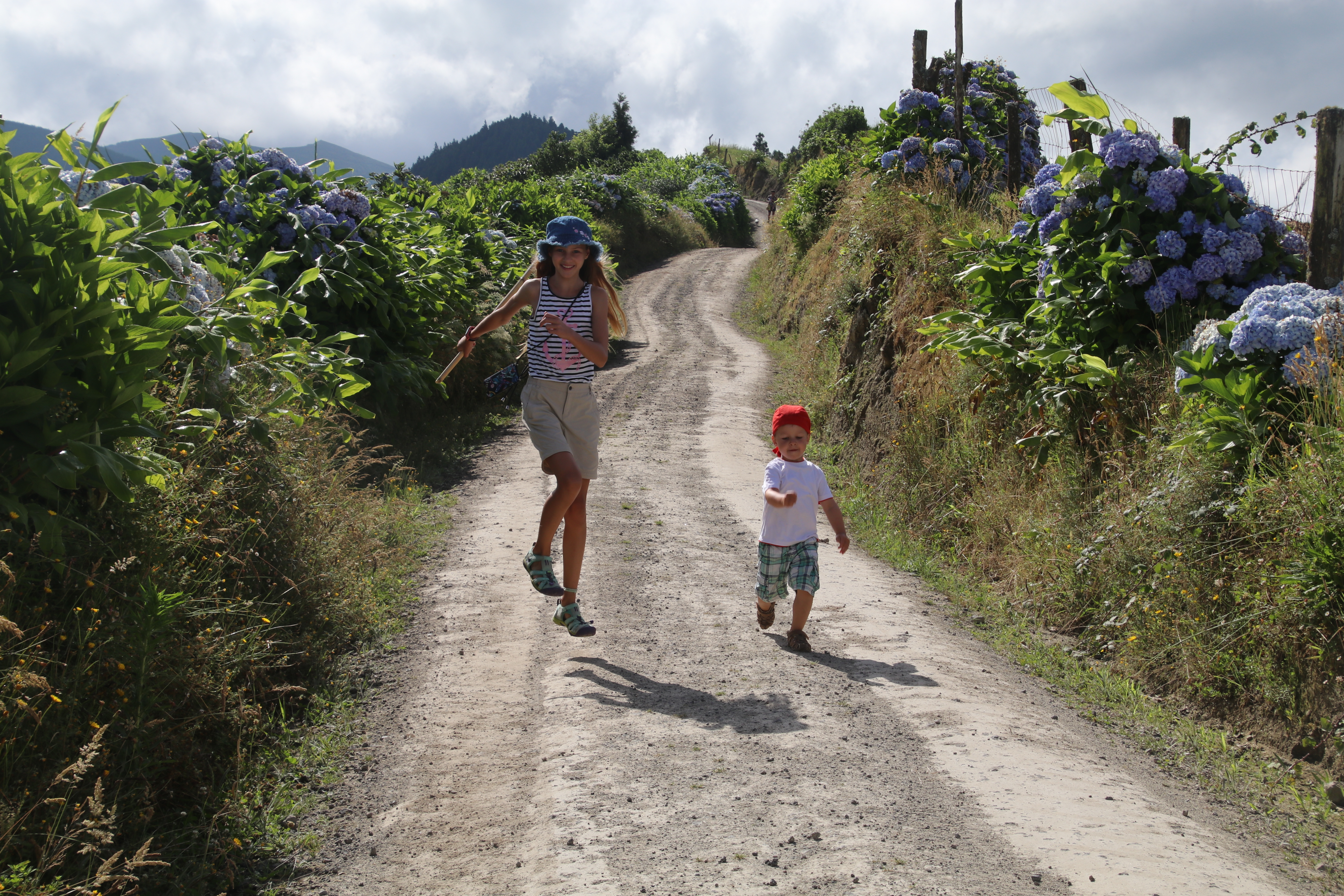 Nach knapp 6 Kilometern geht der Weg in eine Serpentinenstraße über, die am Kraterrand entlang noch einmal 4 Kilometer nach unten führt. An Kilometer 5 übergebe ich Anke den Rucksack und sie marschiert mit den Kindern weiter. Ich drehe um, jogge zum Auto zurück und fahre schonmal ins Tal.