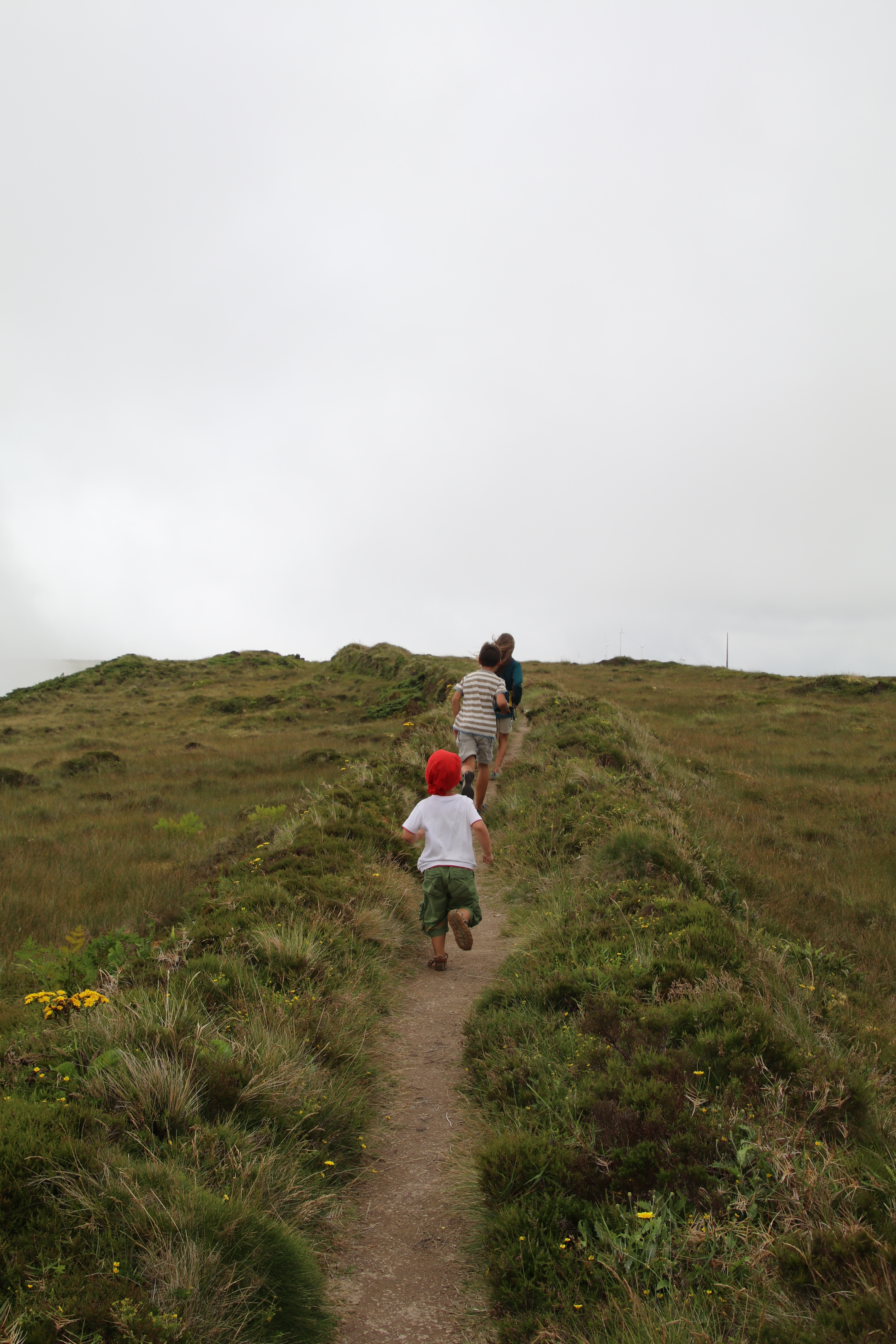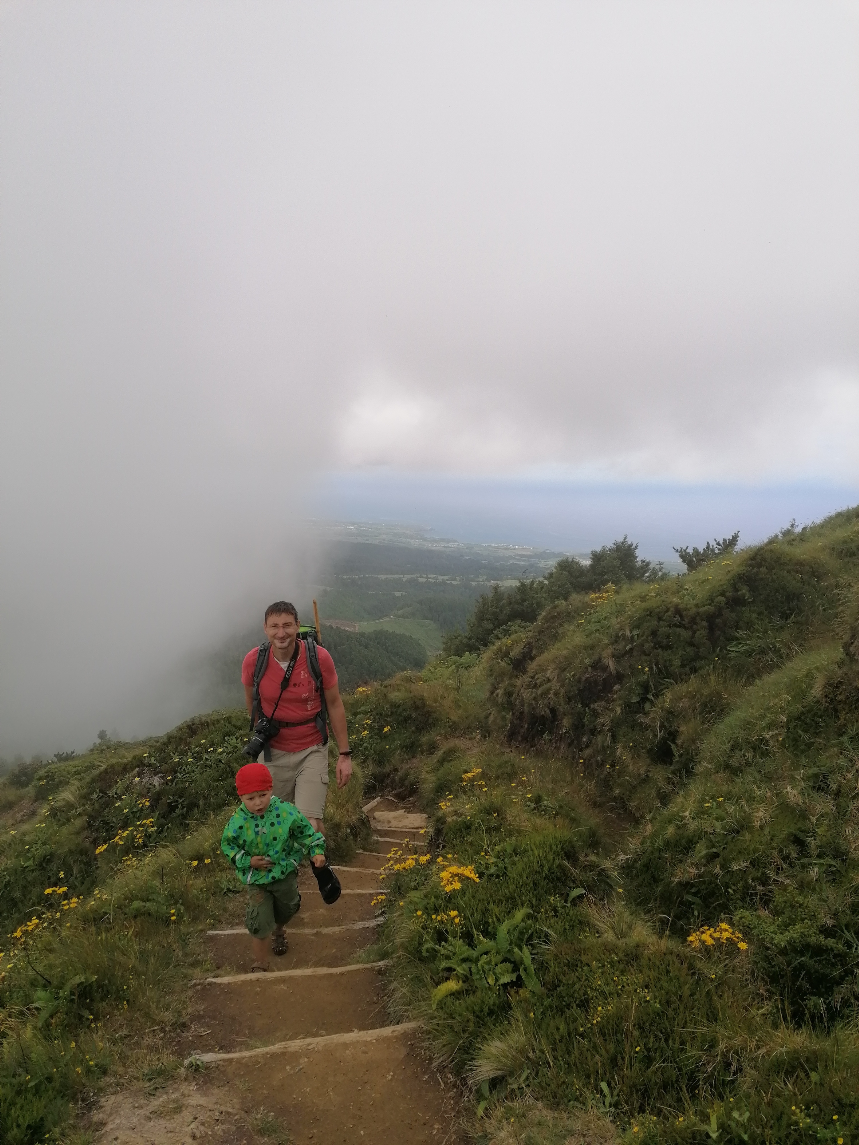 Oben angekommen, schwappen gerade die Wolken auf die Hochebene und wir stehen plötzlich im Nebel.