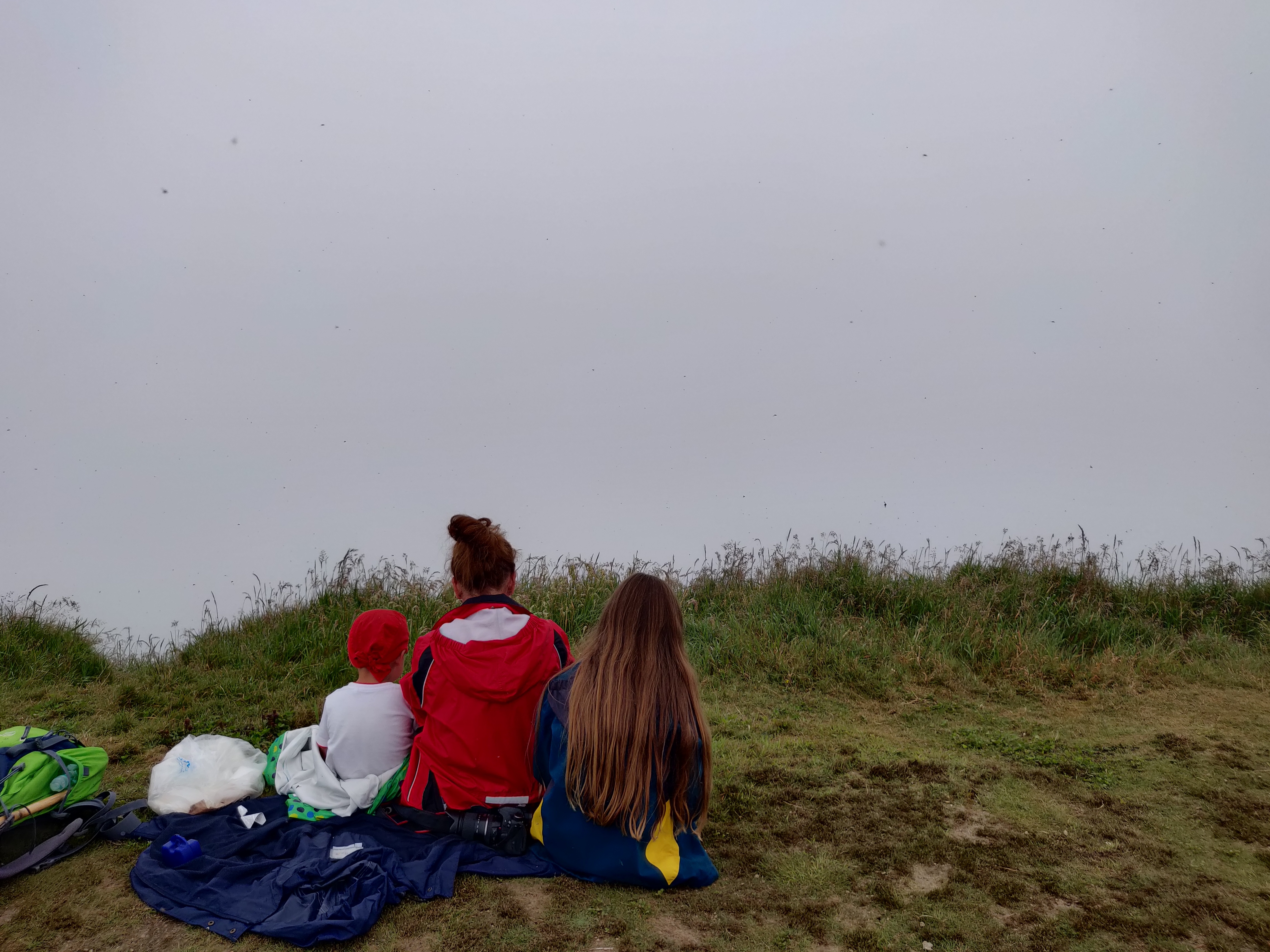 Wir haben unser Mittagessen in Form von belegten Brötchen mitgebracht, die wir hier oben essen. Dabei werden wir von unzähligen Wildbienen, Schmetterlingen und etlichen anderen Insekten umschwirrt.