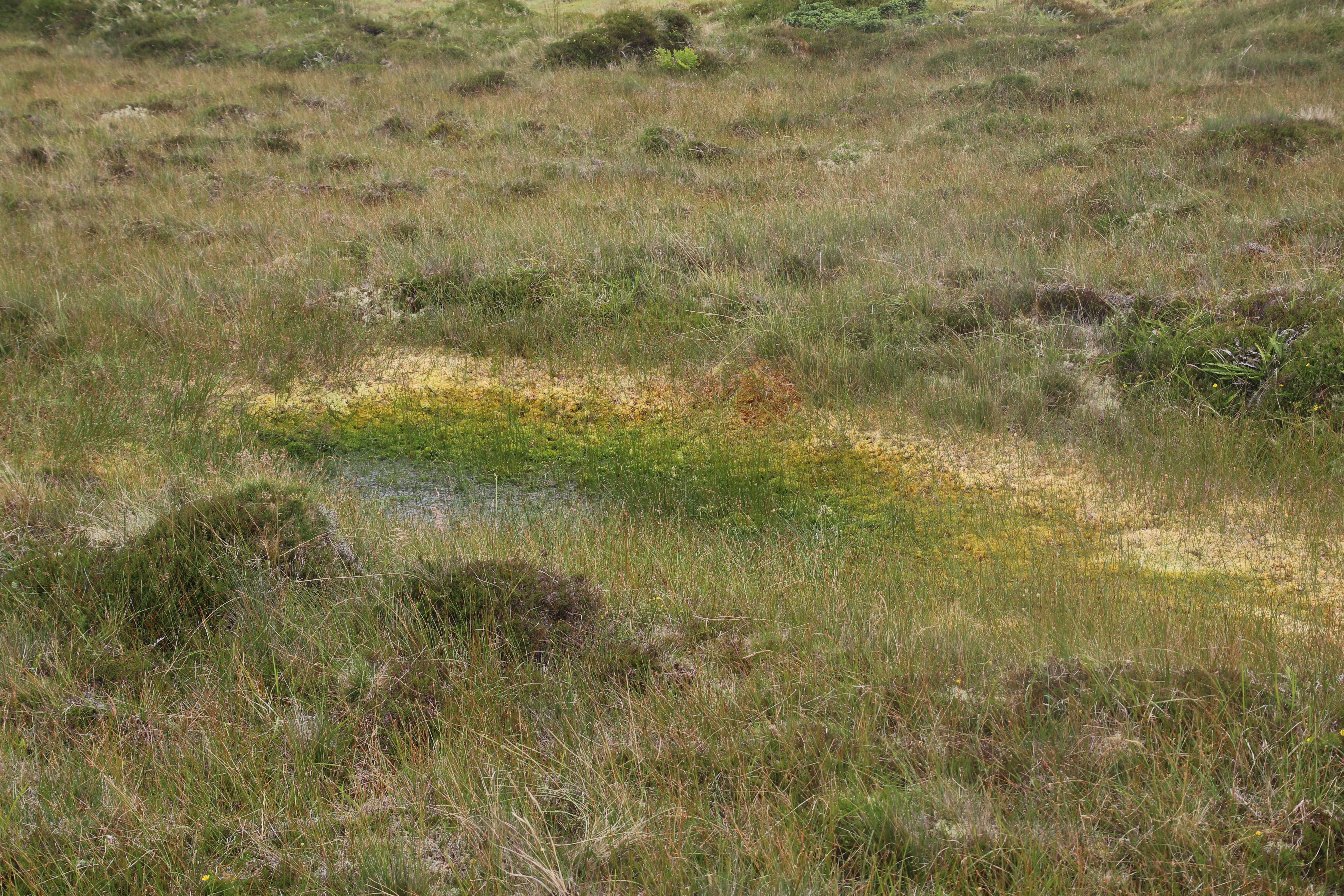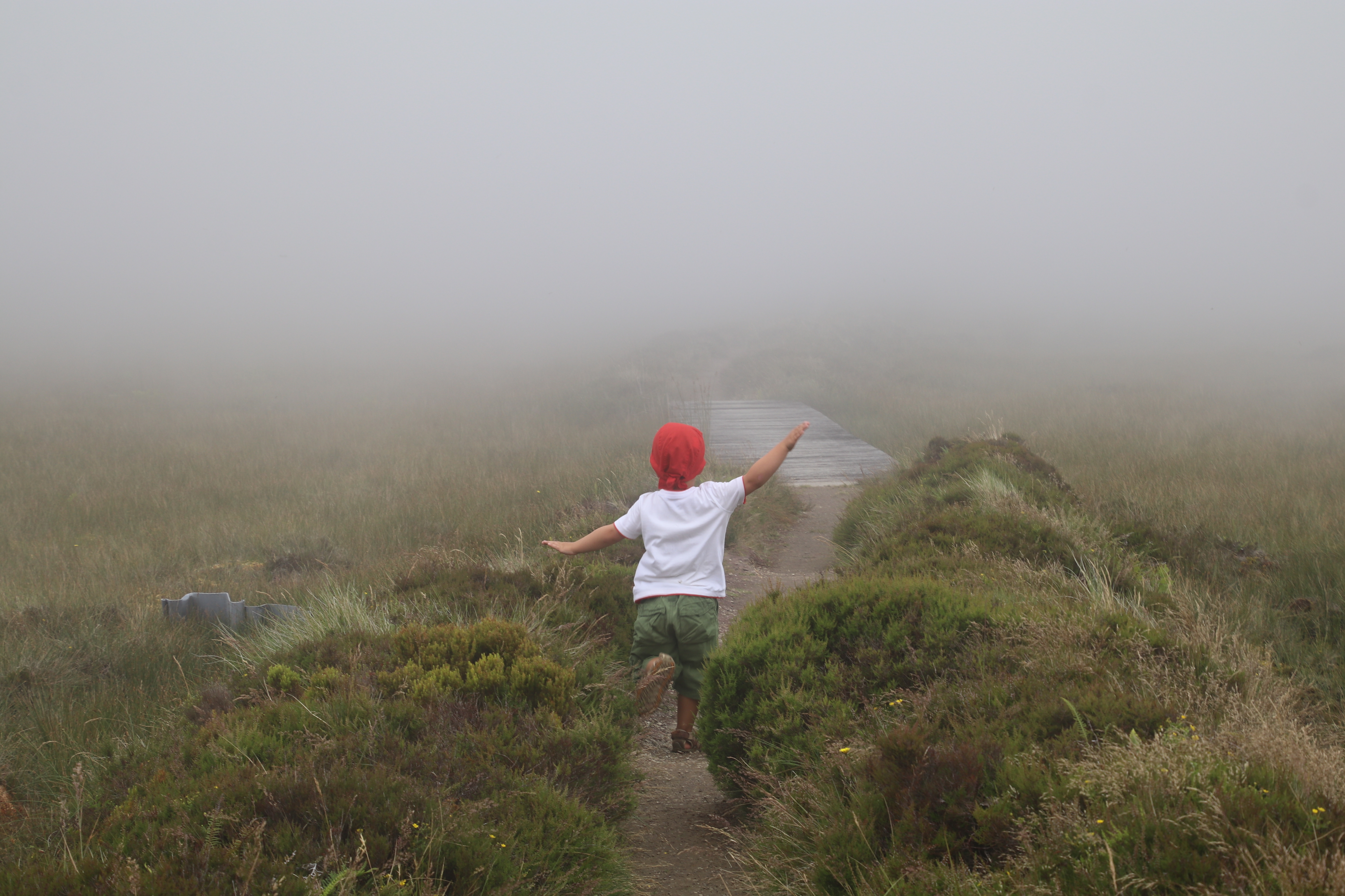 Der Wanderweg beginnt mit einem Pfad quer durch ein Hochmoor. Selbst ohne Nebel sollte man diesen nicht unbedingt verlassen. Rechts und links von uns platscht es, wenn wir Frösche aufscheuchen. Sehen können wir aber keine.
