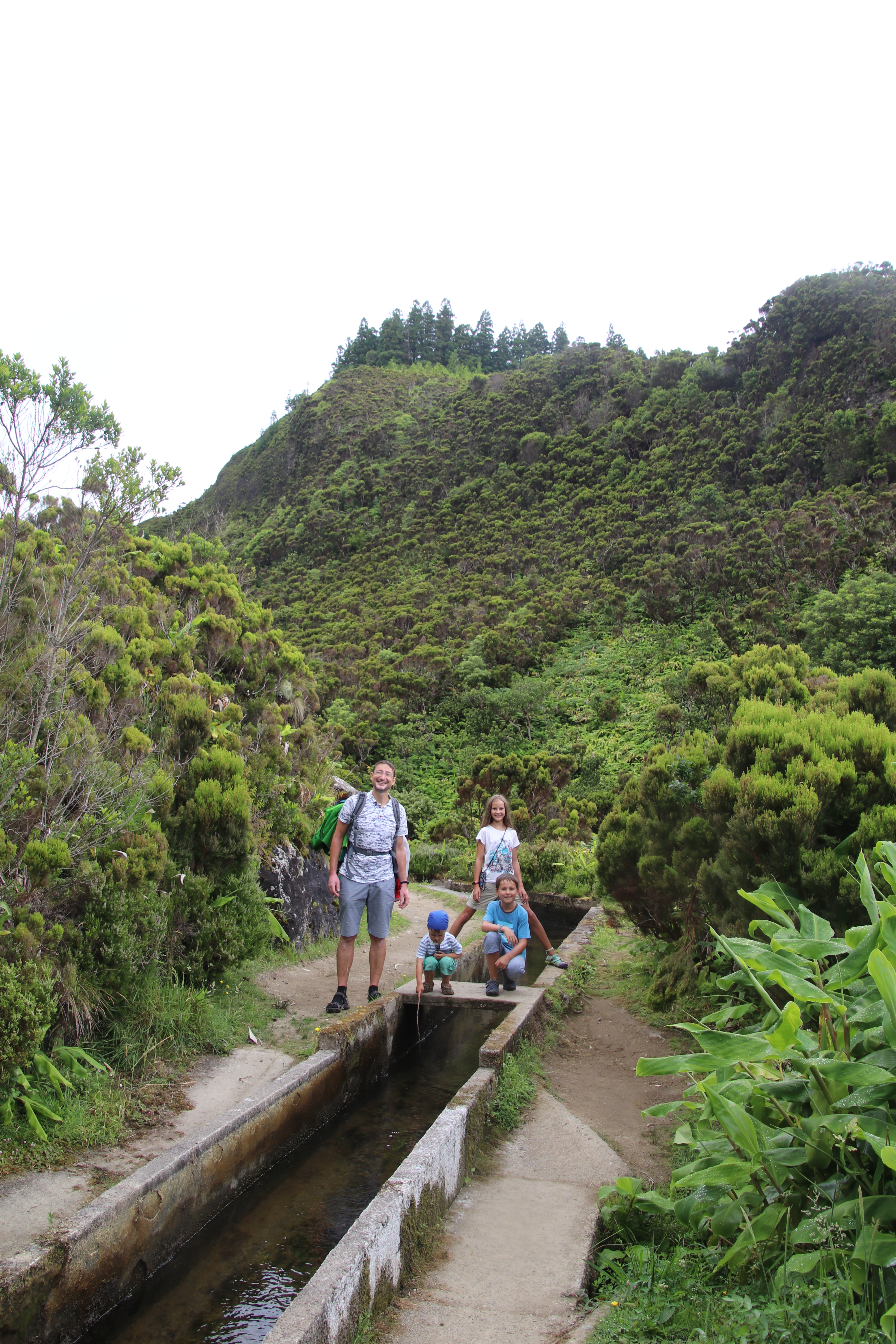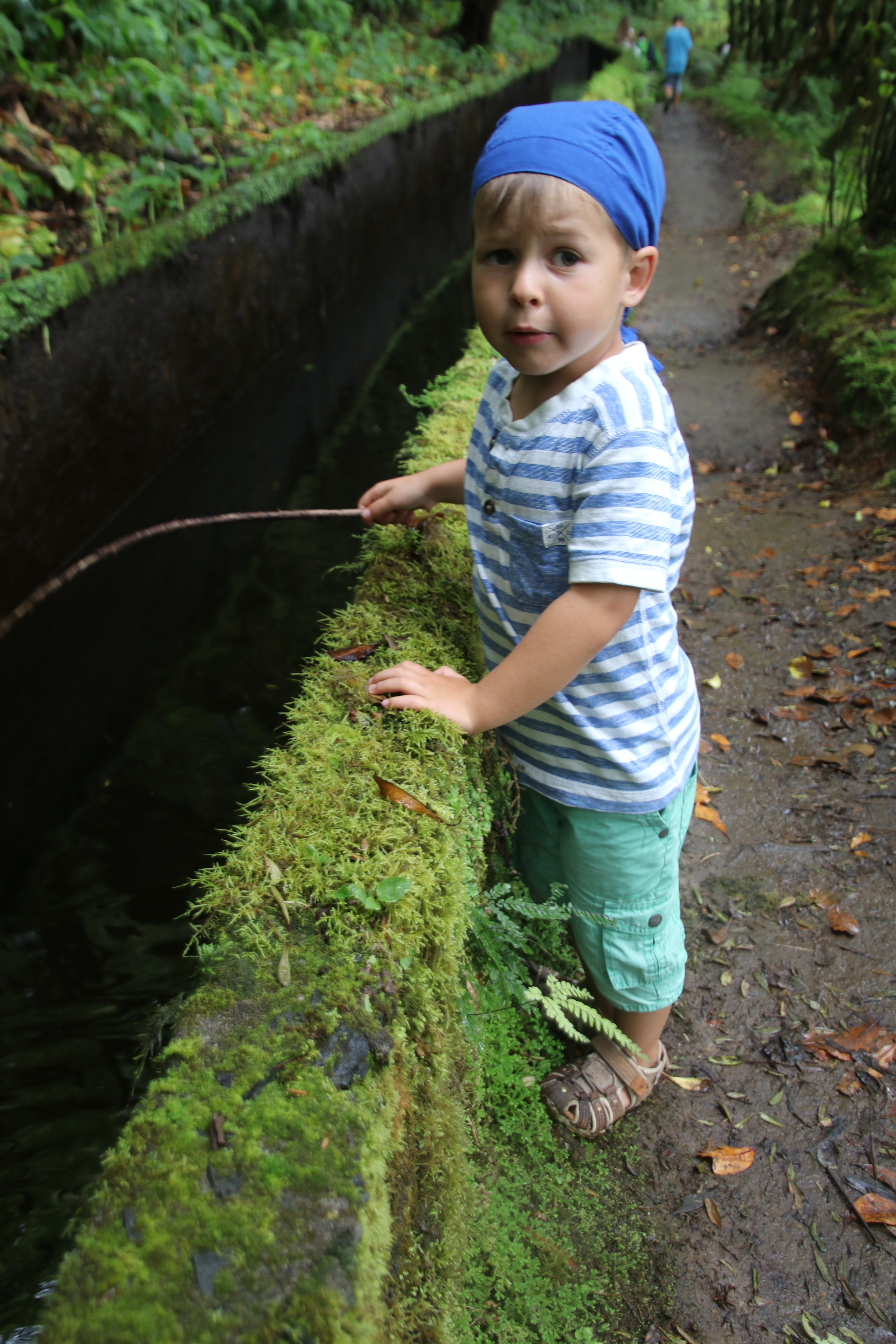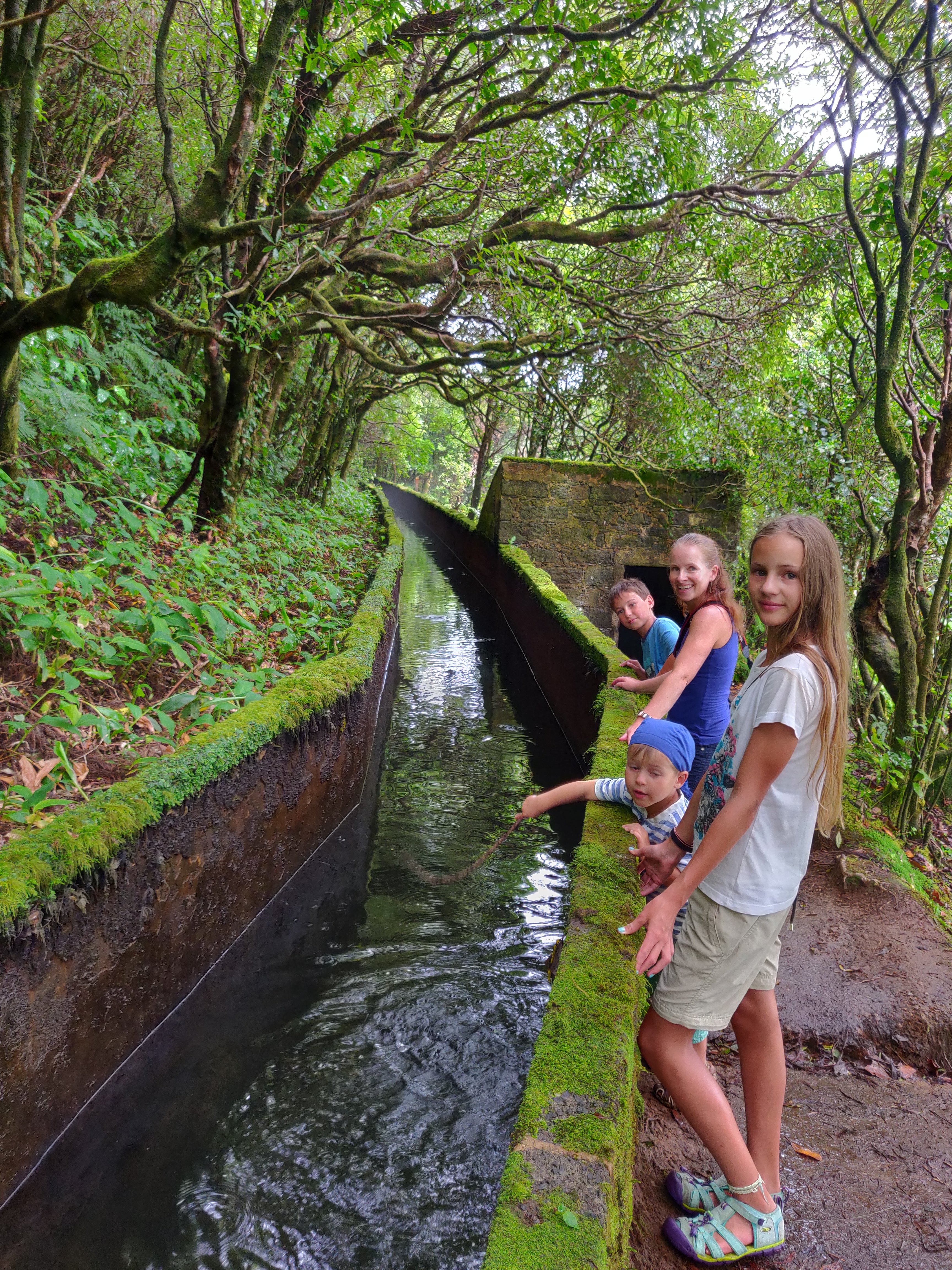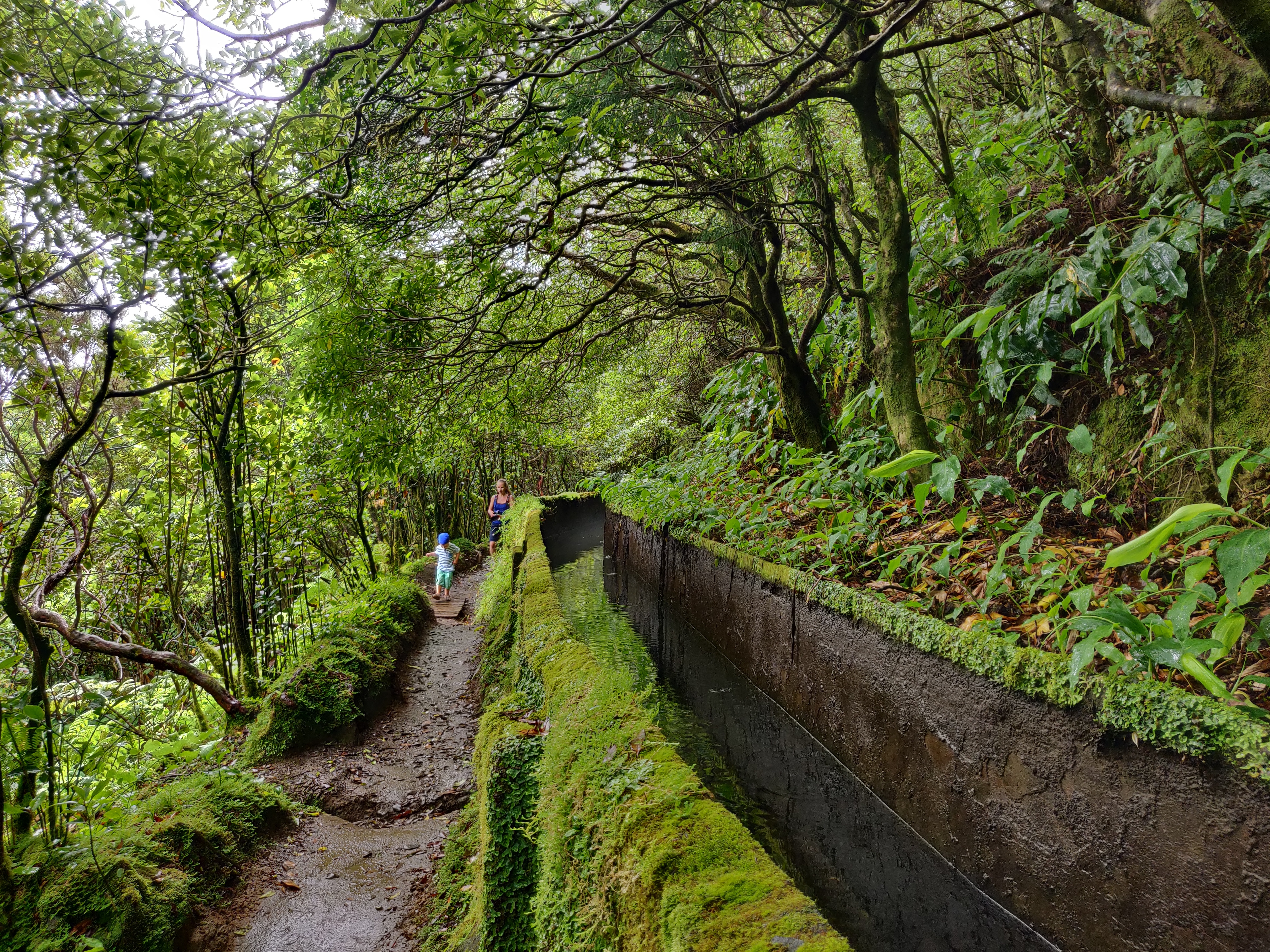Als wir aus dem Sicheltannen-Wald heraus kommen, hört es auf zu regnen und sogar die Sonne lässt sich kurz blicken. Ab hier verläuft die Route entlang einer Levada. Das sind offene Wasserkanäle mit geringem Gefälle, welche entlang der Berge angelegt wurden, um Regenwasser für die Landwirtschaft zu sammeln und ins Tal zu leiten.