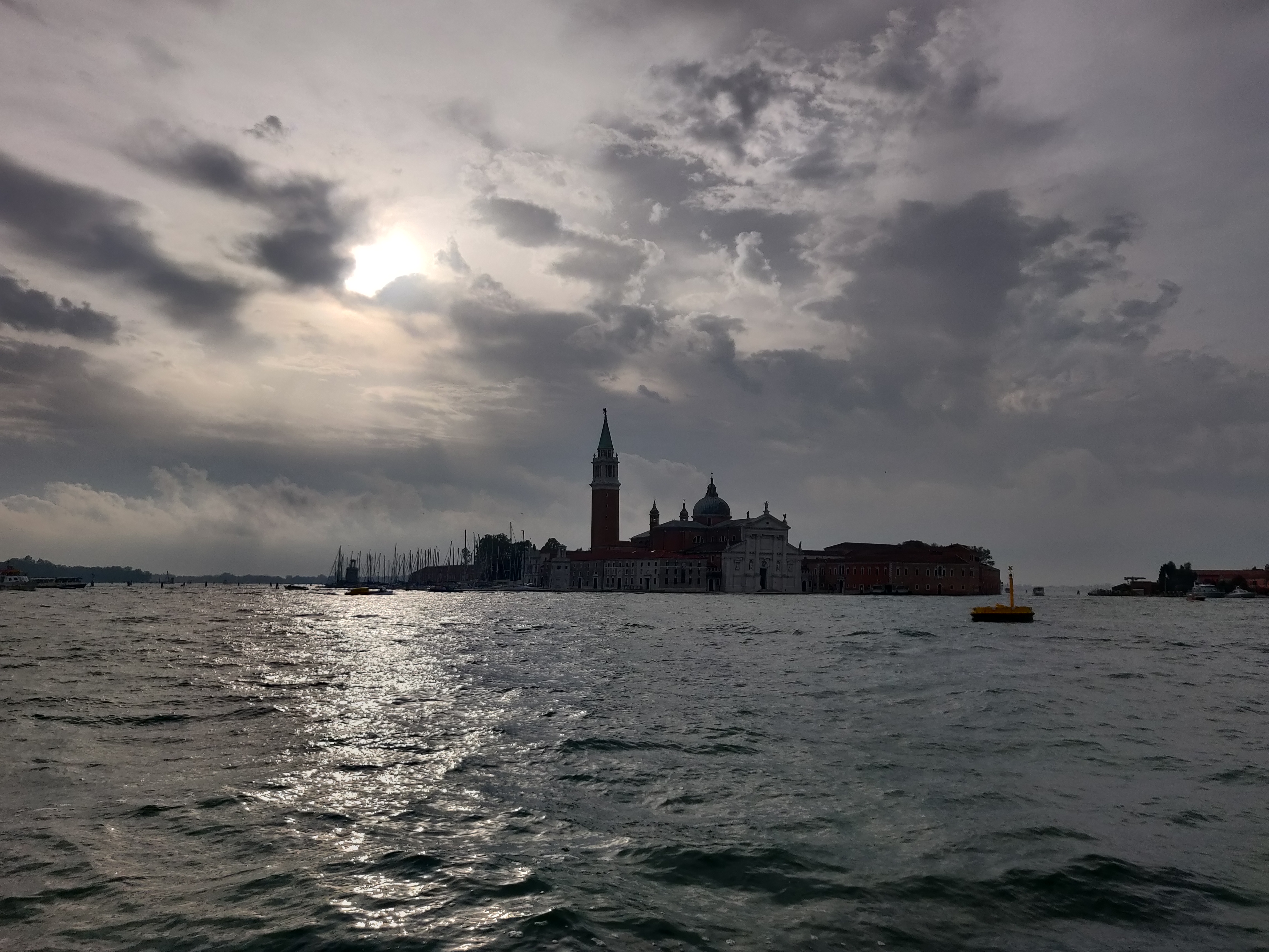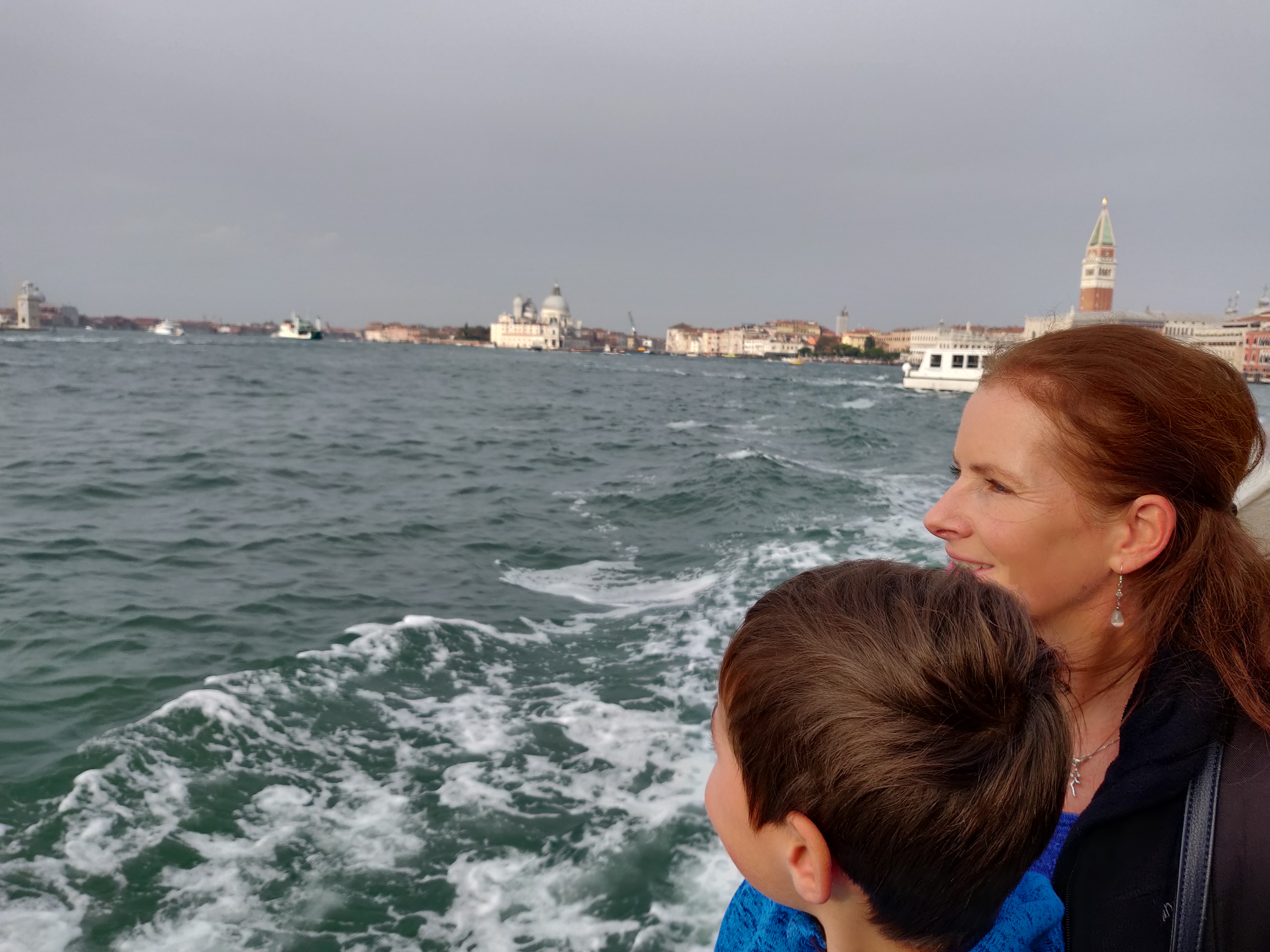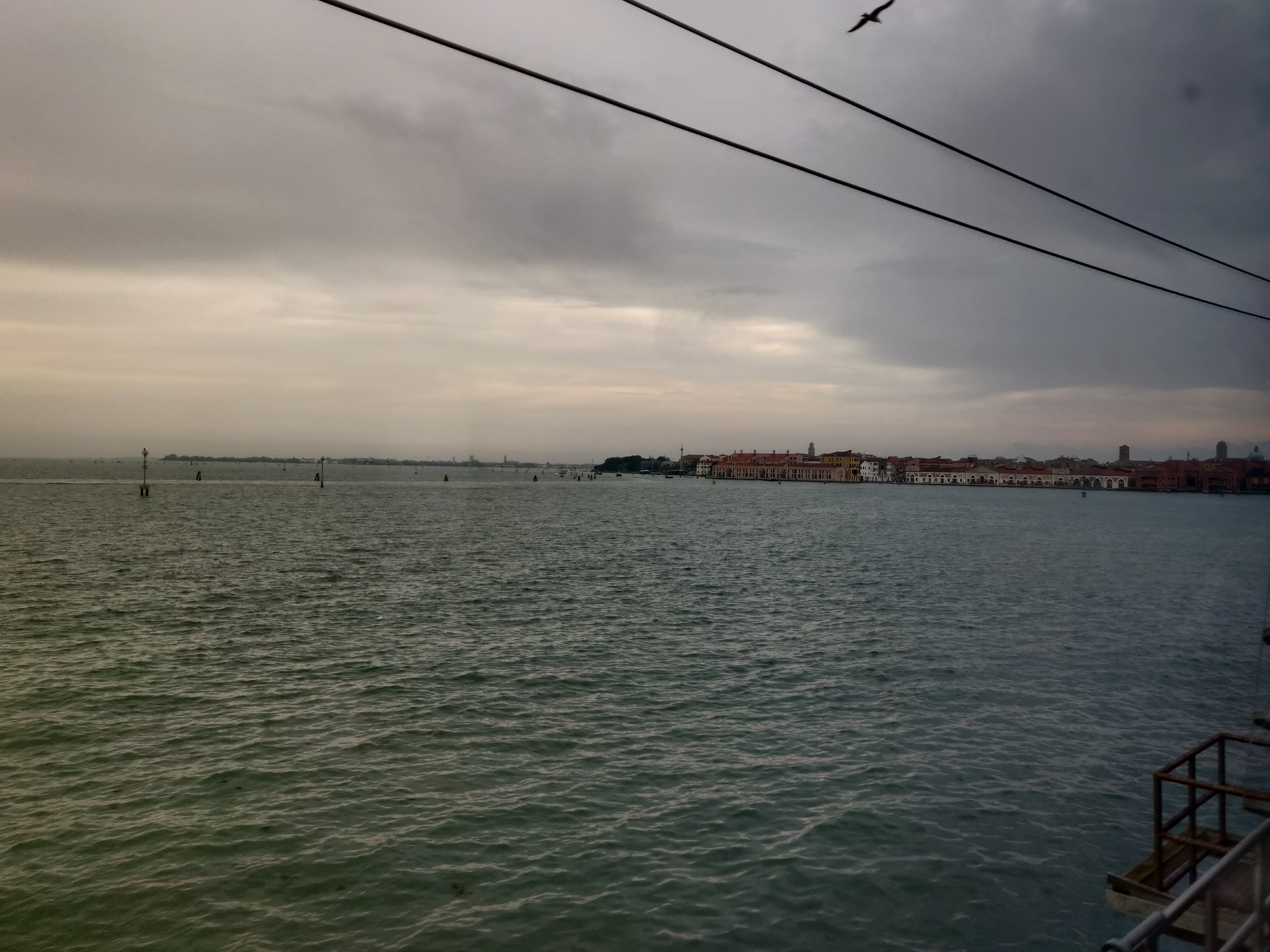 Als wir fertig gegessen haben und zum Fenster herausschauen, blicken wir plötzlich auf die große Lagune. Am Ufer ist schon Venedig zu sehen.