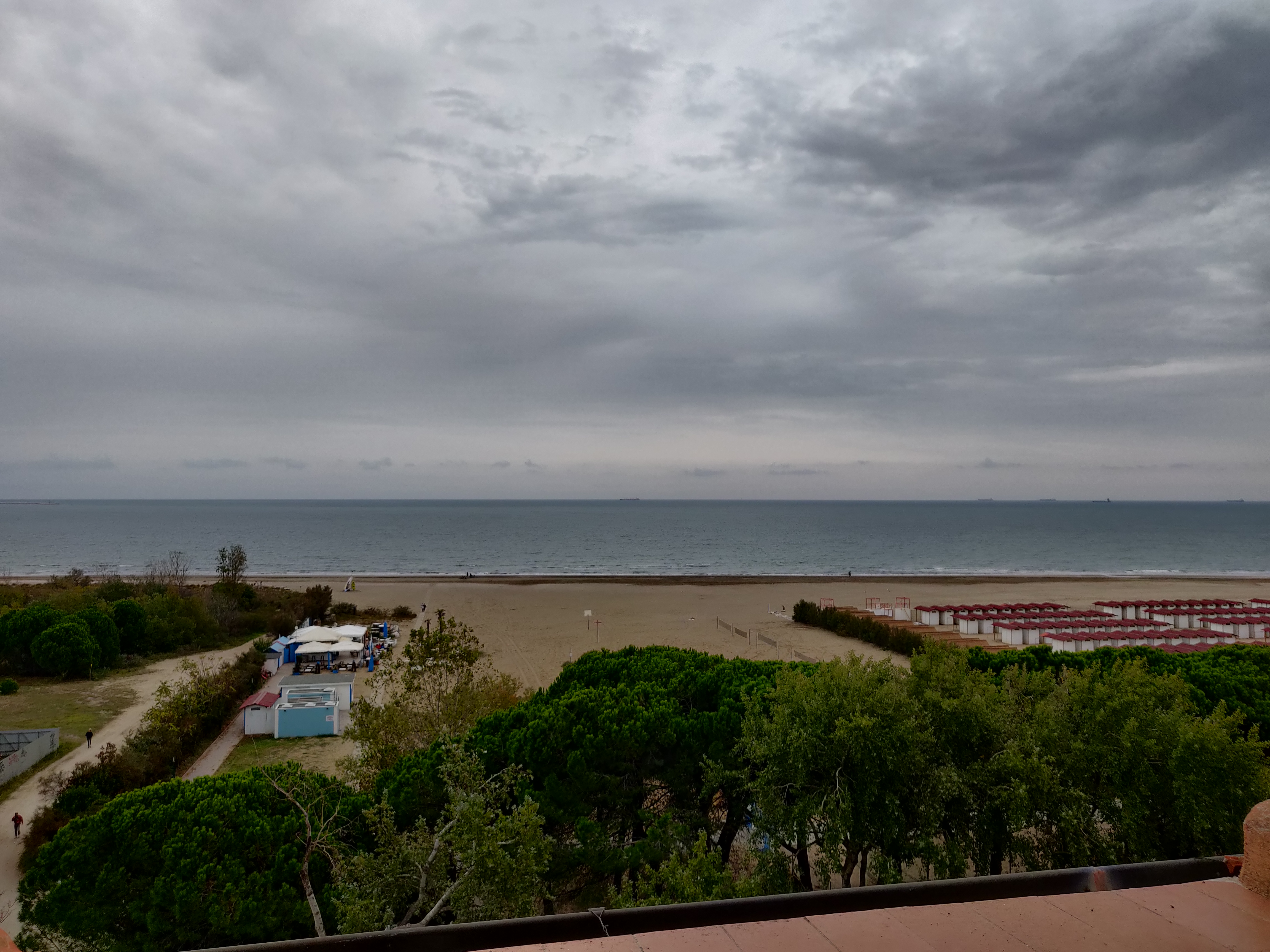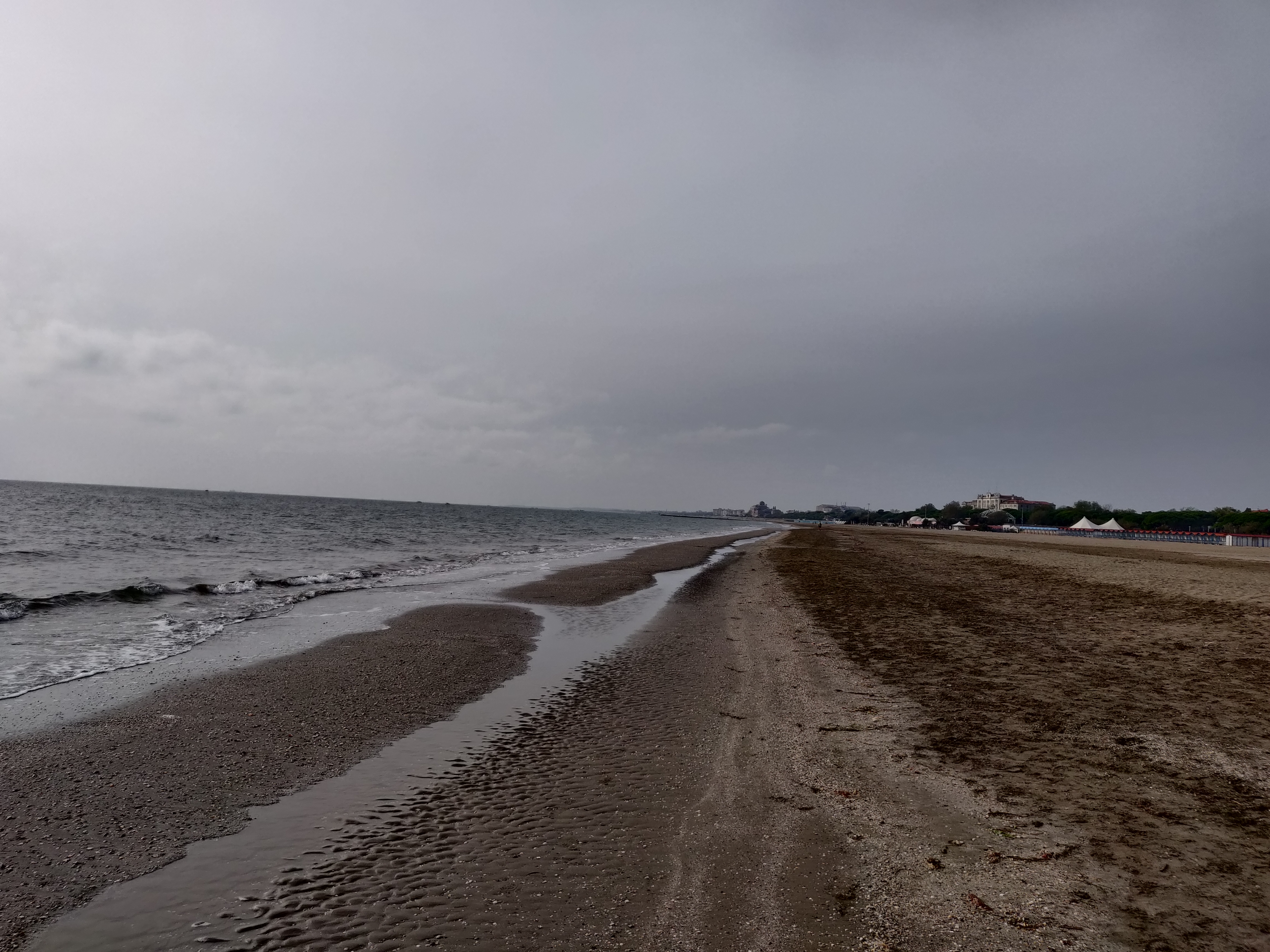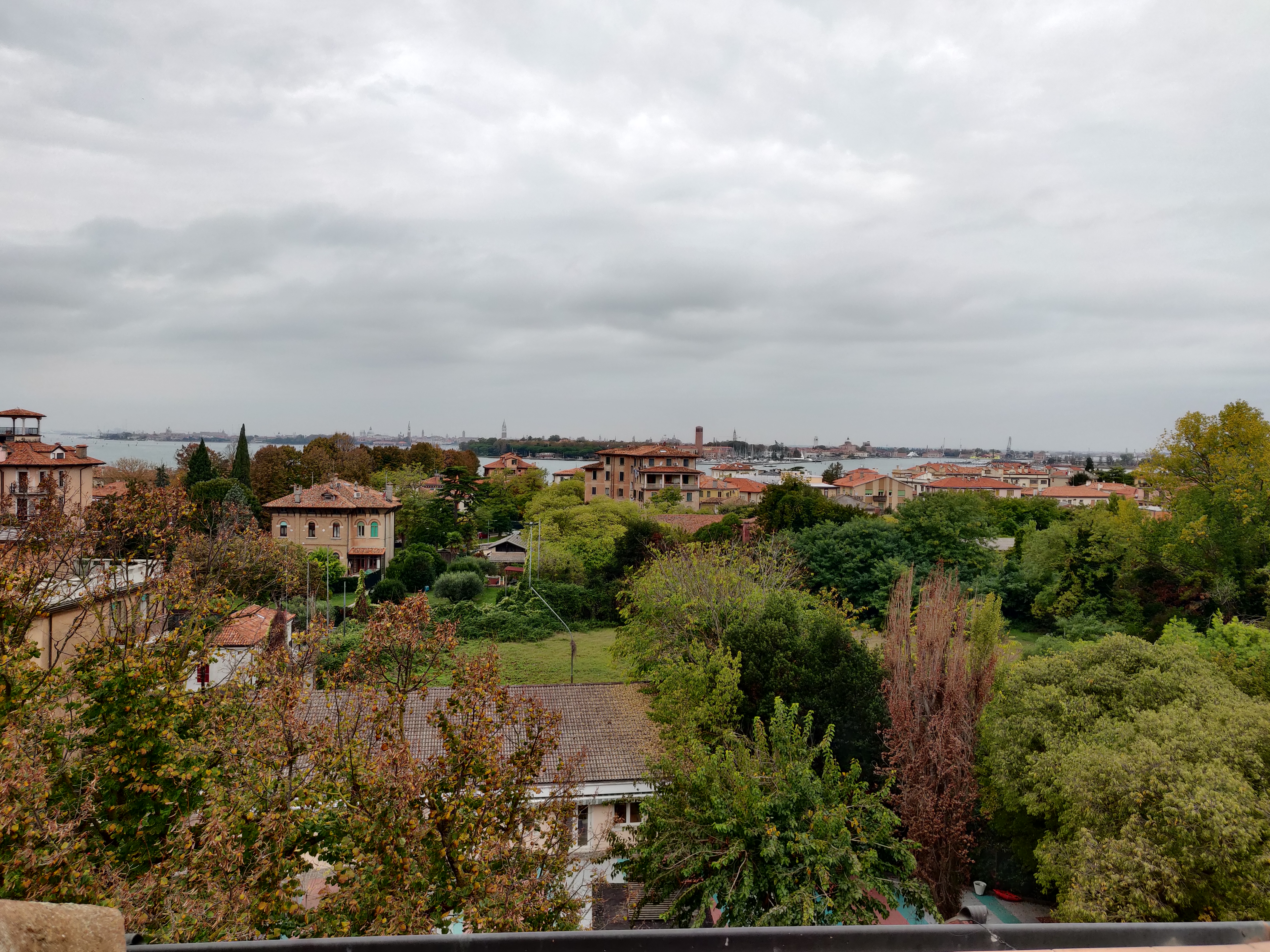 Als wir fertig gegessen haben und zum Fenster herausschauen, blicken wir plötzlich auf die große Lagune. Am Ufer ist schon Venedig zu sehen.