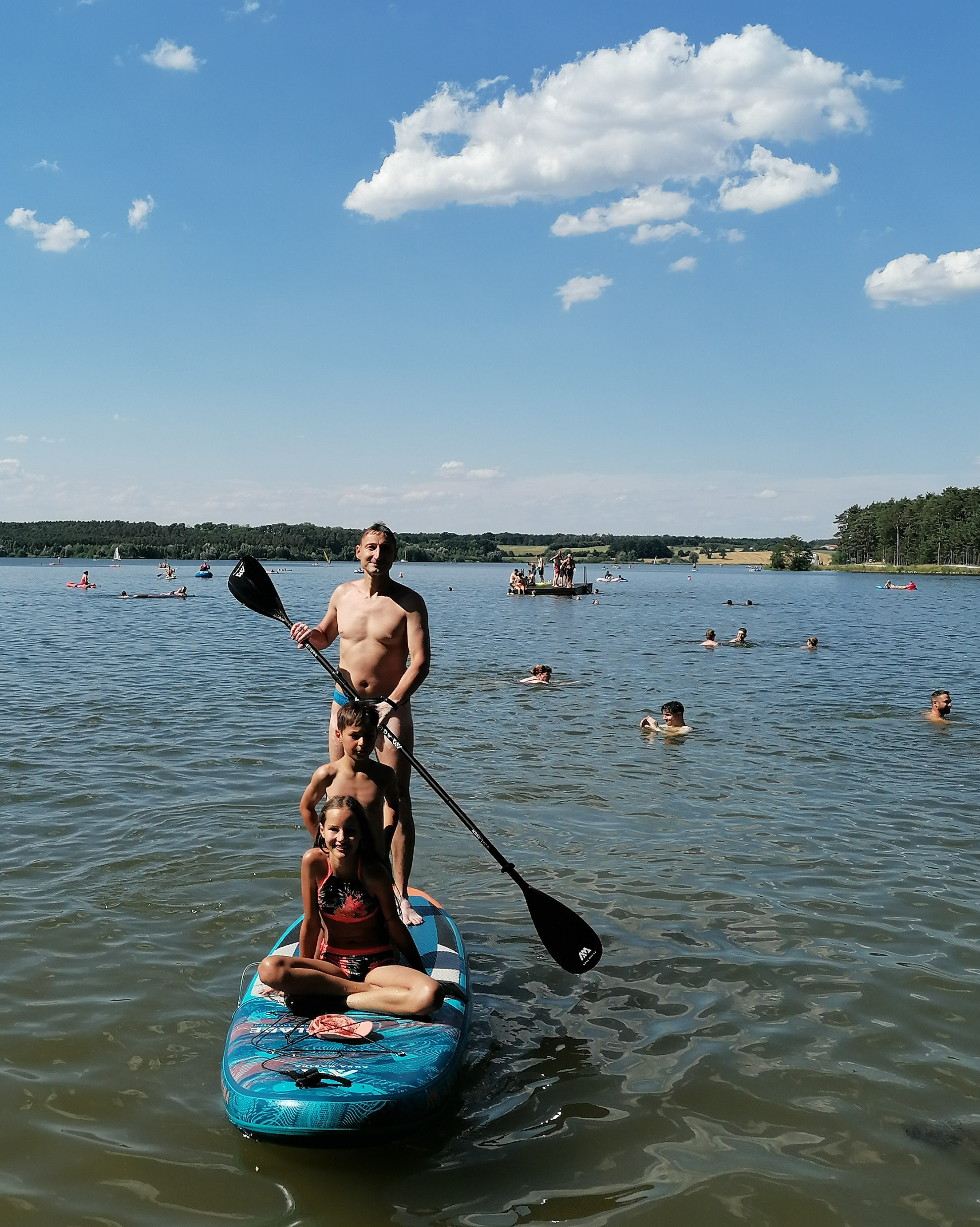 Nach dem Frühstück geht es direkt an den Strand. Mattis testet gleich seine neue Fähigkeit, er kann jetzt schwimmen. Wir schwimmen mehrfach zusammen raus zur Badeinsel. Nach dem dritten Mal traut er sich, von dieser ins Wasser zu springen.