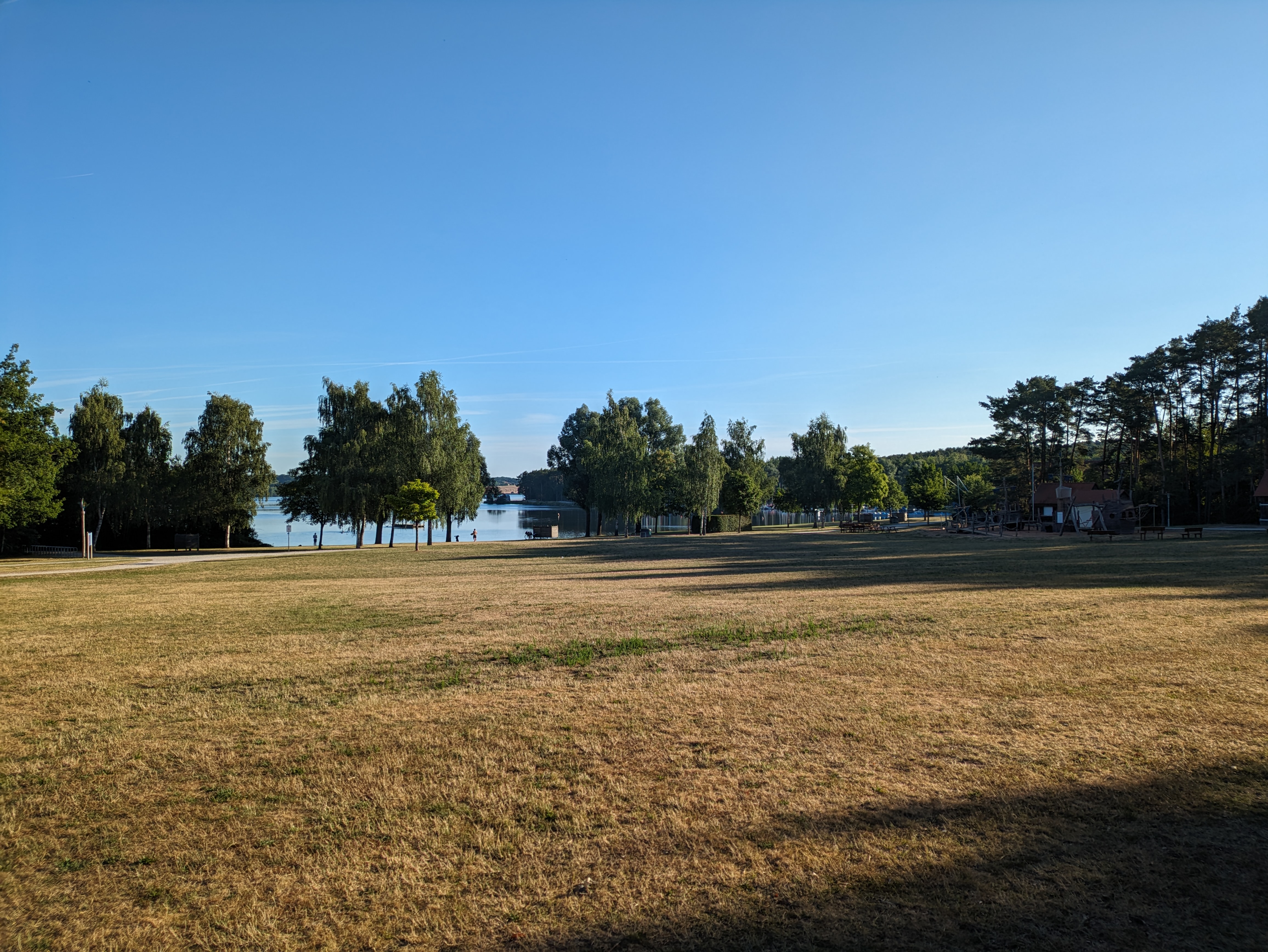 Heute früh weckt uns strahlender Sonnenschein. Kein Wunder, heute soll einer der heißesten Tages des Jahres mit Temperaturen über 36 Grad werden. Wir parken noch kurz um (gestern Abend haben wir hier nichts mehr gesehen). Um diese Zeit sind noch Stellplätze direkt an der Strandwiese zu haben.