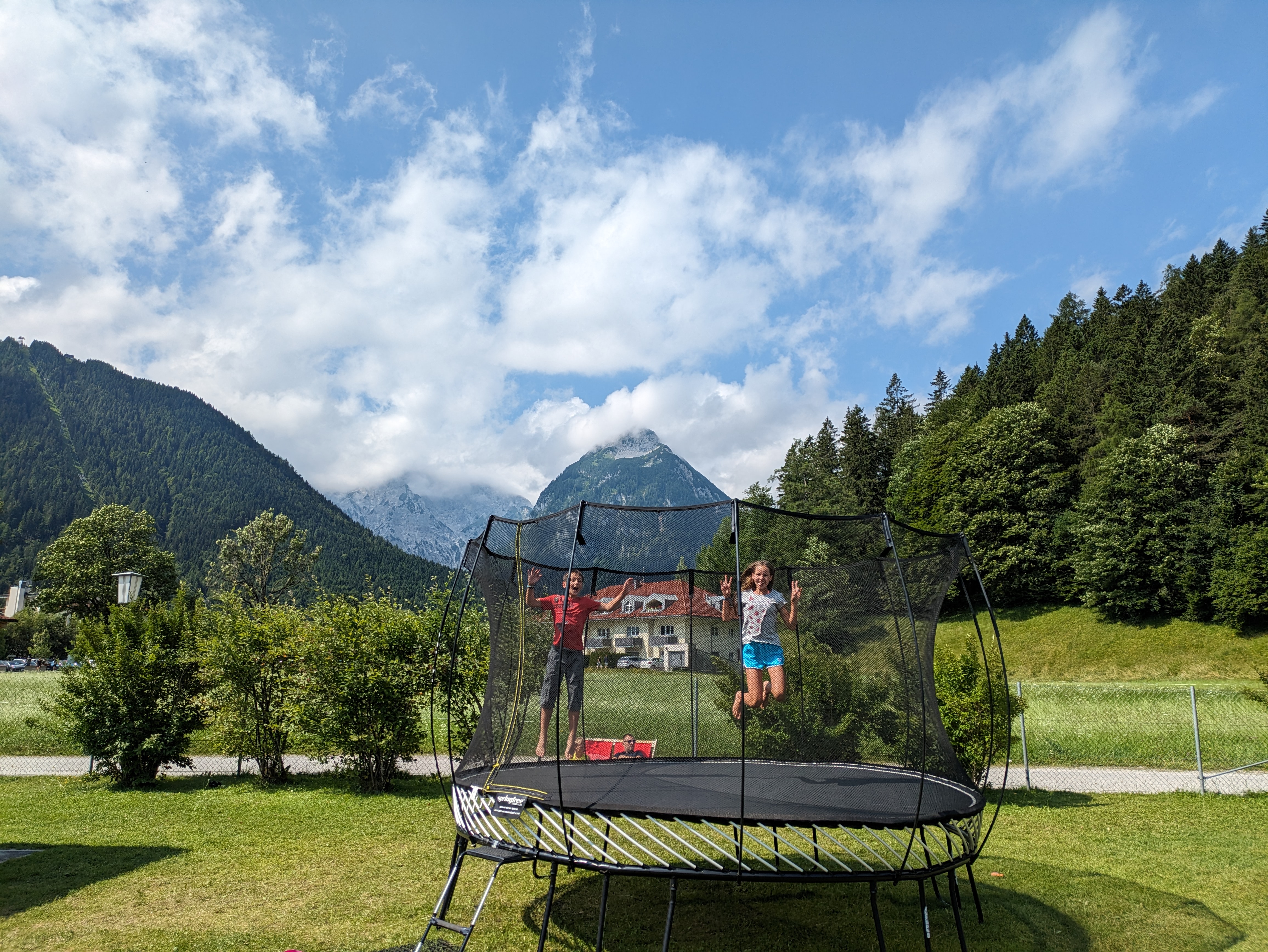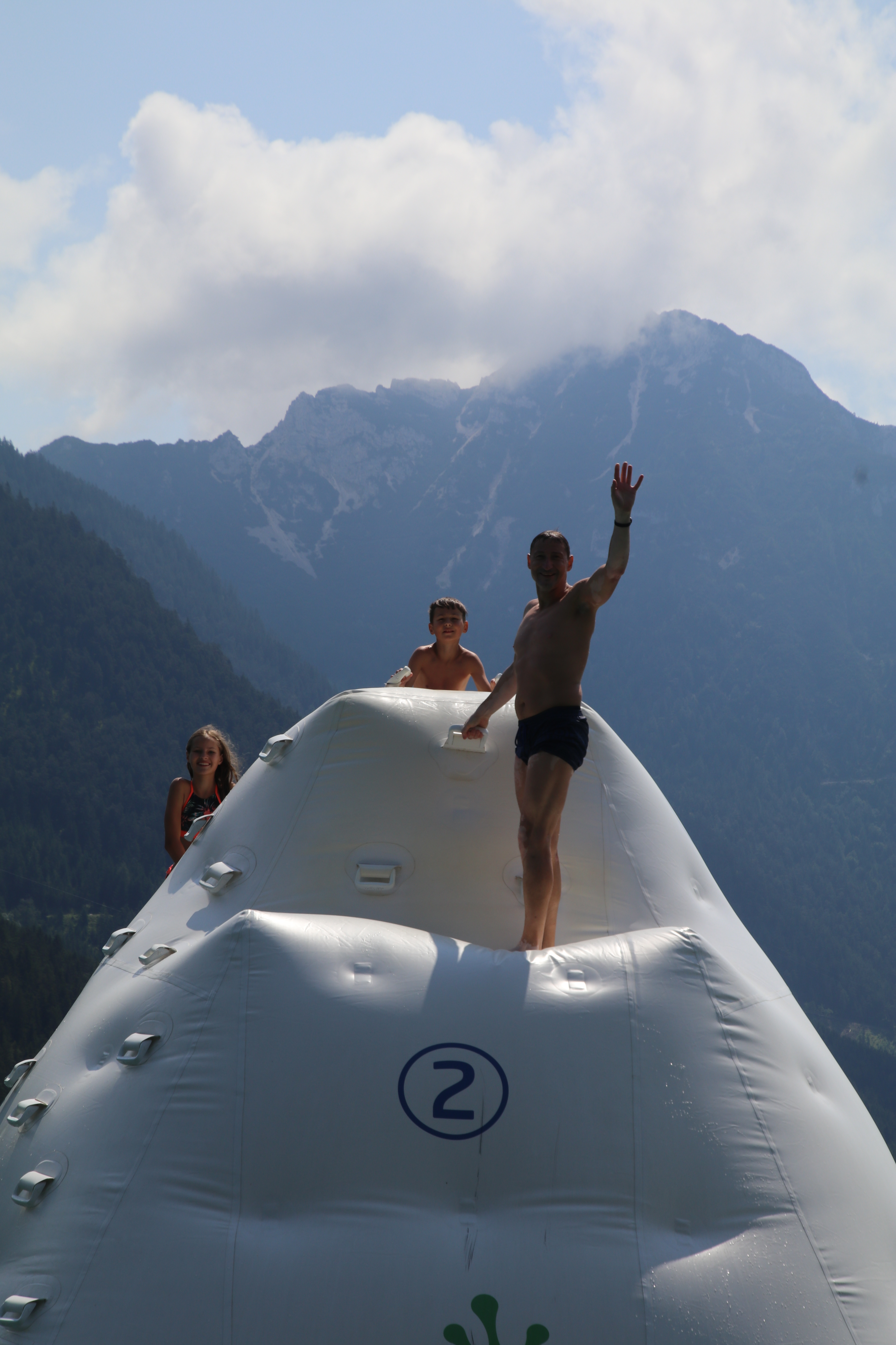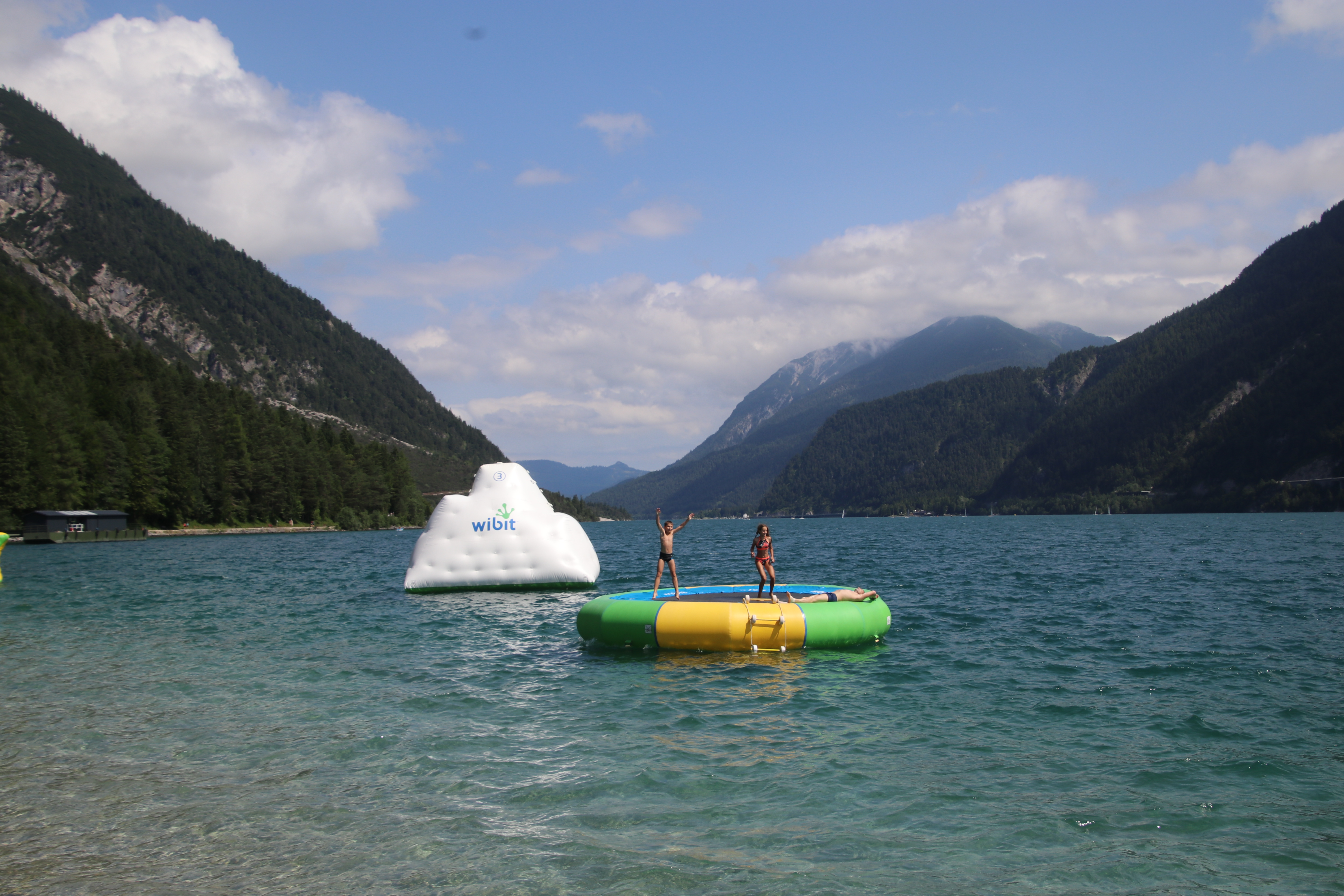 Wir haben auf knapp 1000 Metern Höhe übernachtet. Hier ist es am Morgen kühl und es regnet leicht. Zum Frühstück fahren wir die verbleibenden 30 Kilometer bis zum Achensee. Mattis hat gestern schon den ganzen Tag gefragt, wann wir denn endlich an der Grenze sind. Als wir diese überqueren, rufen die Kinder im Chor “Tschüss Deutschland”.