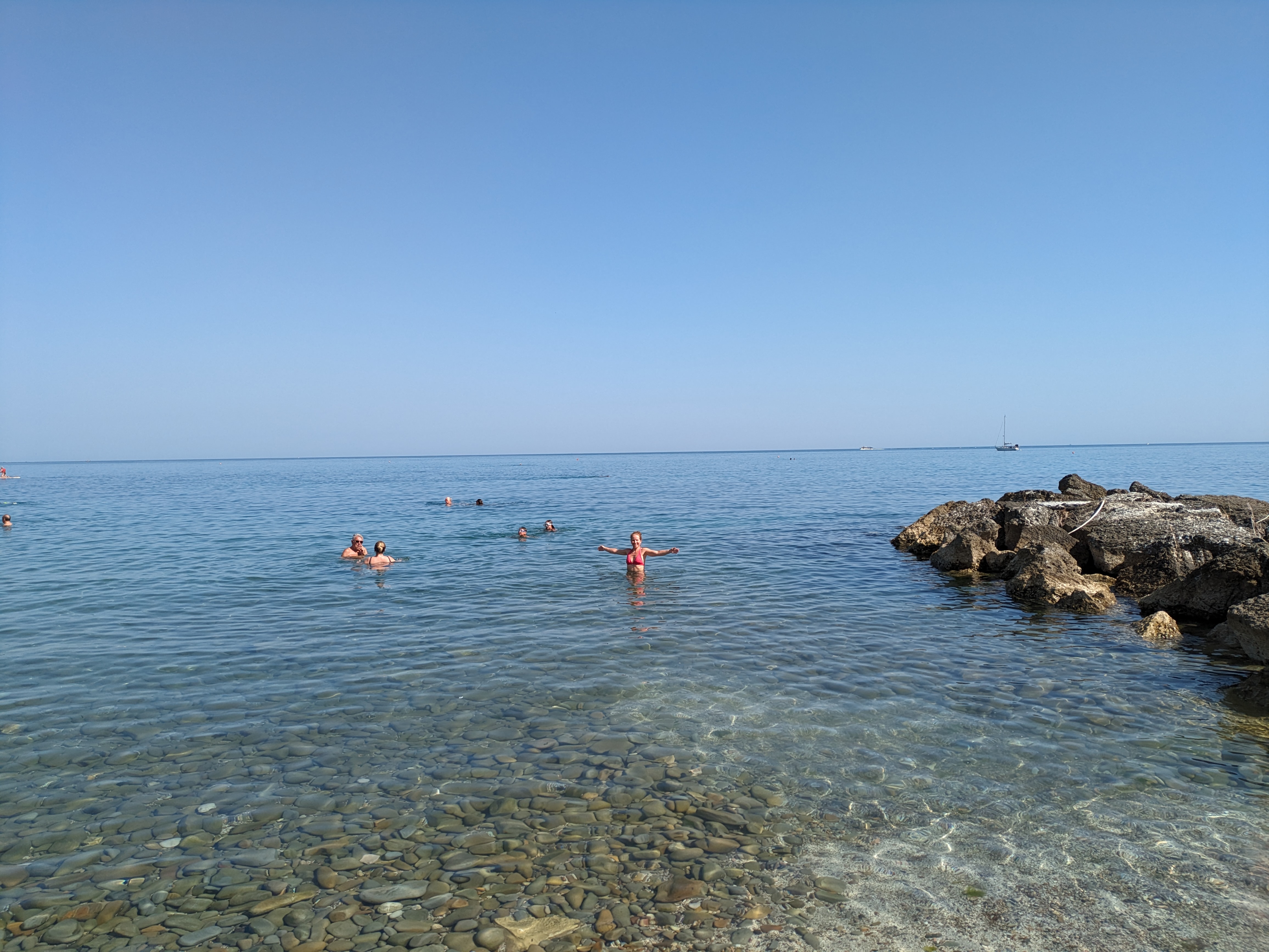 Die Nacht war sehr angenehm, die Klimaanlage haben wir nicht mehr benötigt. Wir schlafen aus, frühstücken im Schatten der Bäume des Stellplatzes und verbringen den Vormittag unten am Meer. Anke und ich entspannen und lesen, die Kinder bauen Burgen aus Sand und Steinen.
