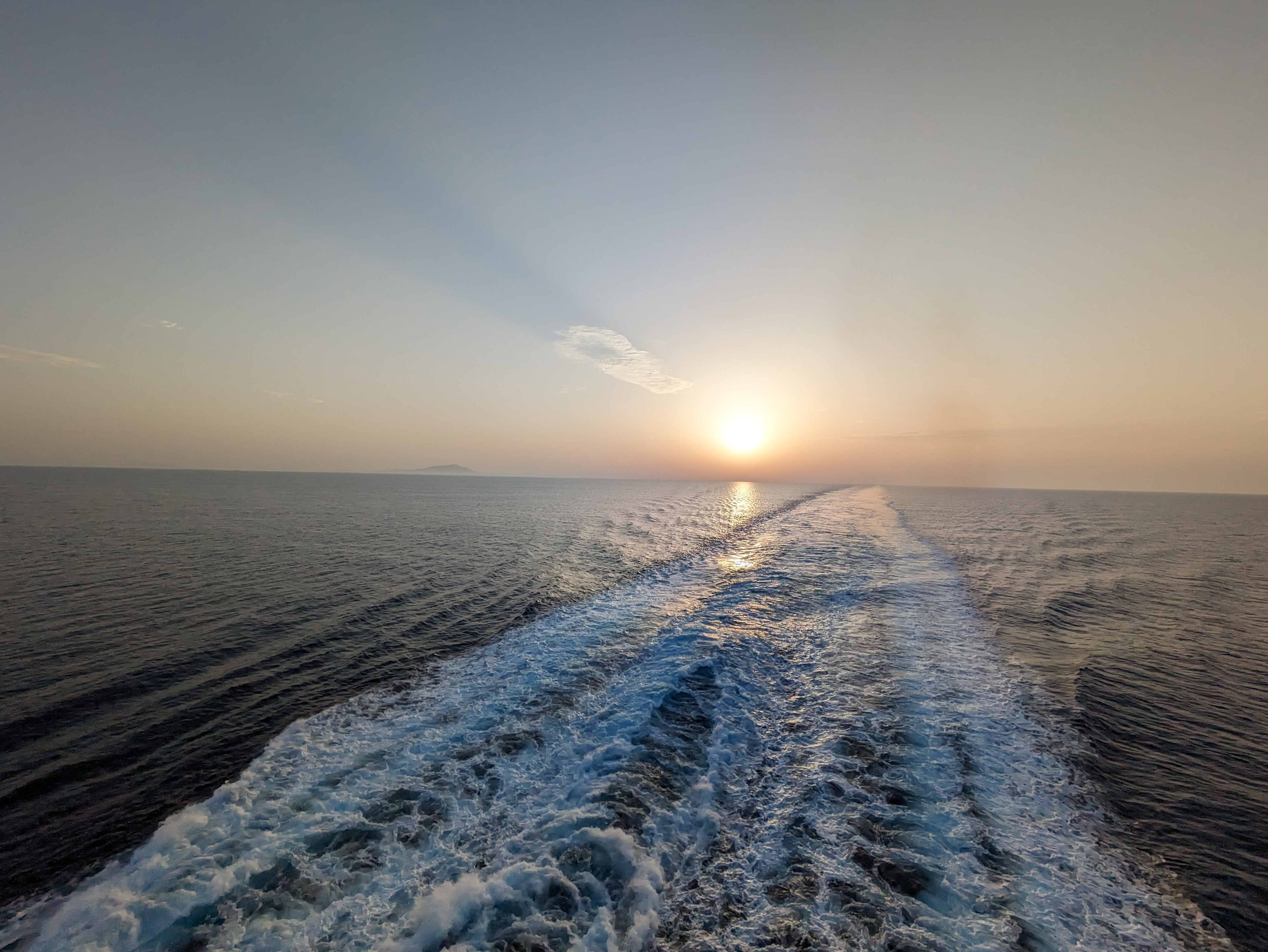 Zum Sonnenuntergang gehen wir noch einmal an Deck. Danach schauen wir noch den ersten Teil von “Zurück in die Zukunft” auf dem Laptop und verschlafen den Großteil der Fahrt über’s Meer.