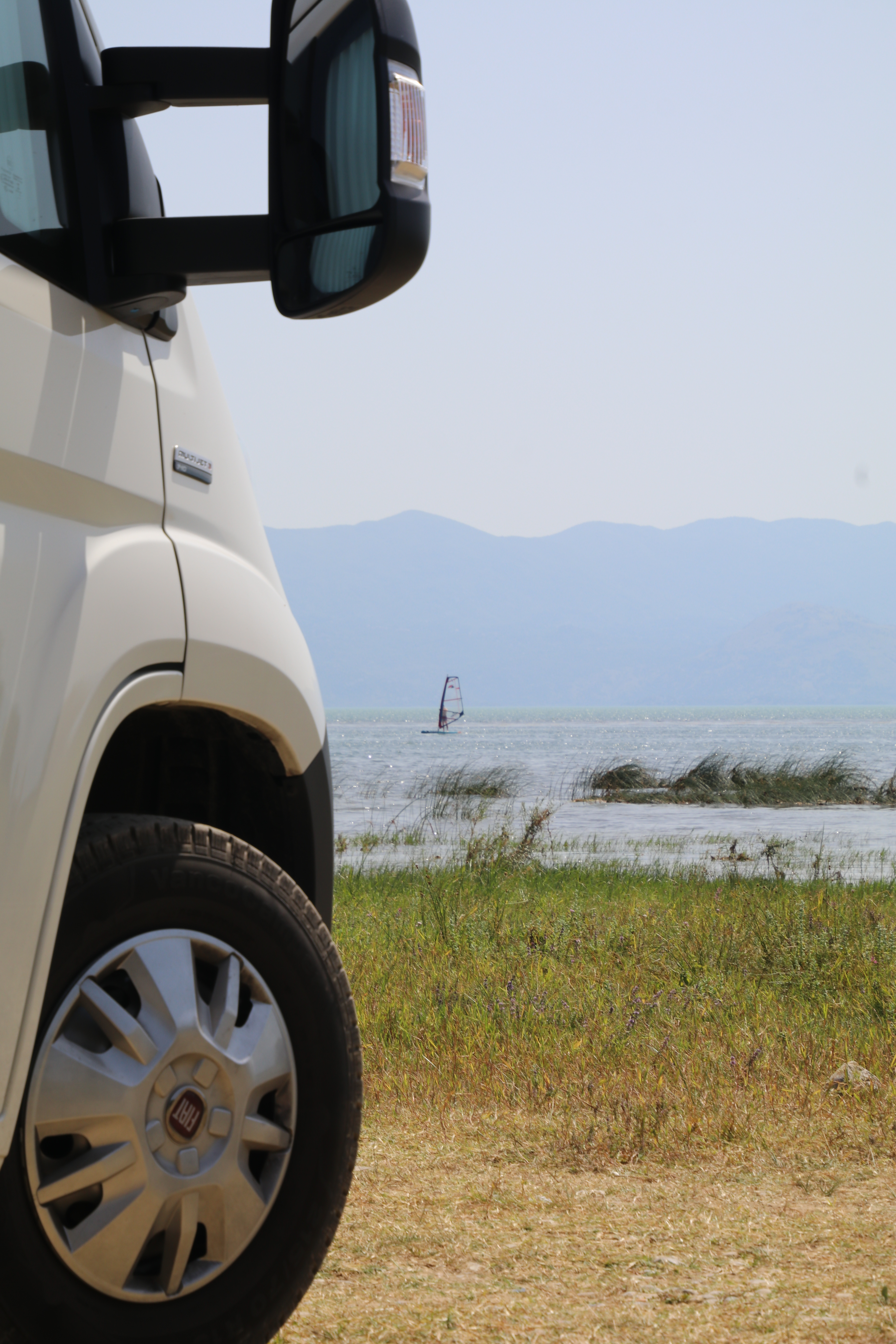 Nach dem Mittagessen baue ich das Segel auf’s Board und schippere ein wenig im seichten aber sehr konstanten Wind auf dem See herum. Auf die Art und Weise verbringen wir den gesamten heißen Tag entspannt am See.