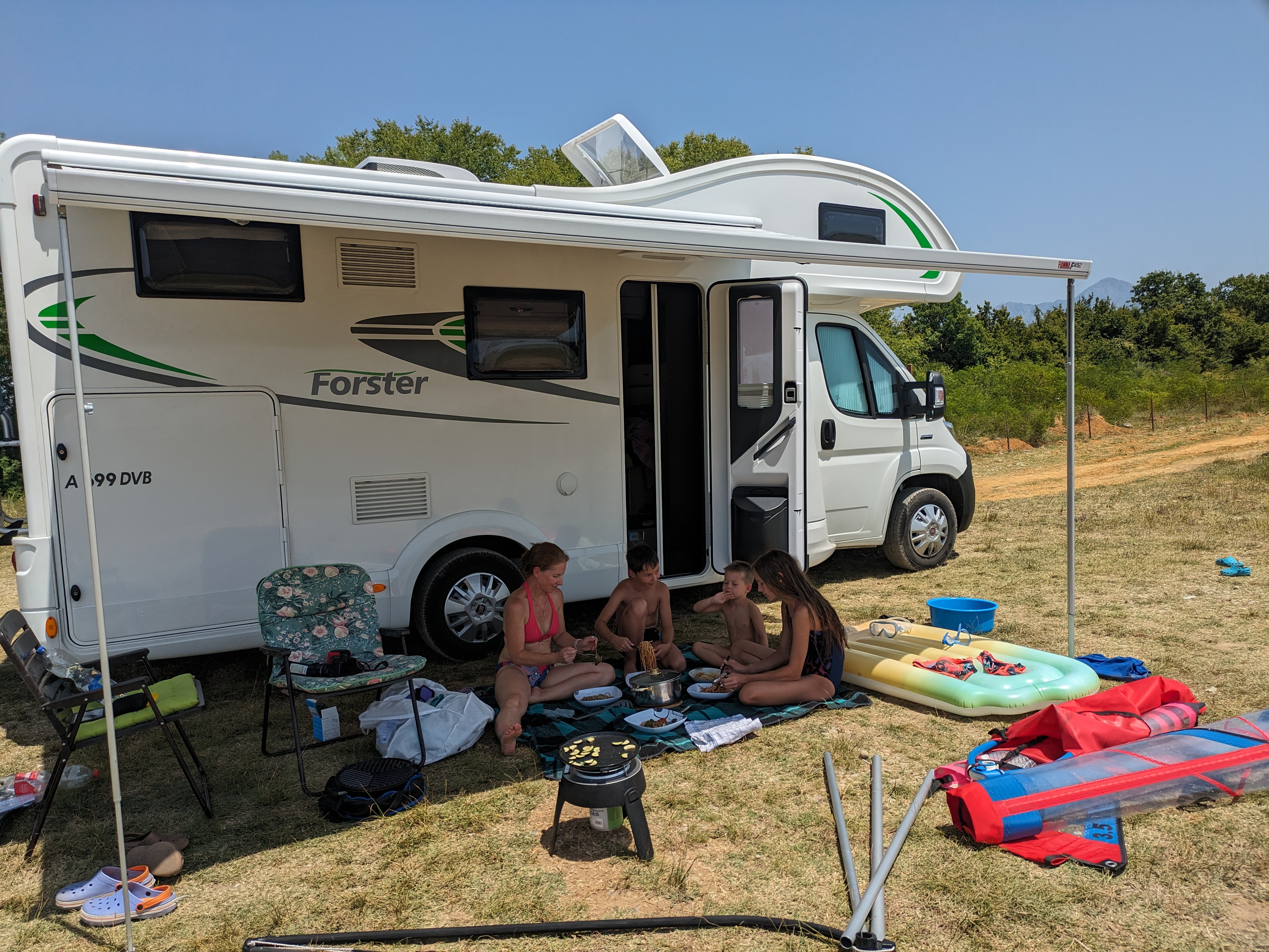 Zum Mittag gibt es im Schatten des Campers Spaghetti mit Pesto und etwas Gemüse (Danke an Christiane für das leckere Pesto!).