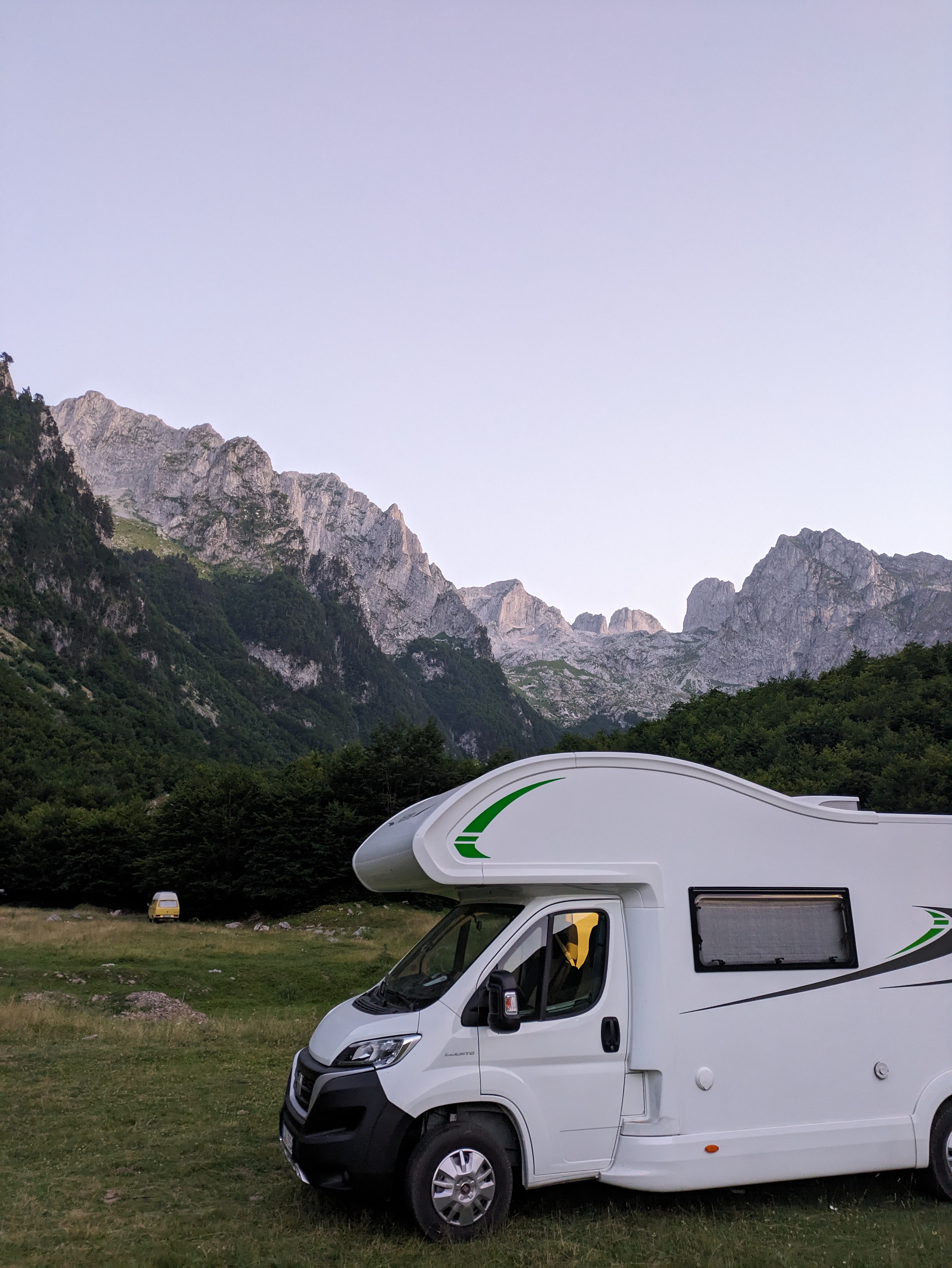 Die letzten Kilometer ist die Straße nur noch einspurig. Etliche entgegenkommende Fahrzeuge machen die Anfahrt zum Geduldsspiel. Als die Sonne gerade noch die letzten Bergspitzen beleuchtet, erreichen wir den Stellplatz - eine große Wiese auf über 1000 Metern Höhe, gesäumt von schroffen Berggipfeln.