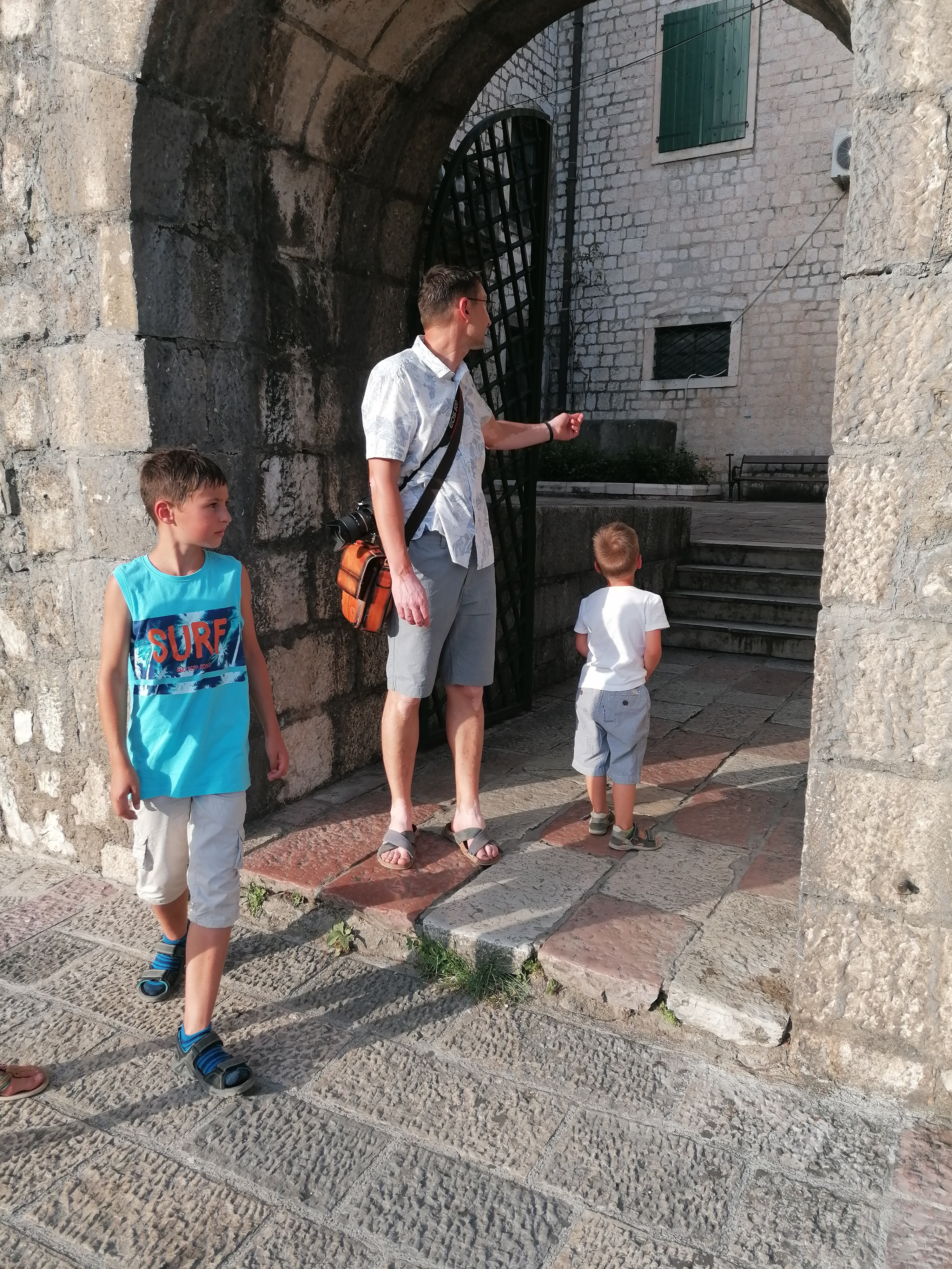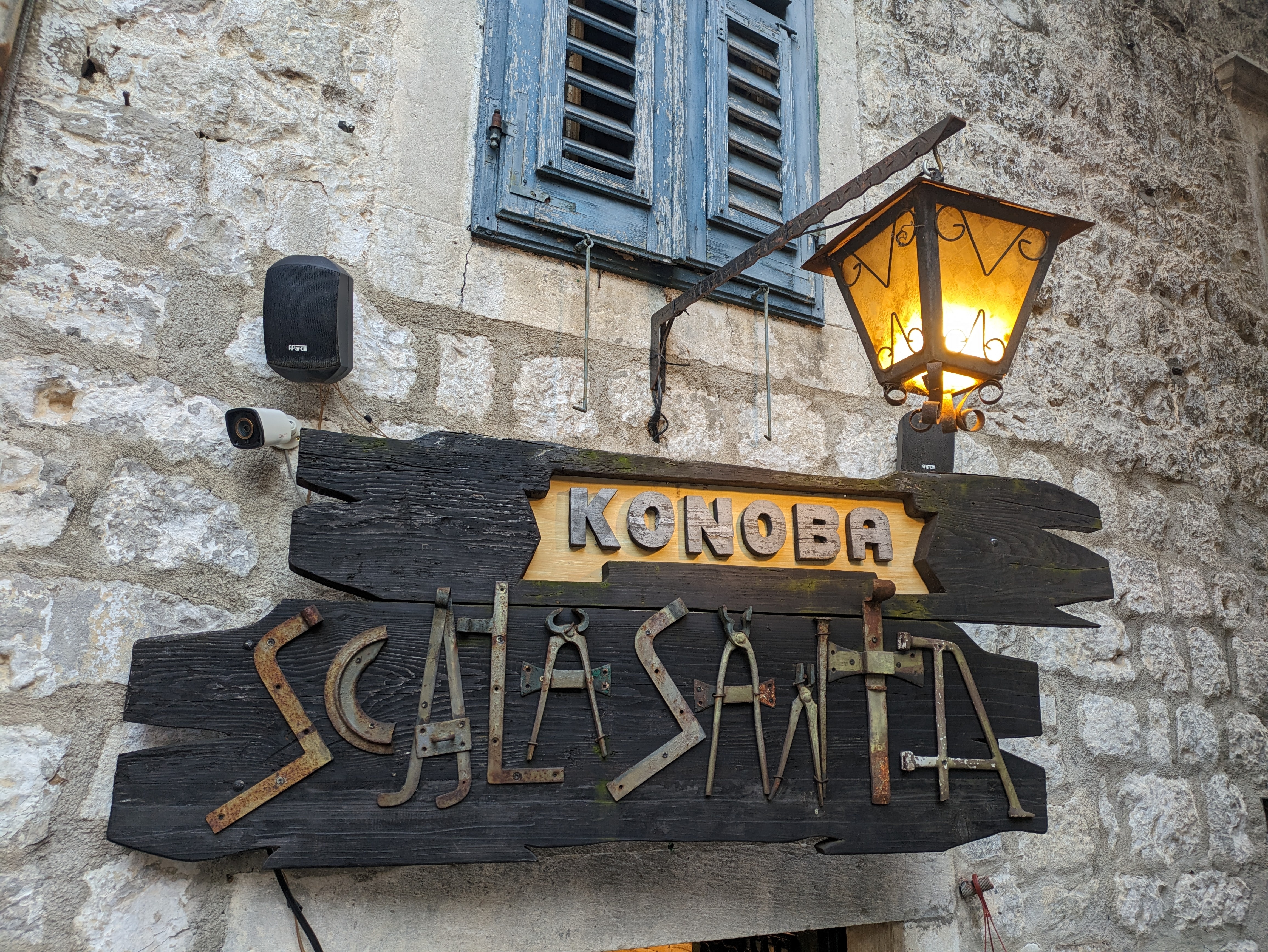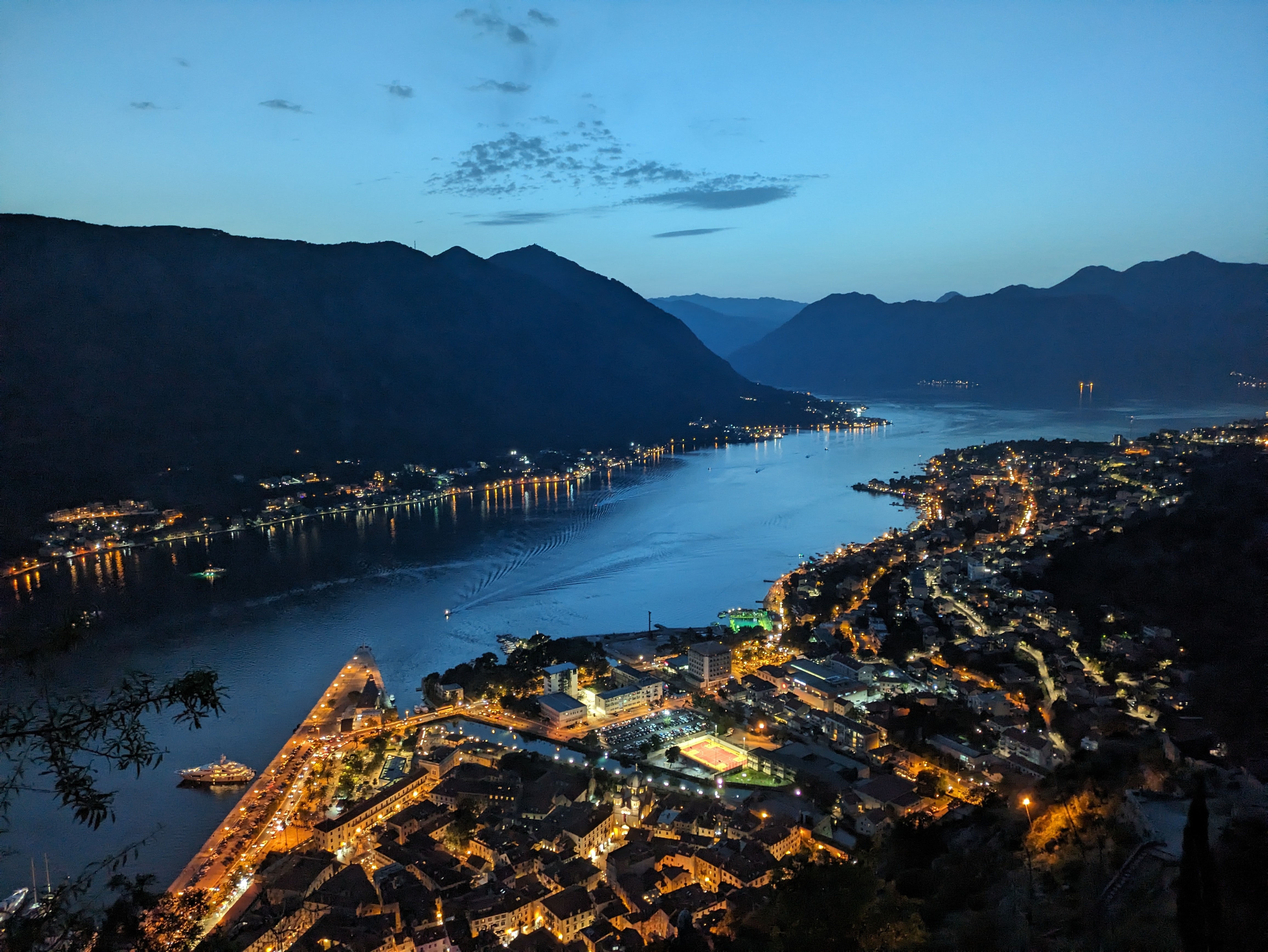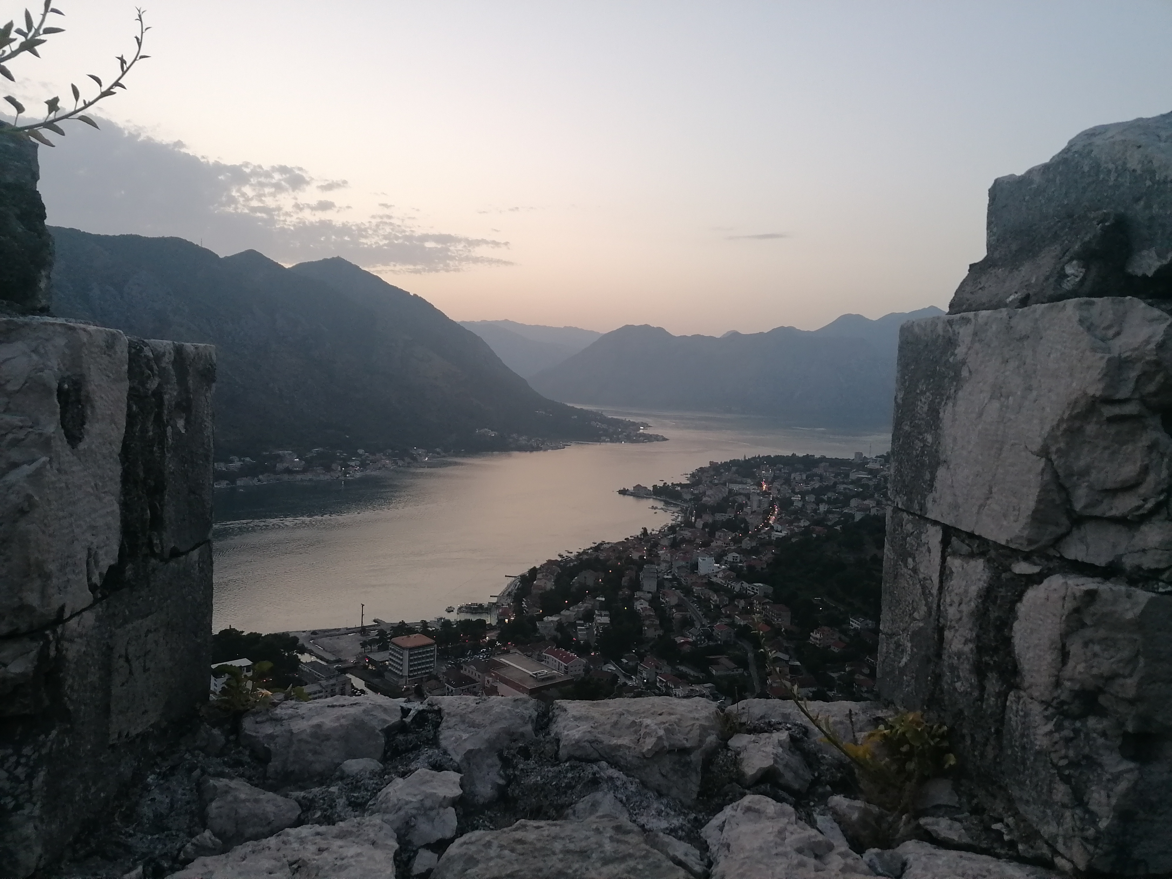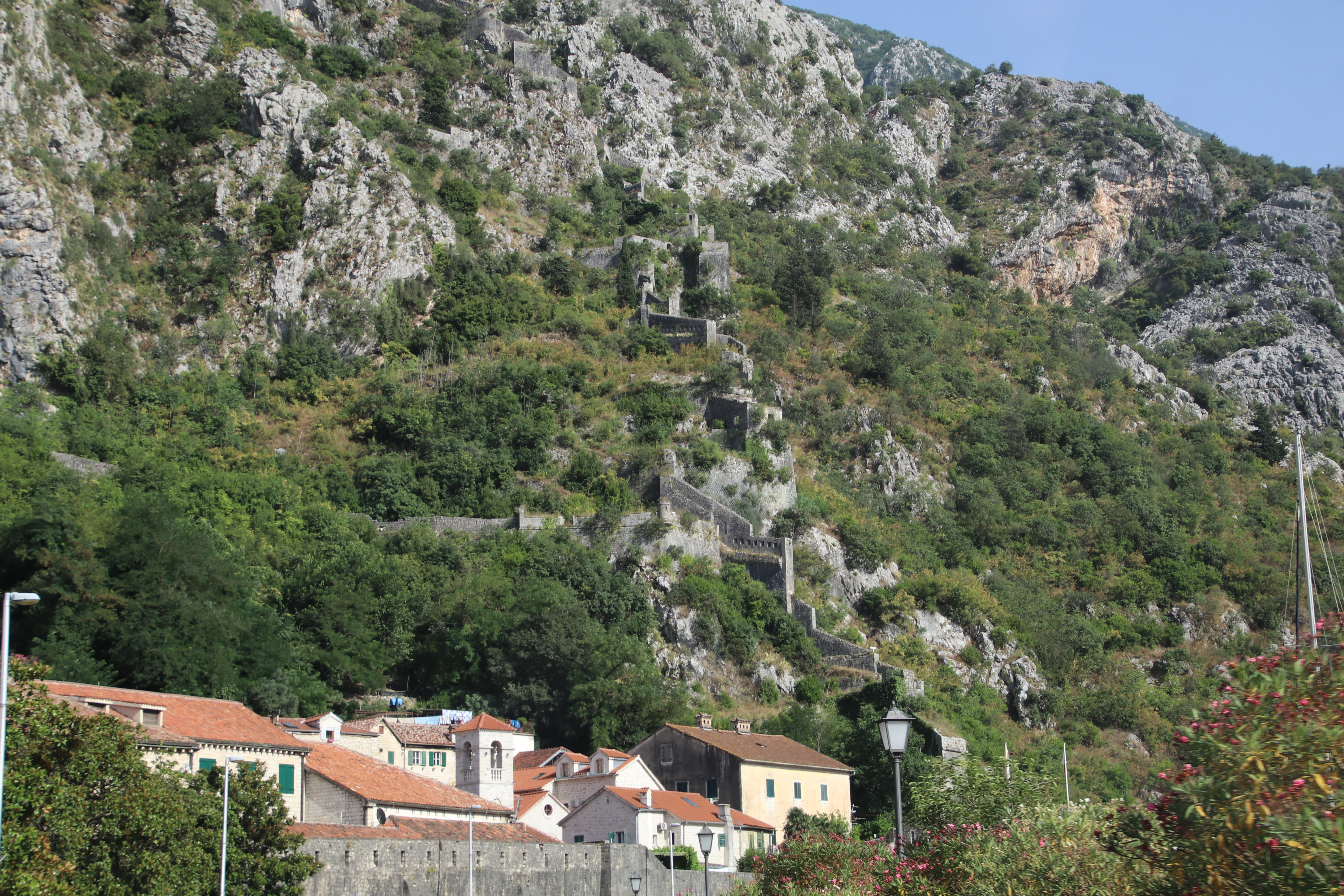 Die Straße windet sich den Berg hinunter und folgt dann der Kontur der Küstenlinie. Hier unten ist zwischen der Straße und dem Berg gerade genug Platz für ein paar einzelne Häuser. In Richtung Meer quetscht sich das eine oder andere Restaurant. Wir schlängeln uns noch eine reichliche halbe Stunde durch dichten Verkehr, bis wir die Altstadt von Kotor passieren.