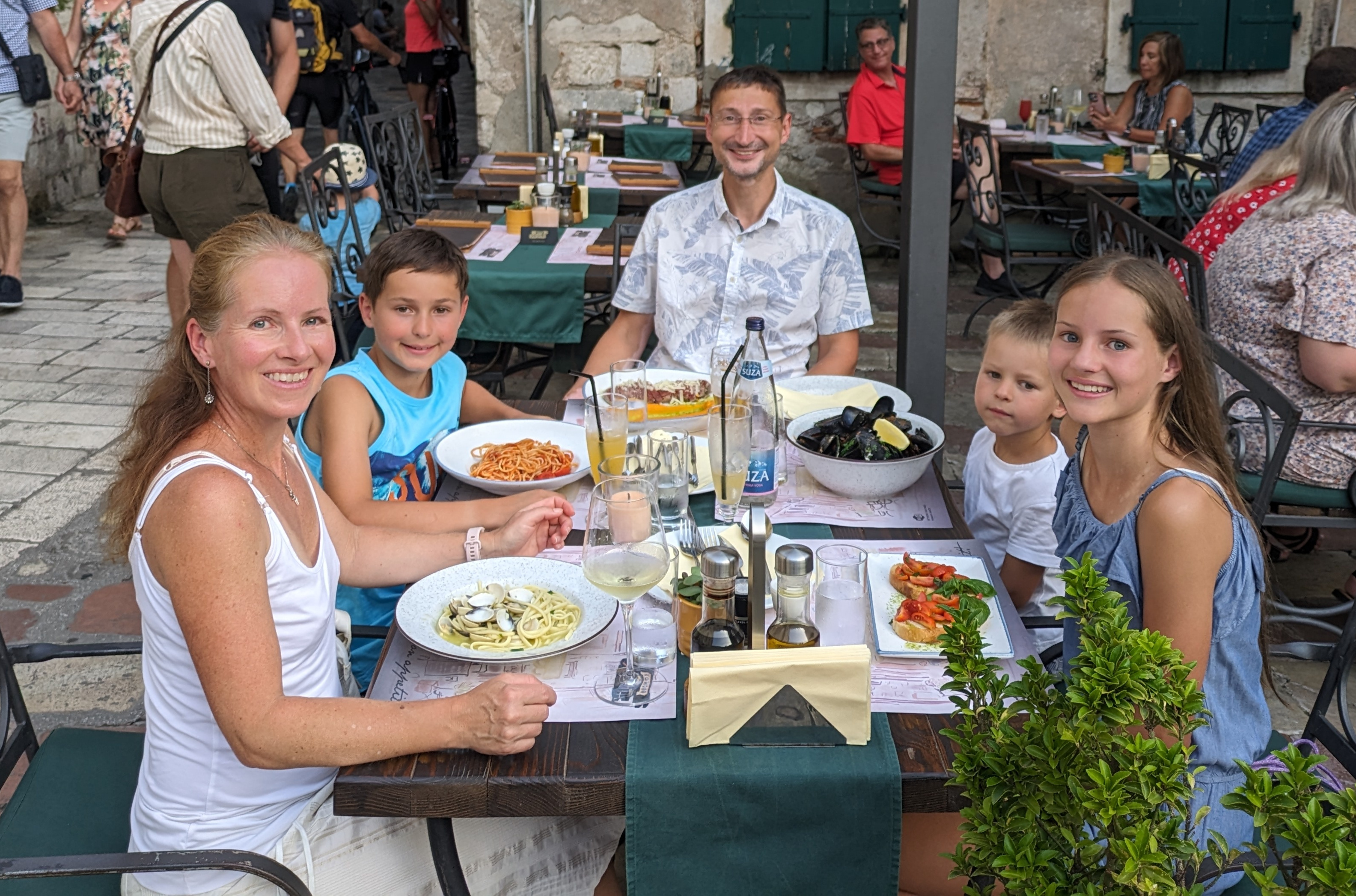 Anke und Mattis wollen Muscheln essen. Für mich gibt es ein kleines zartes Rumpsteak. Annabell hat keinen großen Hunger und begnügt sich mit einem Bruschetta. Felix findet nichts passendes auf der Karte, wir können aber Pasta mit Tomaten für ihn bestellen.