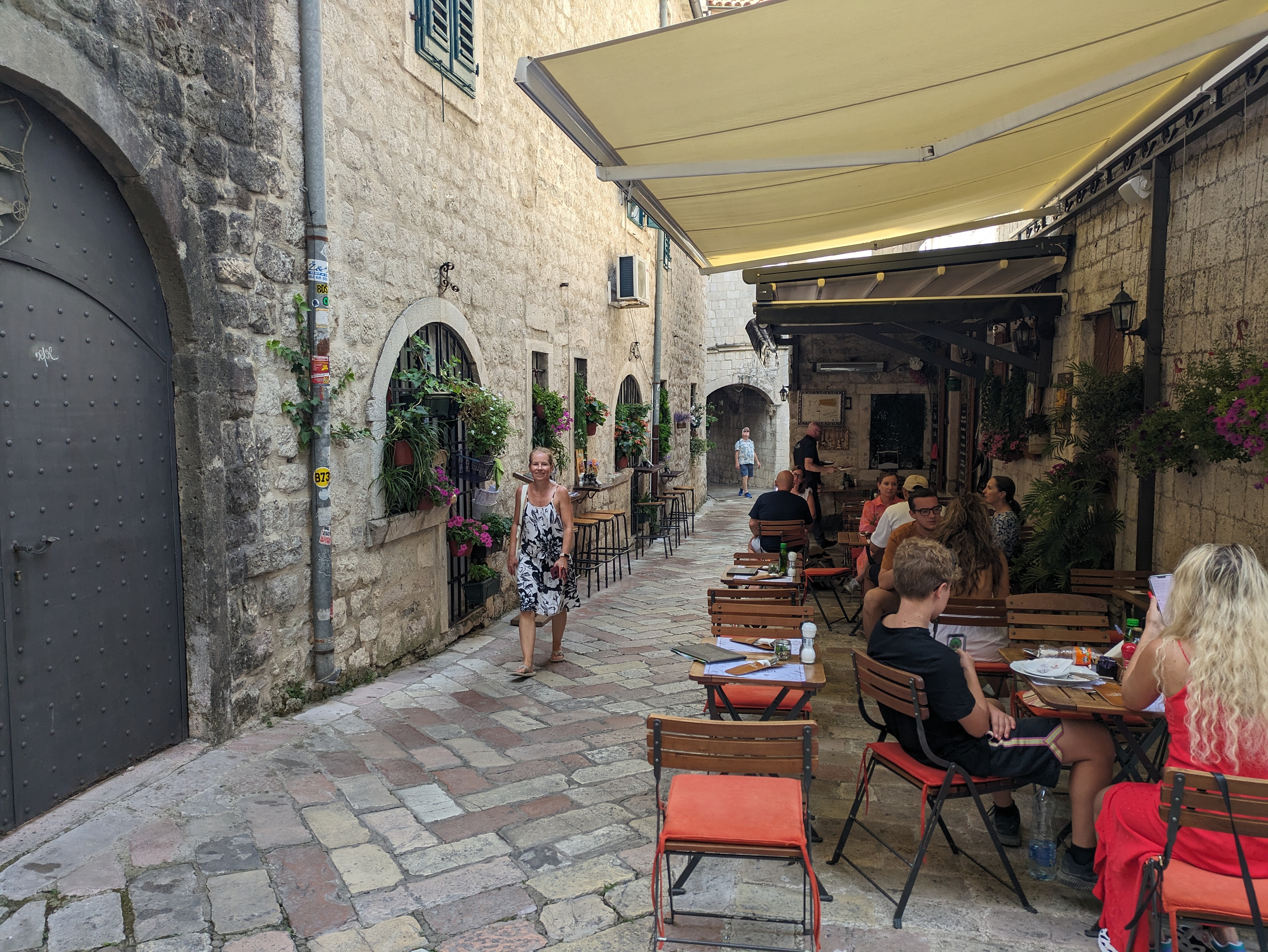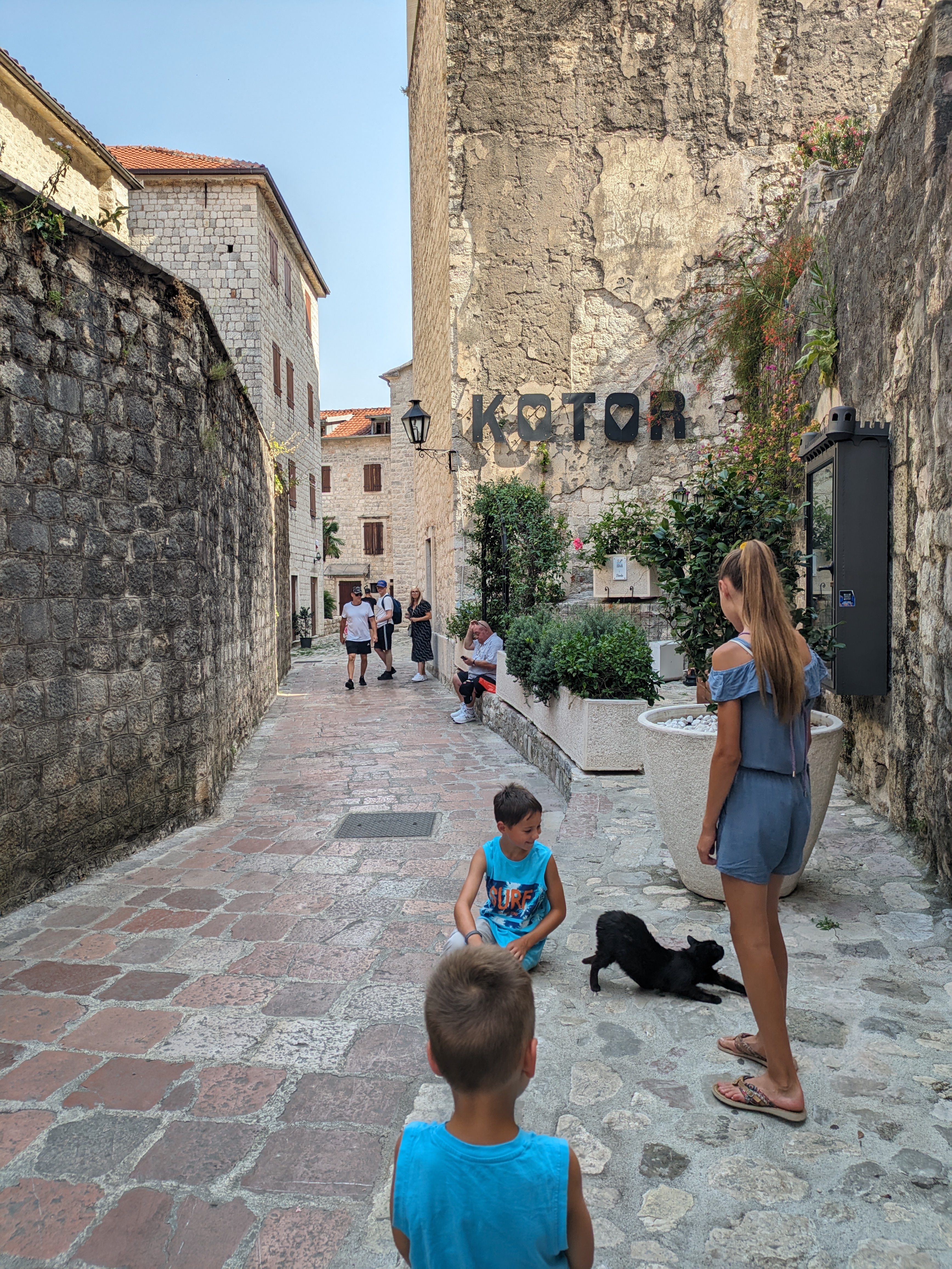 Nach dem Frühstück schlendern wir noch ein Stück durch die schöne Altstadt Kotors. Wir kennen schon einige Wege von gestern, trotzdem müssen wir drauf achten, uns im Gewirr der Gassen nicht zu verlaufen. An jeder Ecke gibt es Bars, Restaurants, Eis und Souveniere. Wir kaufen das Eine oder Andere und schauen uns nach den vielen Katzen um, die hier jedes bequeme Plätzchen in Beschlag genommen haben.