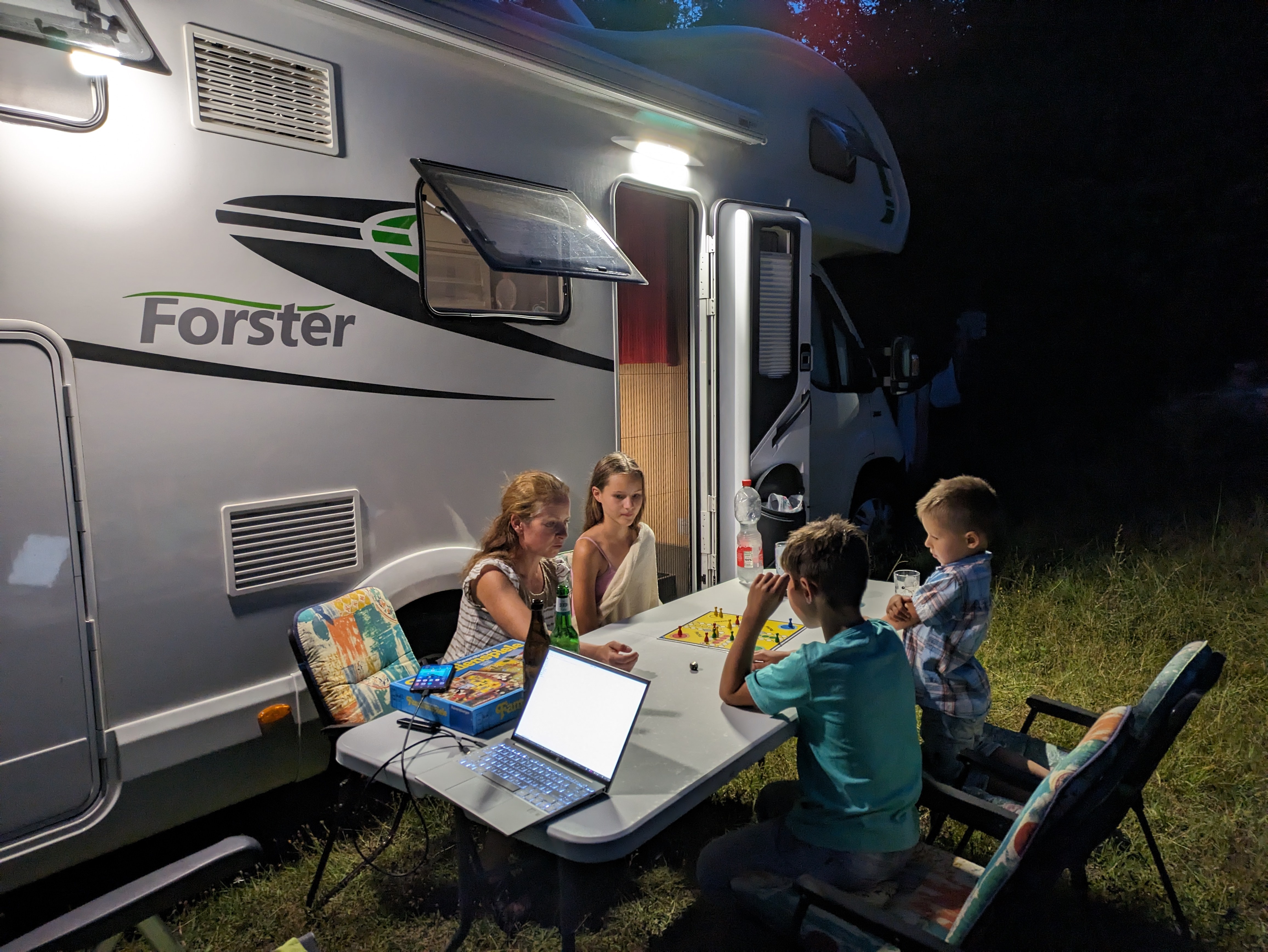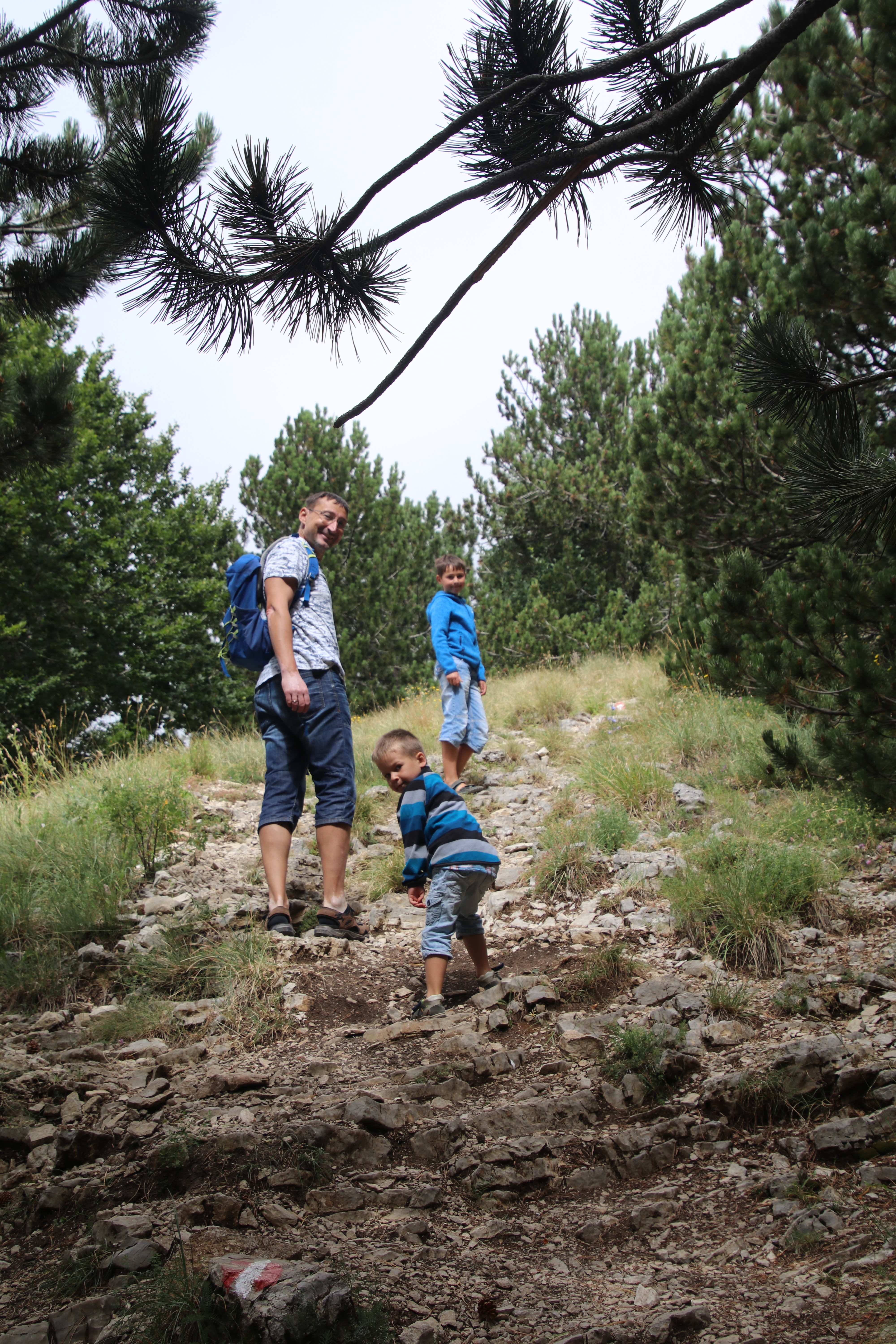 Frühstück gibt’s im Camper, draußen ist es noch zu windig. Wir haben gestern vom Bäcker noch Schokocroissants für heute mitgenommen, die wir uns schmecken lassen. Nach dem Frühstück fahren wir wieder auf den oberen Parkplatz. Annabell kuschelt sich nochmal ins Bett; Anke, Mattis, Felix und ich wandern durch den Wald ein kurzes Stück bis zum Gipfel des Berges.