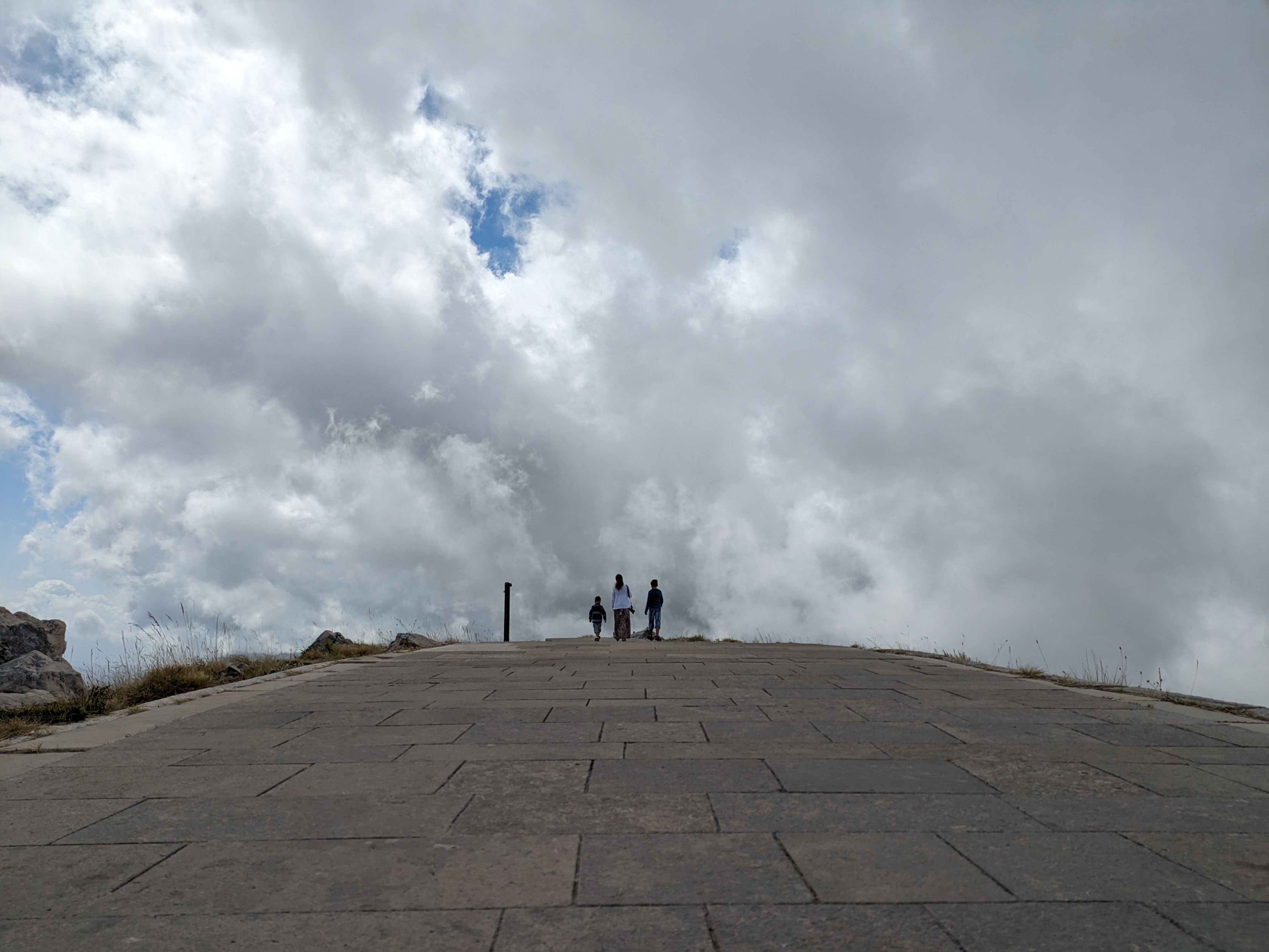 Hinter dem Monument befindet sich ein Weg zu einer Steinplattform, die einen Rundumblick über die Gipfel ermöglicht. Wir schießen ein paar Fotos und machen uns wieder an den Abstieg.