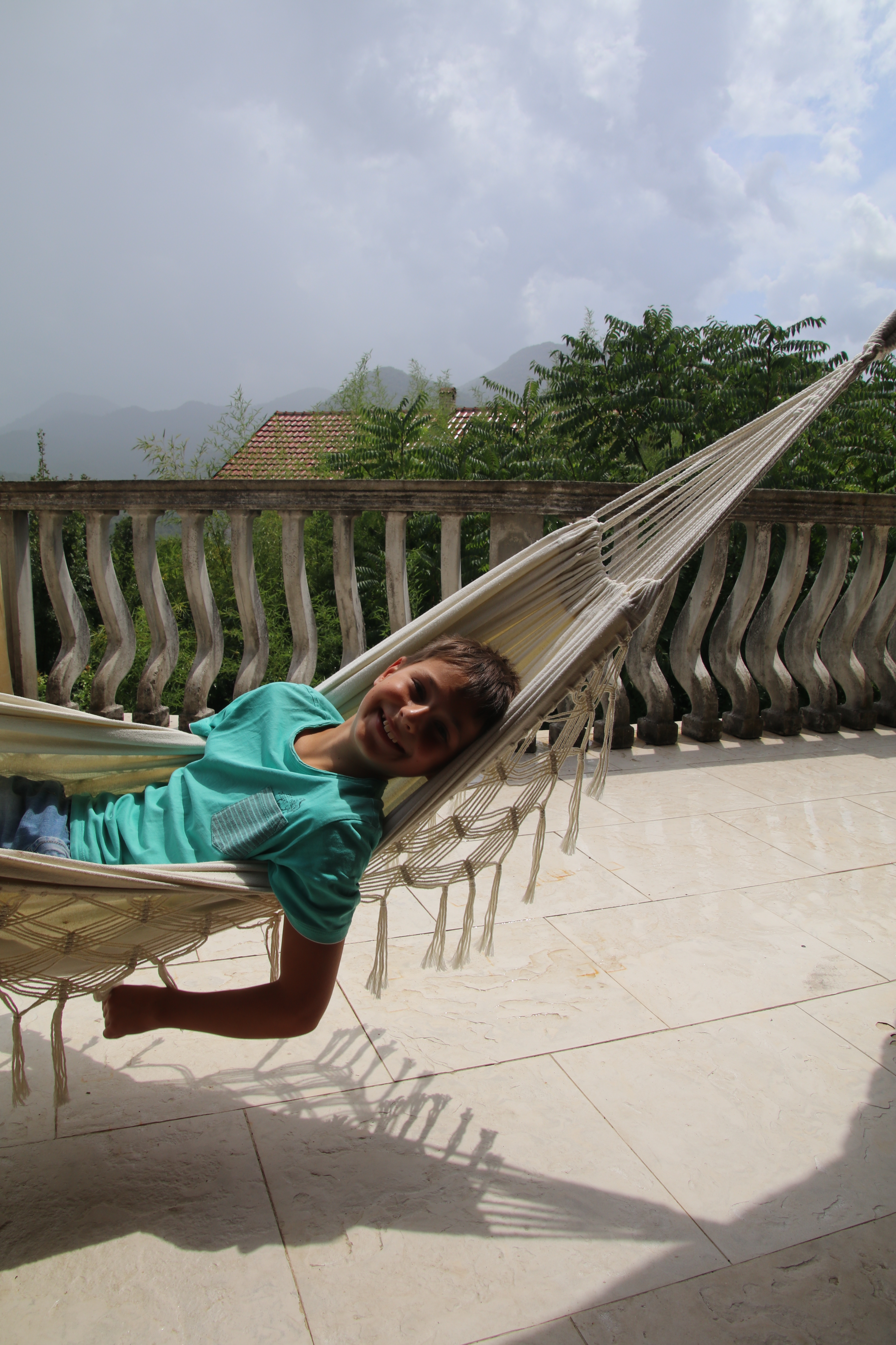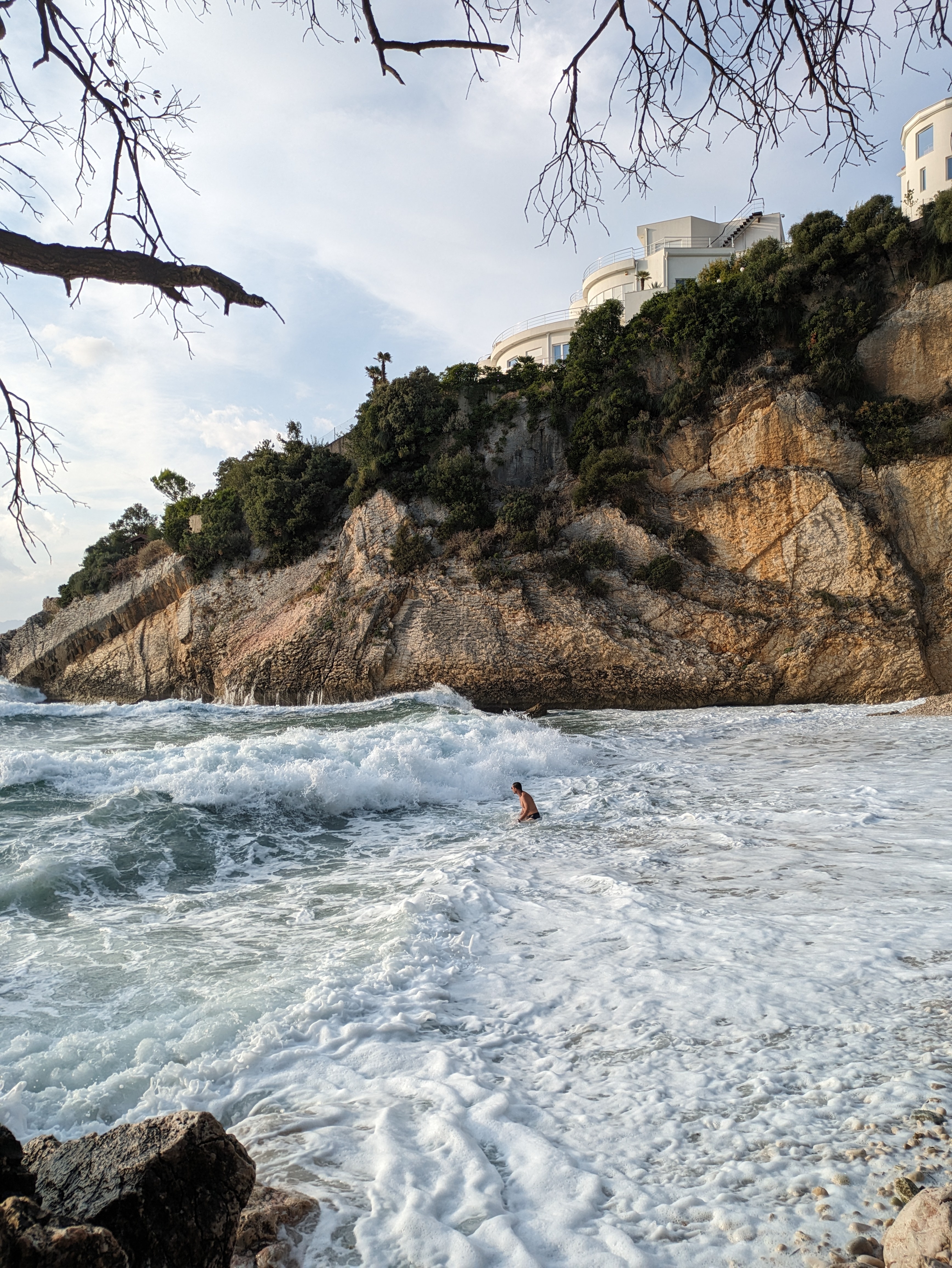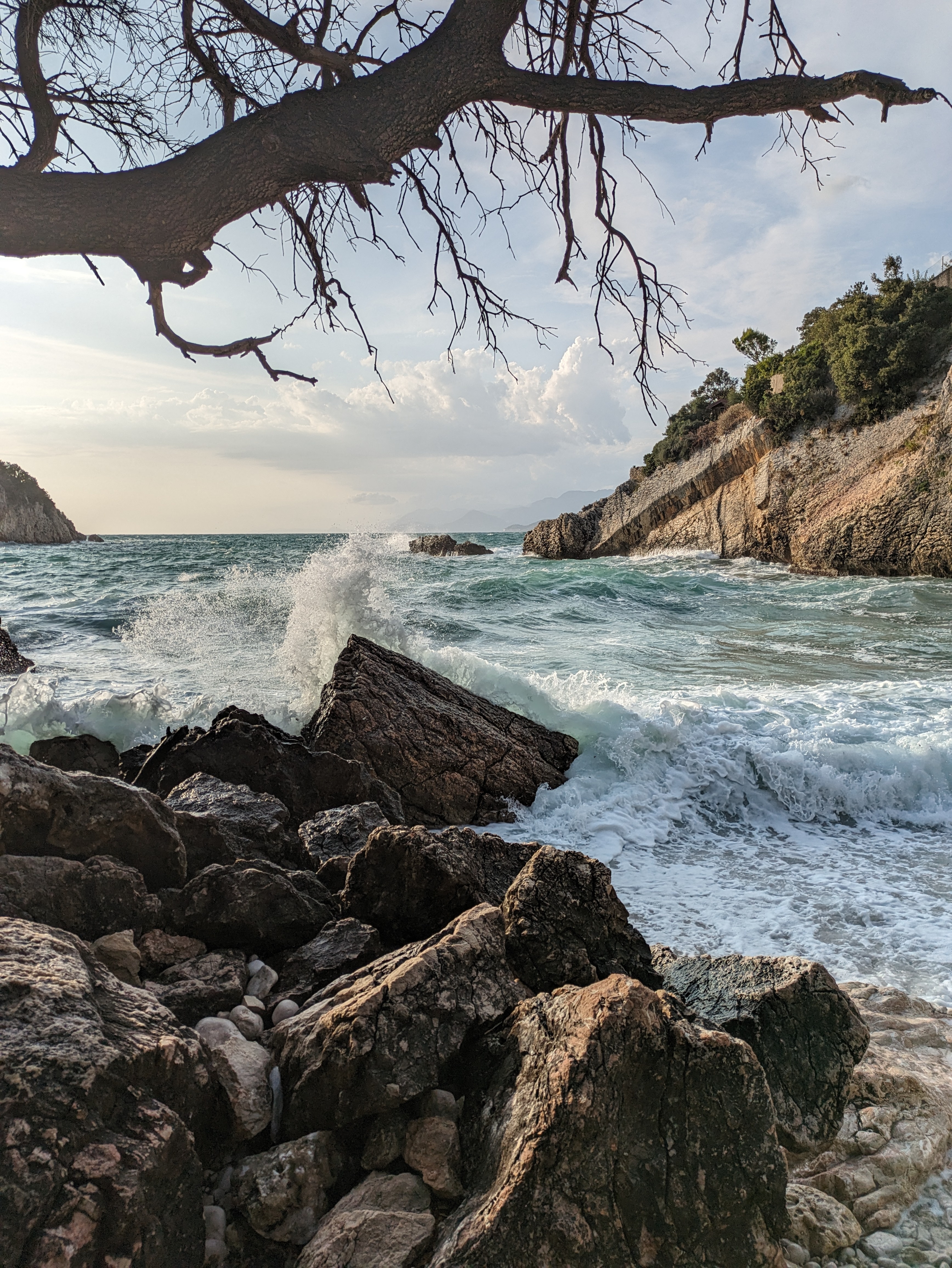 Wir erreichen die Küste, wo die einzige “große” Straße entlang führt. Hier gibt es erst einmal Stau um den Badeort “Bar”. Wir fahren noch ein Stück weiter, Anke hat außerhalb einen Strand gefunden, der nicht so überlaufen sein soll. Wir starten einen Versuch, mit dem Camper bis ganz in die Nähe zu kommen. Die Straßem abseits der Hauptstraße sind aber alle steil und eng, wir sind froh, als wir es schaffen zu wenden und wieder auf die Hauptstraße zu kommen. Dort parken wir und laufen das Stück zum Strand hinunter. Die letzten Meter gehen wieder steil abwärts durch den Wald. Diesmal werden wir mit einem fast leeren Steinstrand belohnt.