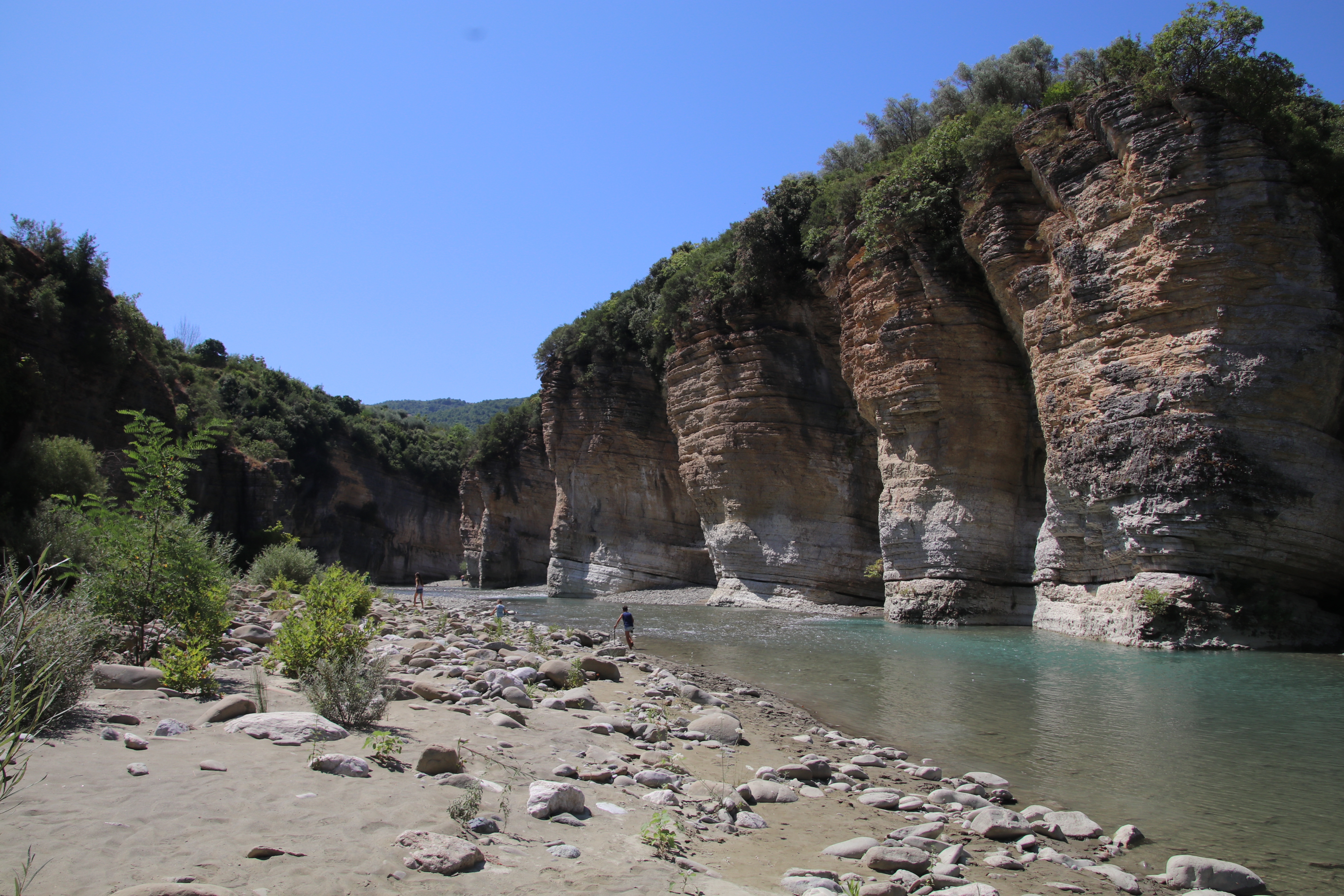 Erst als wir zur Stadt Çorovoda zurück fahren, den Fluss dort an der großen Straßenbrücke überqueren und ein Stück auf der anderen Seite fahren, finden wir eine Stelle, an der wir das Auto parken und bis zum Fluss hinunter laufen können.