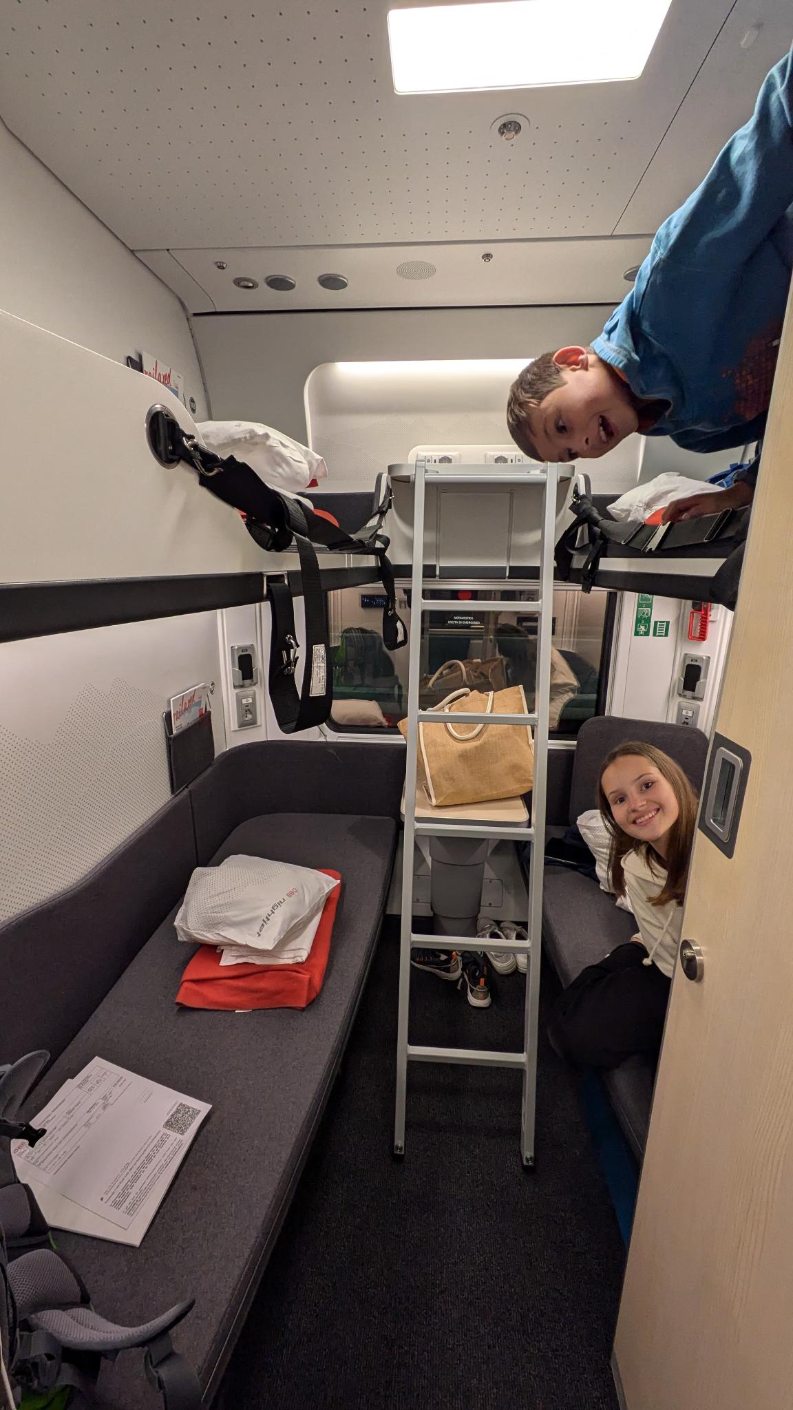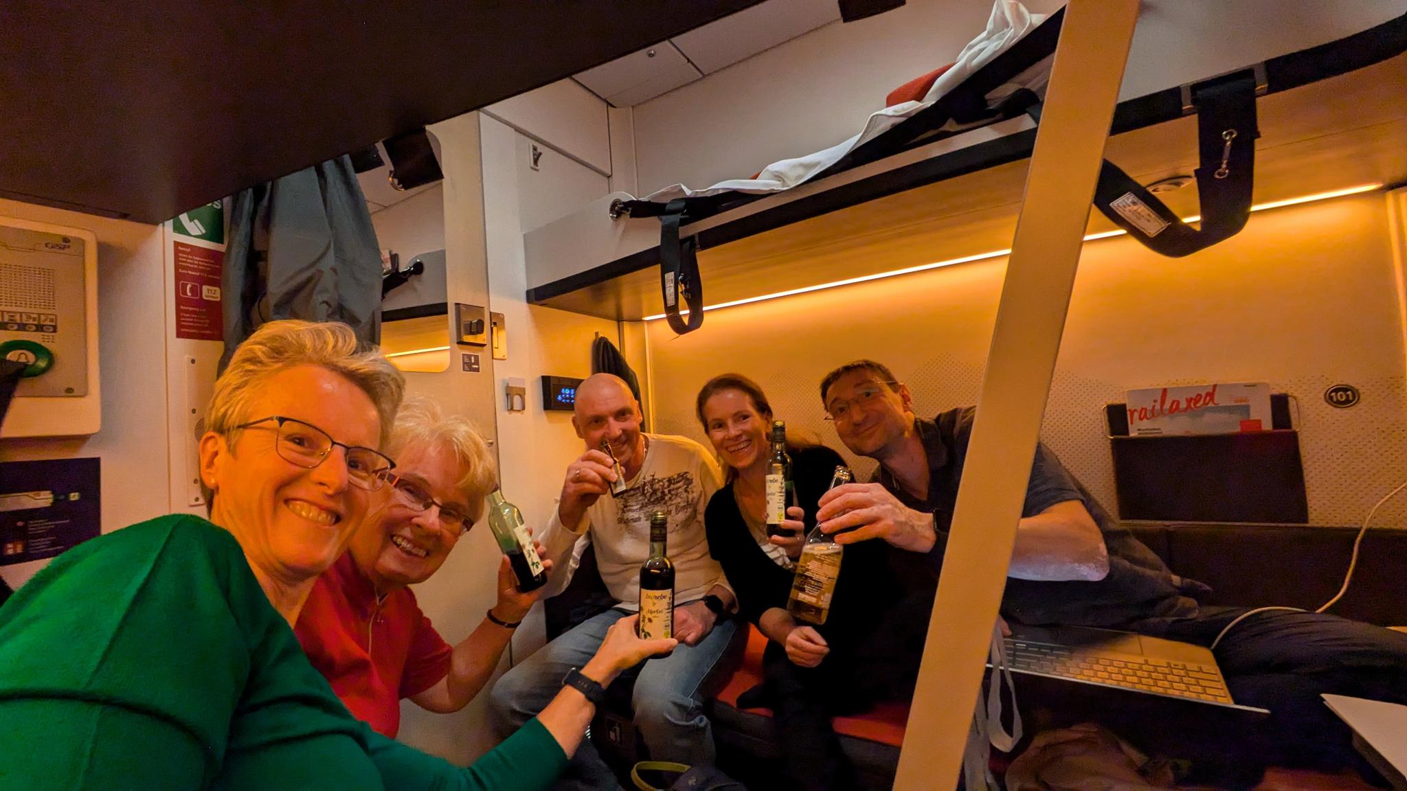 Mattis kommt im 4er Abteil von Silke, Torsten und Luisa unter. Wir machen die beiden Kleinen bettfertig, dann gibt es noch einen Umtrunk in unserem Abteil.