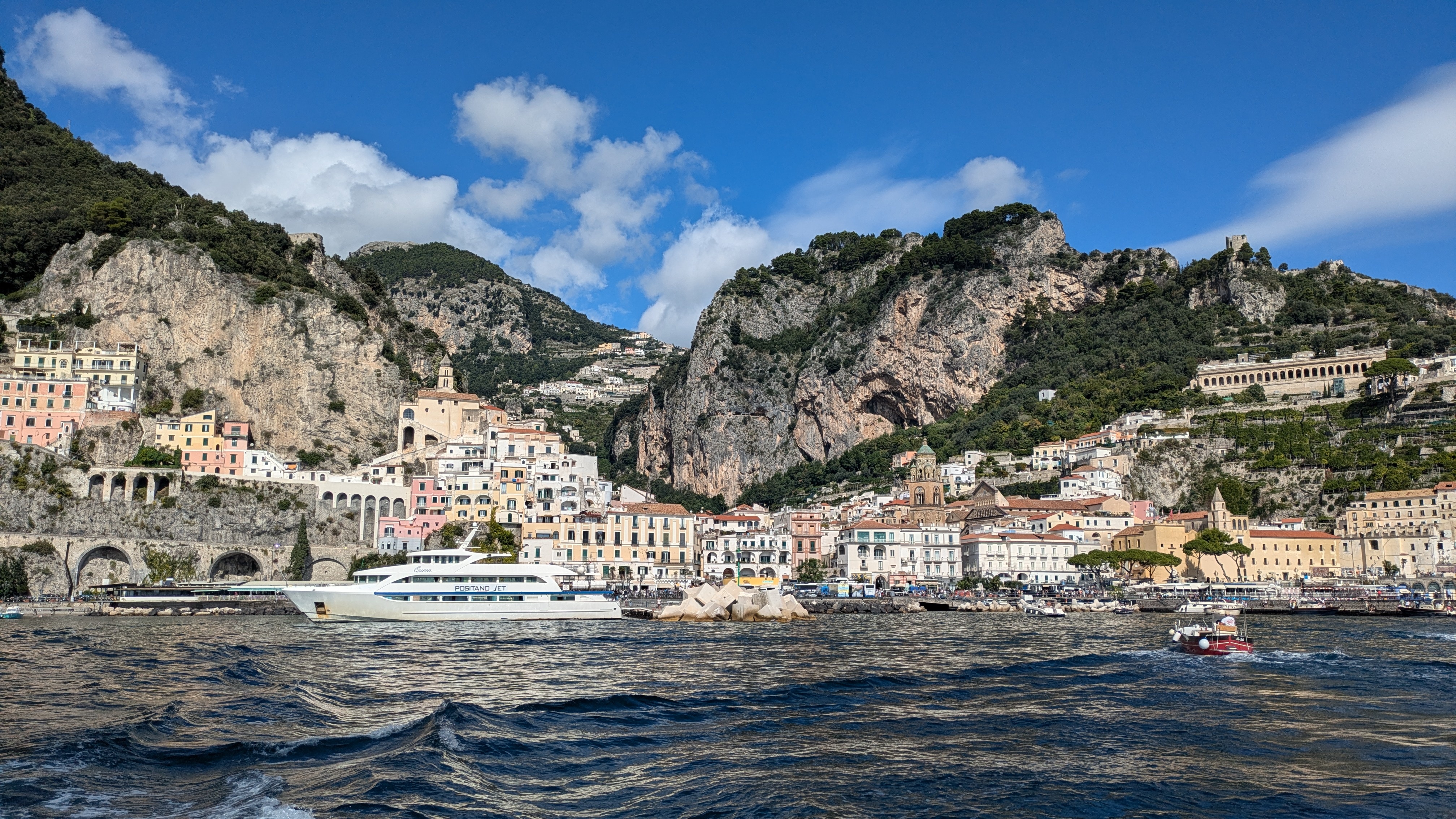 Von Positano aus nehmen wir das Schnellboot nach Amalfi. Dabei können wir zum Einen die Küste sehen, zum anderen geht es auch schneller und entspannter voran, als auf der Straße.
