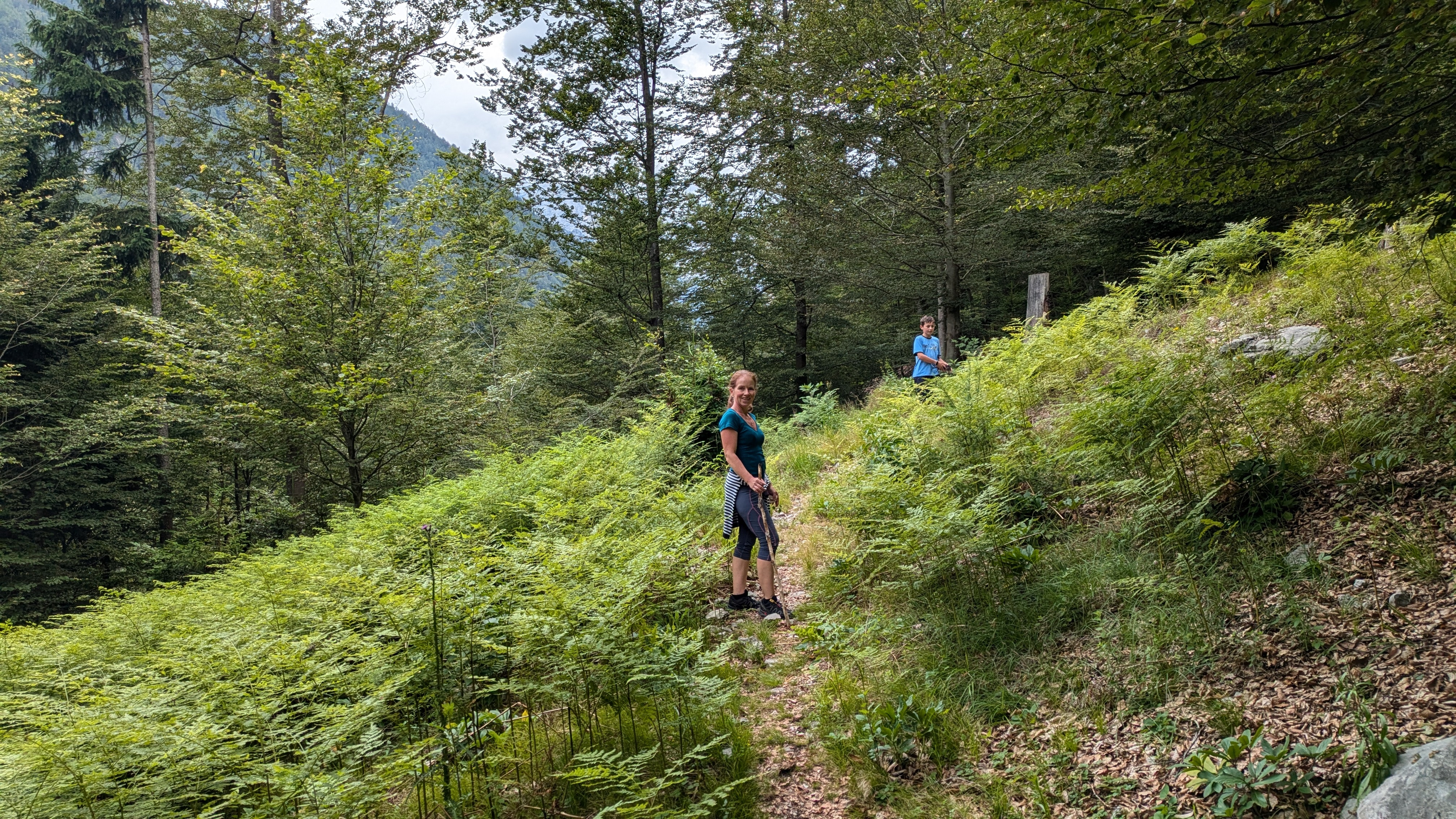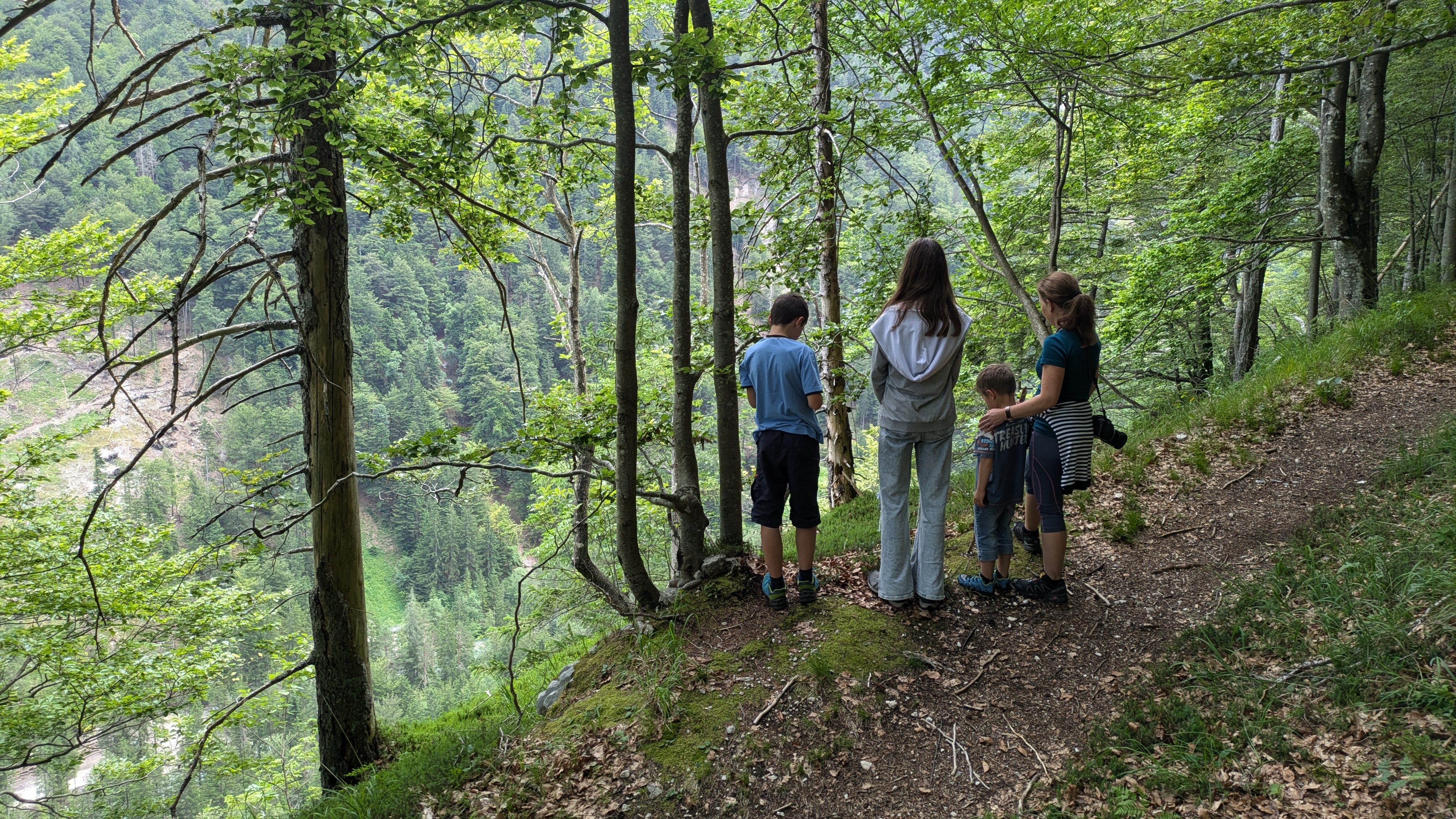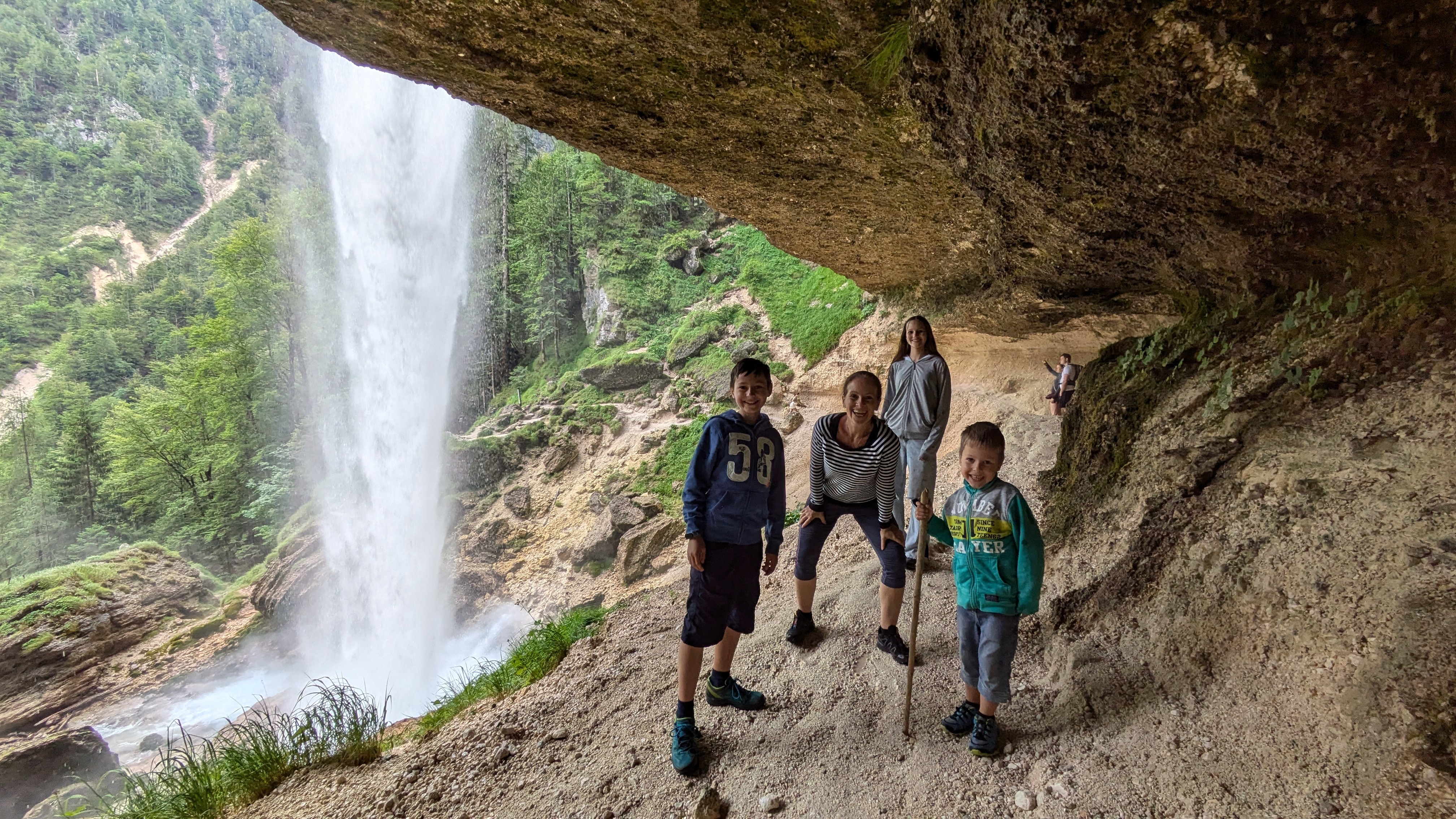 Wir halten auf dem Heimweg noch am Parkplatz zum Martuljkov-Wasserfall an. Der Weg durch den Wald ist nur etwas über einen Kilometer lang.