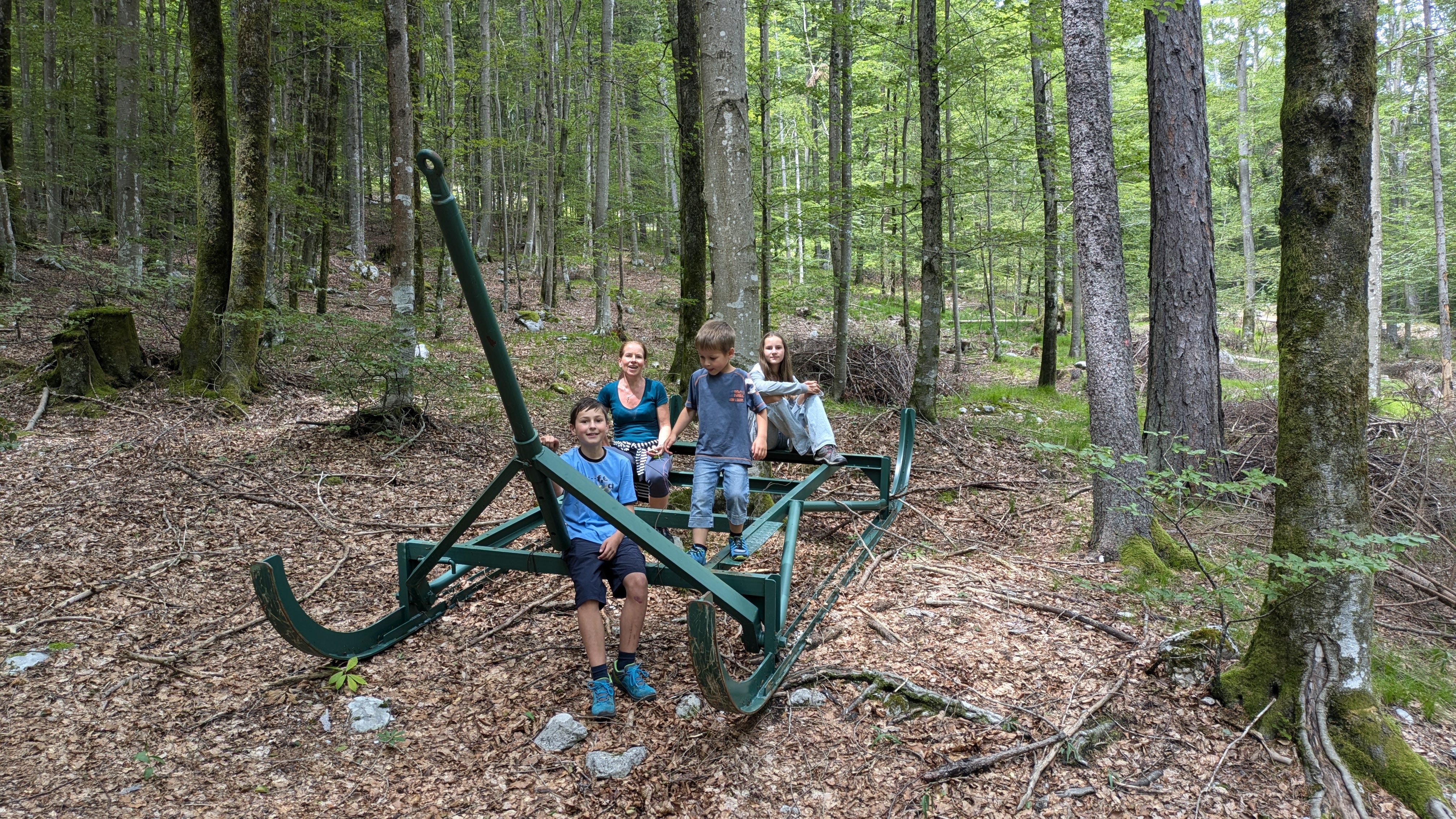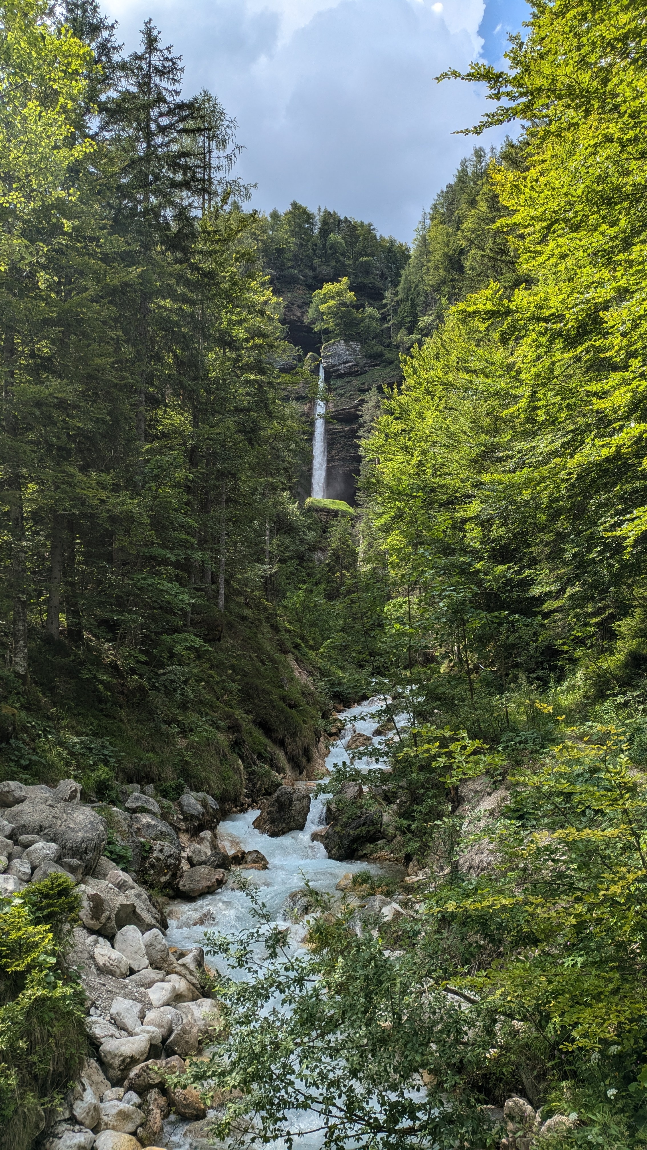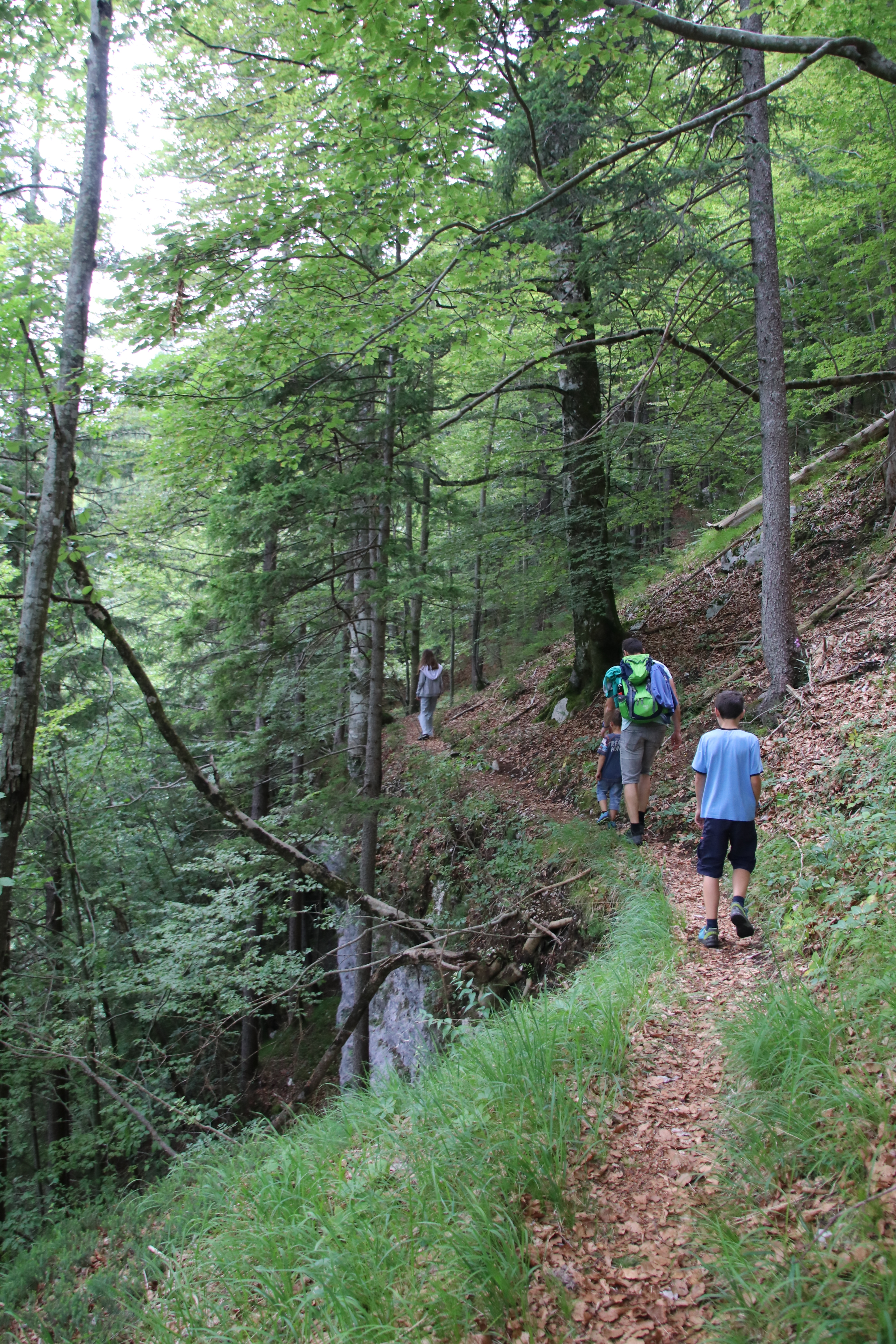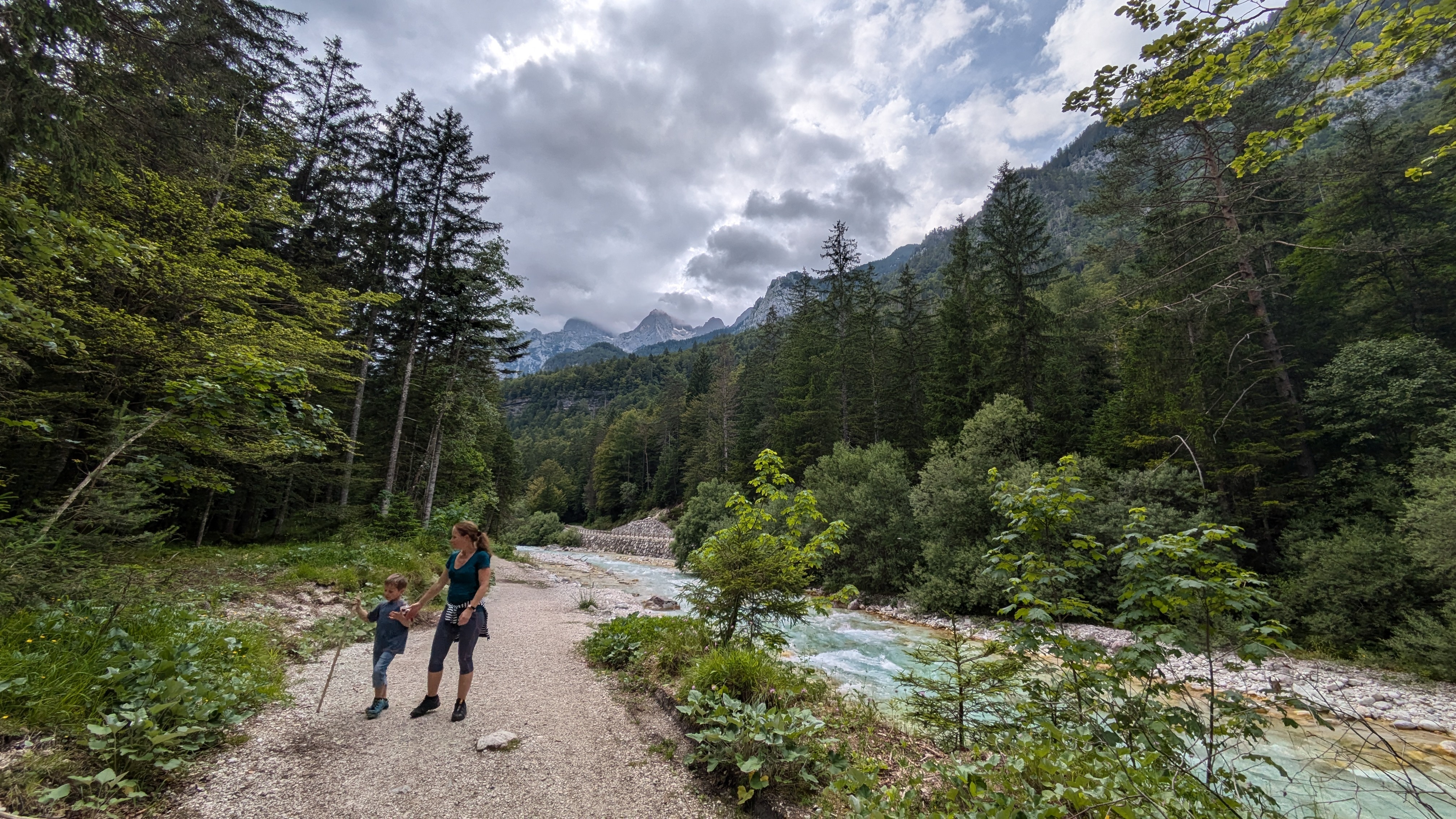 Wir halten auf dem Heimweg noch am Parkplatz zum Martuljkov-Wasserfall an. Der Weg durch den Wald ist nur etwas über einen Kilometer lang.