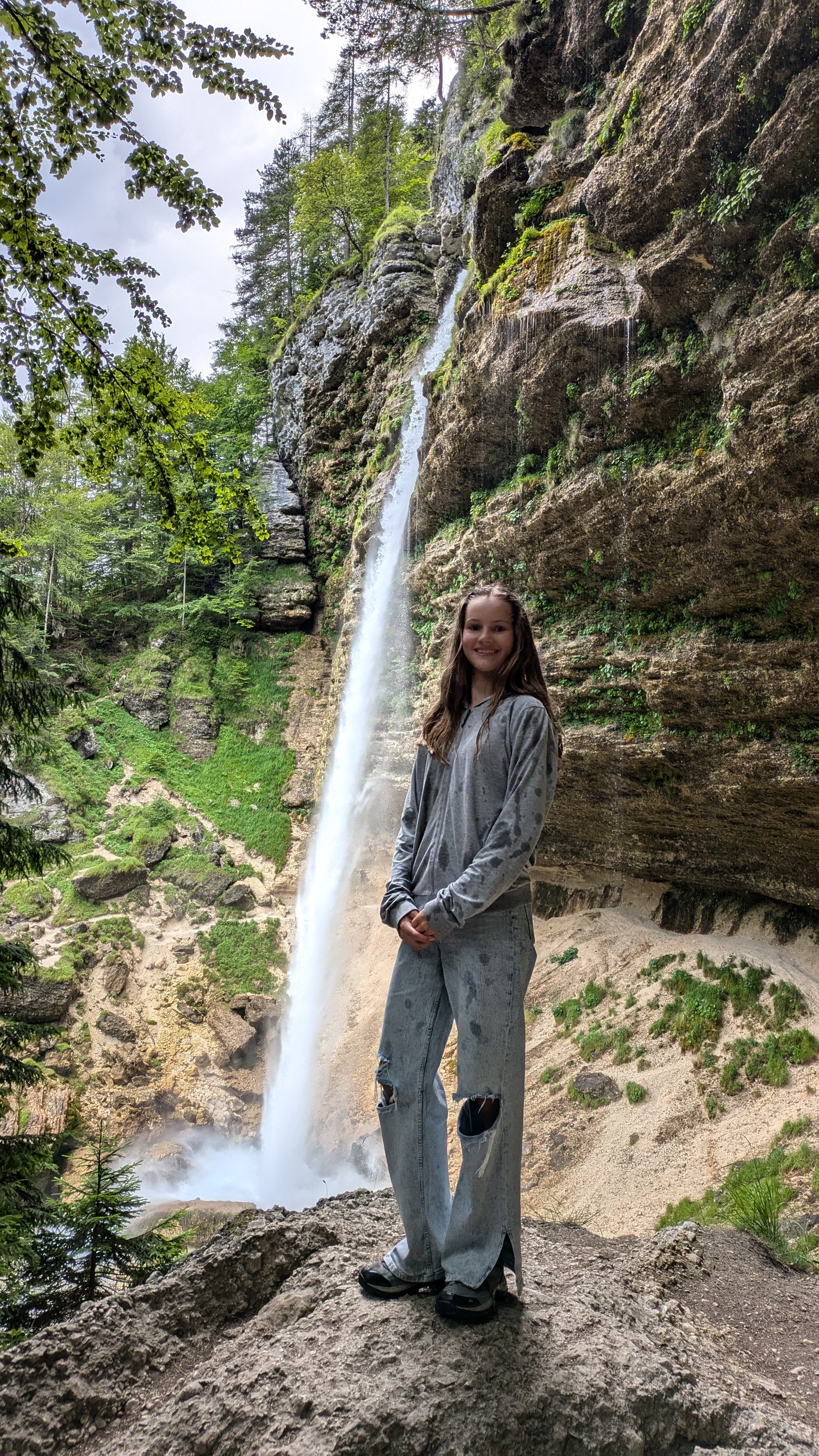 Nach zwei Stunden und 5 Kilometern erreichen wir den beeindruckenden Peričnik-Wasserfall. Ein steiler Weg mit vielen Stufen führt uns bis ganz hinauf.