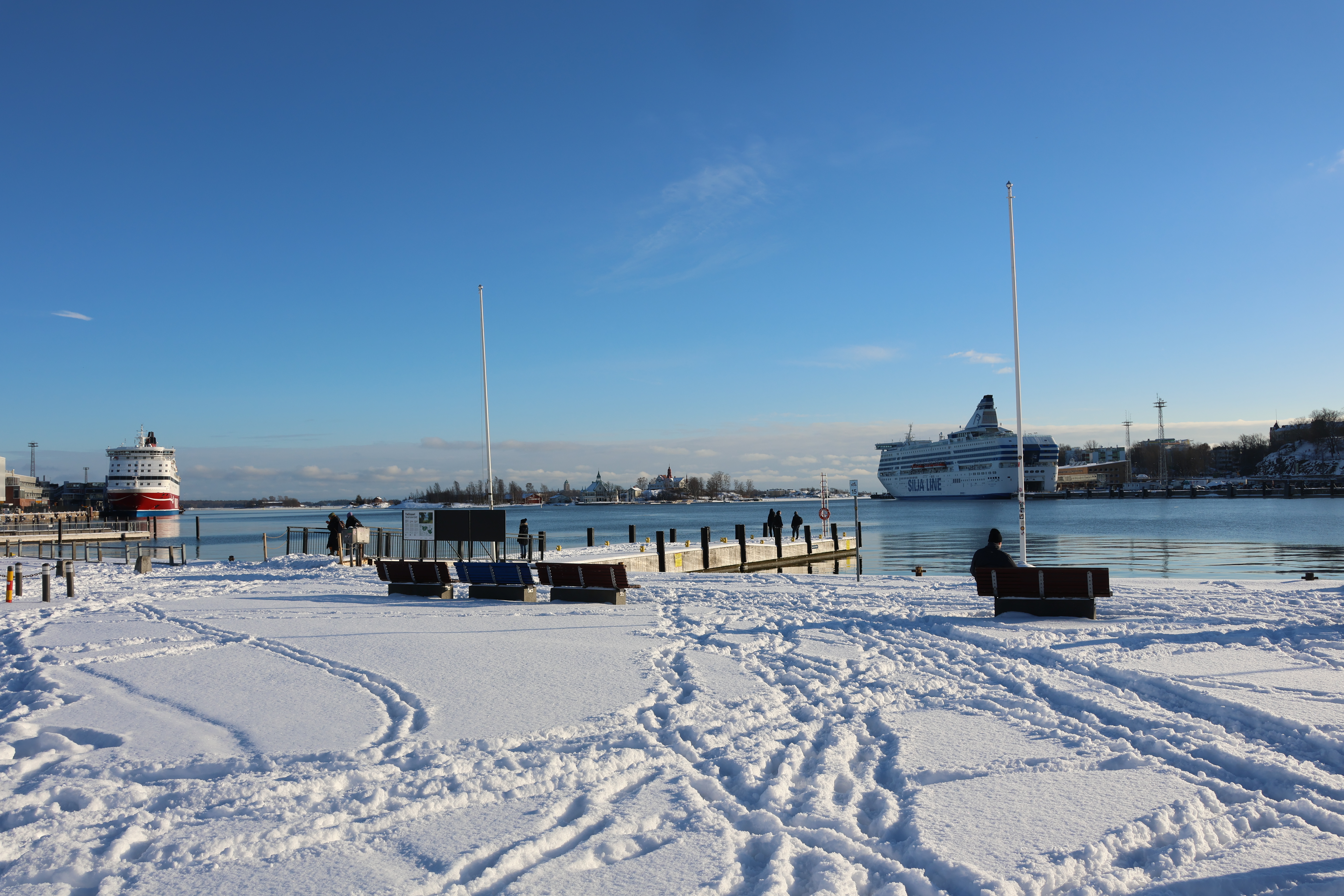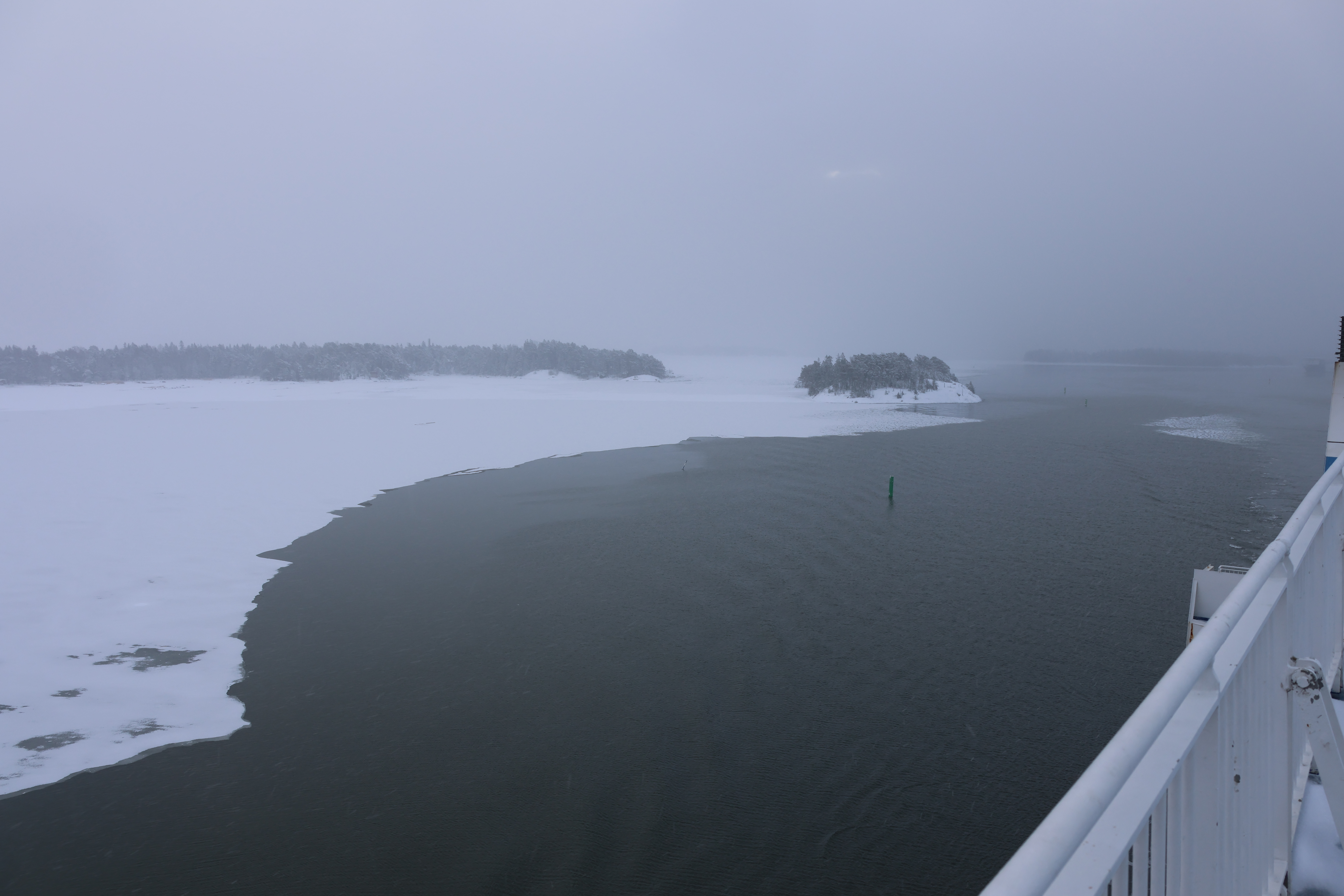 Nach einer weiteren ruhigen Nacht frühstücken wir in der Kabine. Gegen 10 Uhr fahren wir in den Hafen von Helsinki ein. Es ist nebelig und das Meer ist teilweise zugefroren.