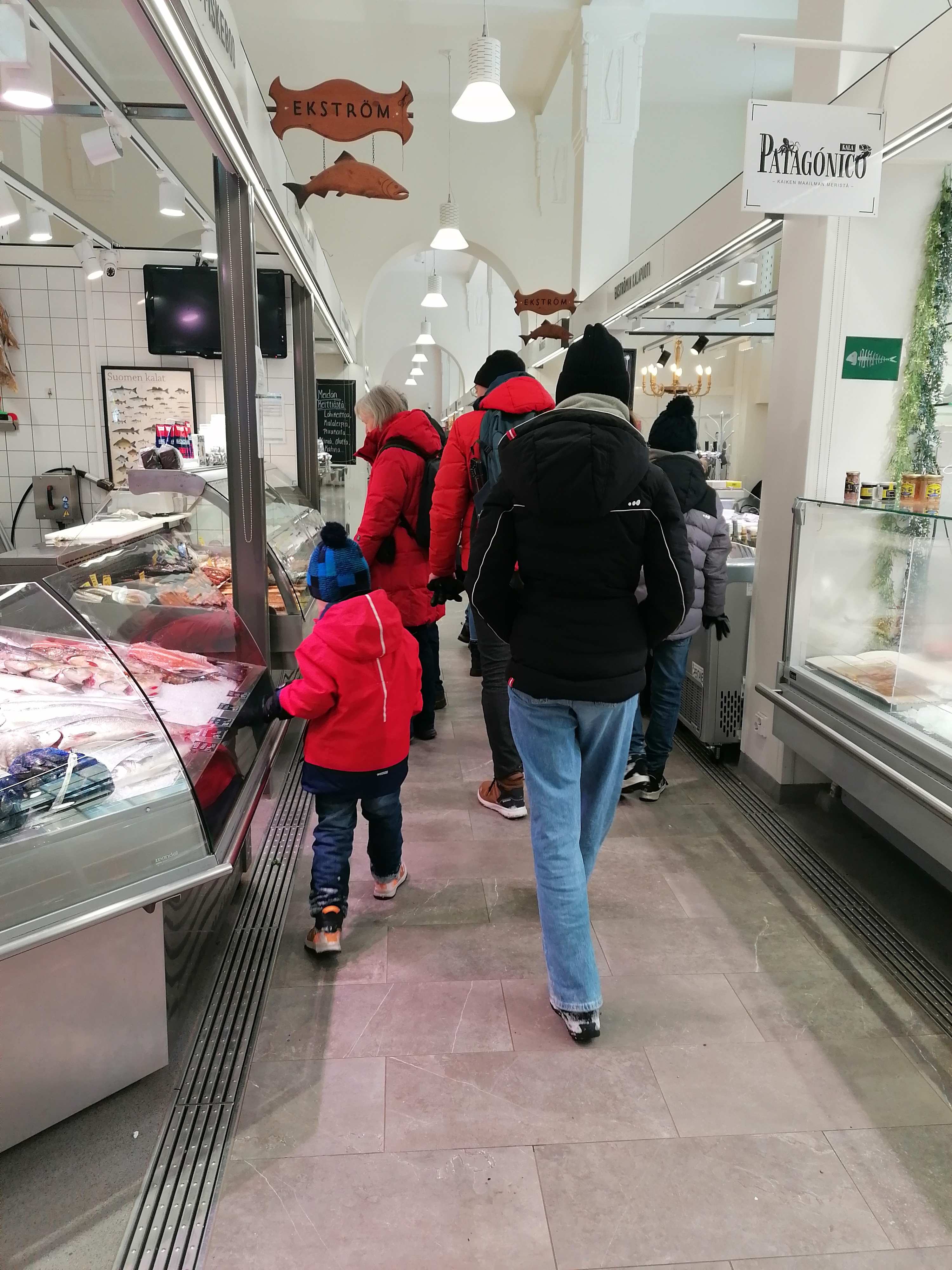 Als erstes schauen wir uns die 100 Jahre alte Markthalle “Hakaniemen kauppahalli” an. Hier werden allerhand einheimische Produkte wie frischer Fisch und Rentier-Spezialitäten angeboten. Durch die großen Fenster scheint die Sonne herein, die es heute wirklich gut mit uns meint.
