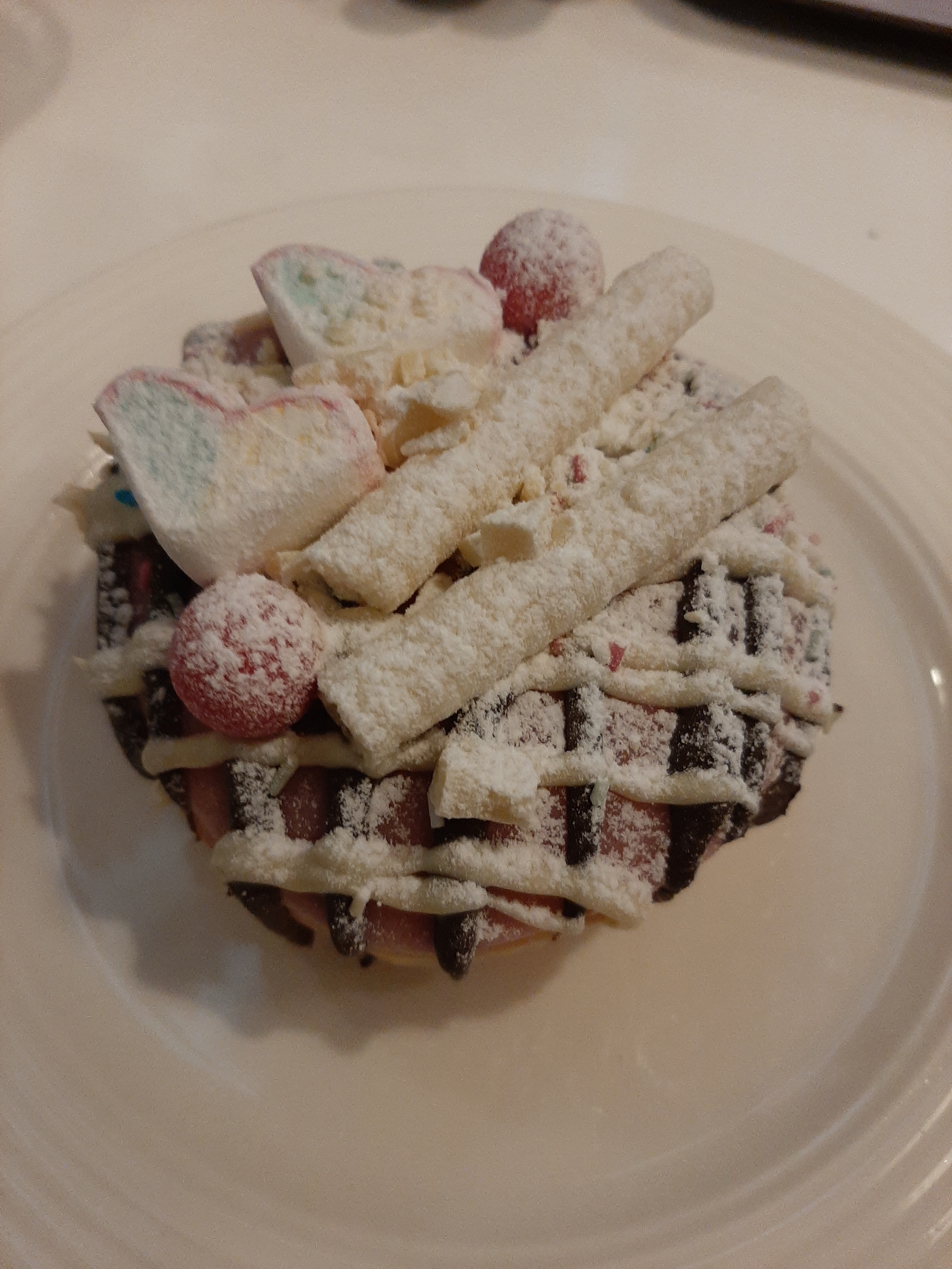 Zur Mittagszeit erreichen wir ein Café an der Skipiste. Zum Mittag will Felix einen mit viel Zuckerzeug dekorierten Berliner. Auch Mattis möchte so einen und merkt schnell, dass er dem Berg Zucker nicht gewachsen ist. Wir packen den größten Teil davon für’s Kaffeetrinken ein.