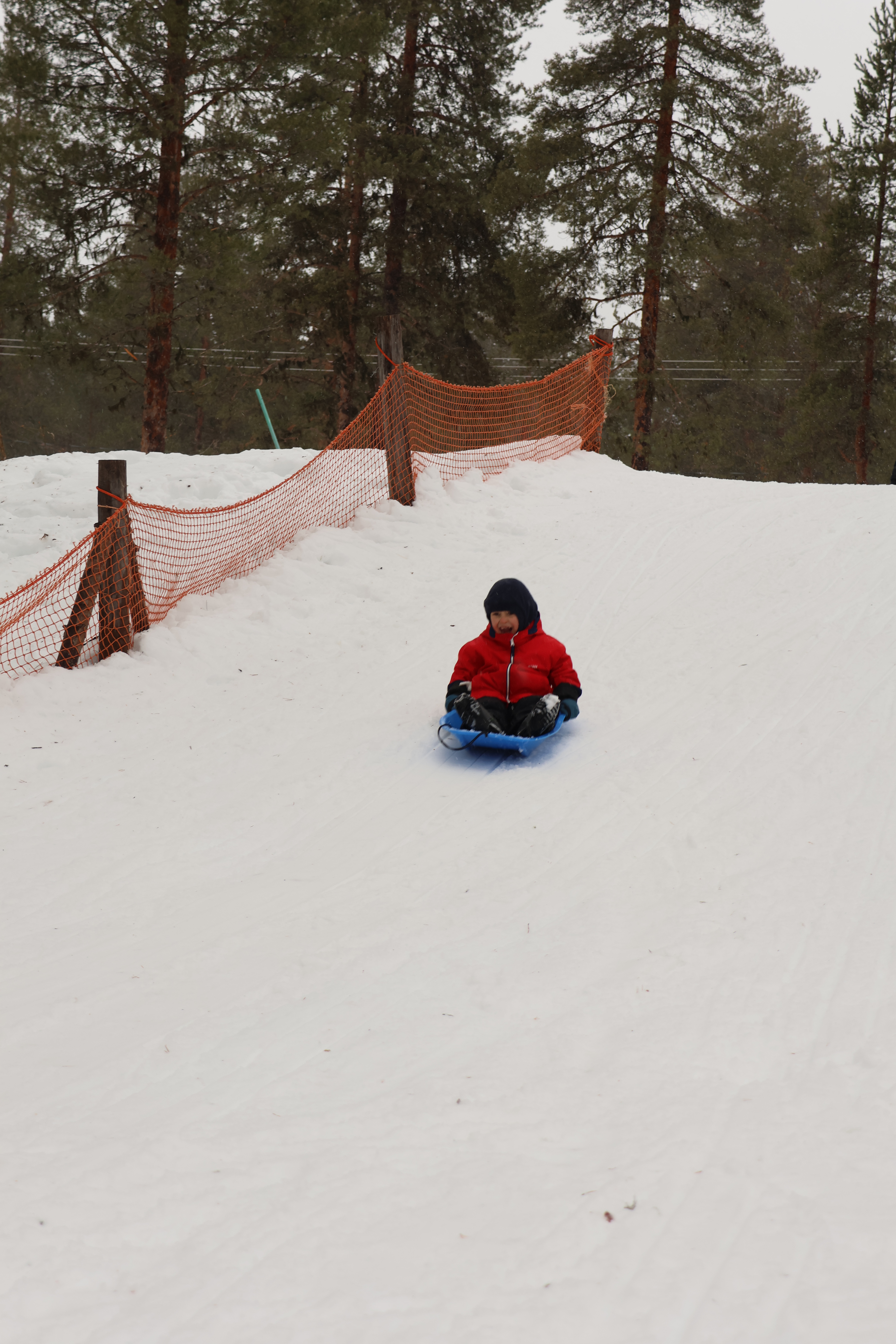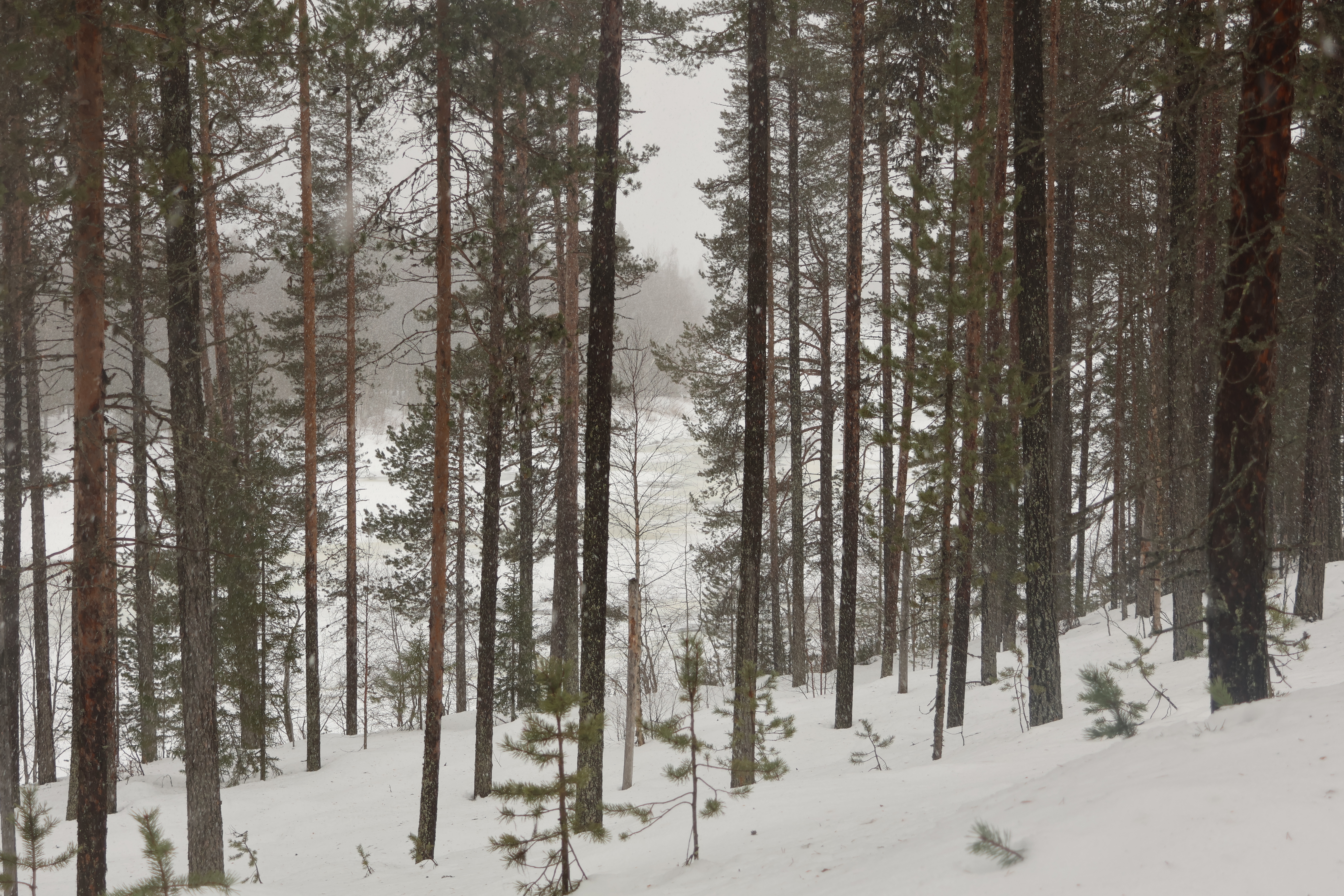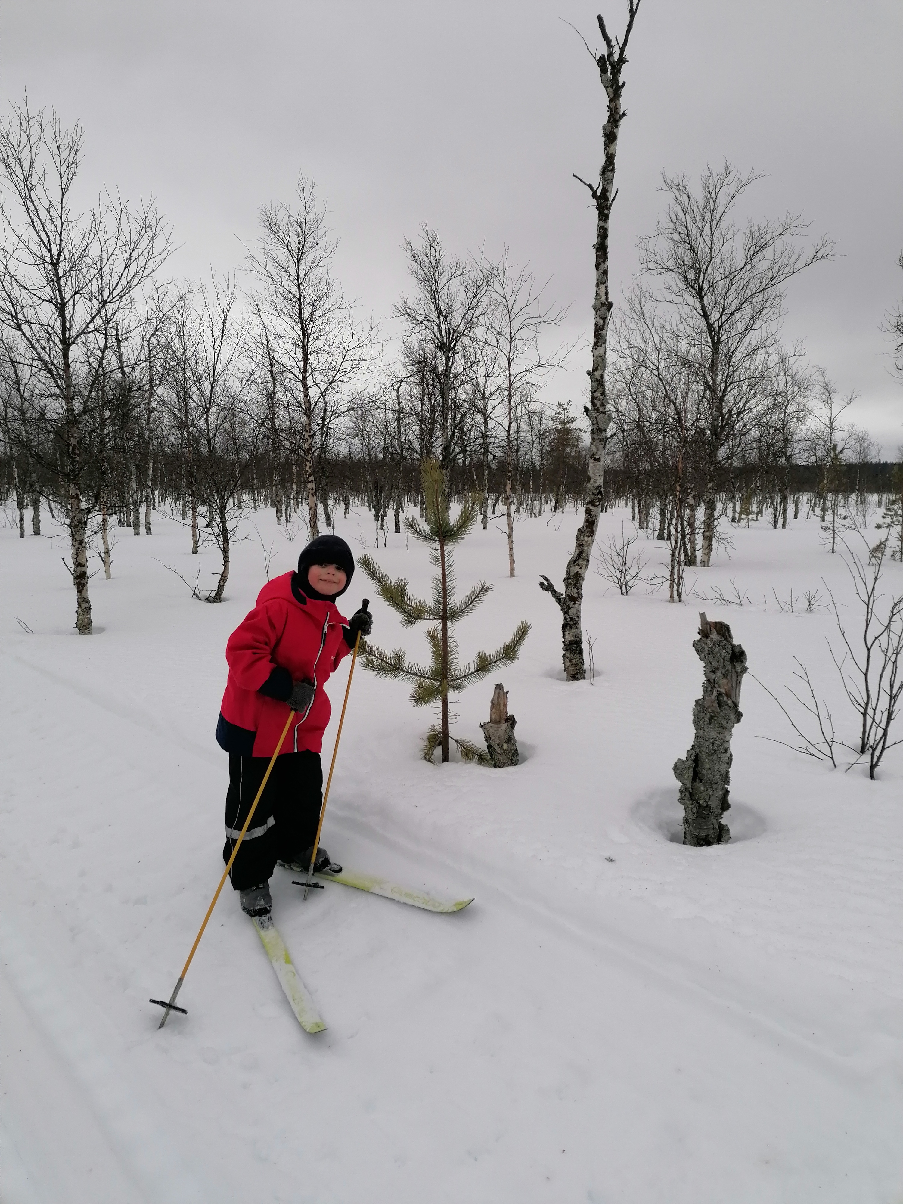 Die Strecke verläuft ein Stück entlang eines breiten, zugefrorenen Flusses. Leider kommen wir nicht bis hin, beim Versuch die Loipe zu verlassen, versinken wir sofort bis zum Oberschenkel im Schnee.
