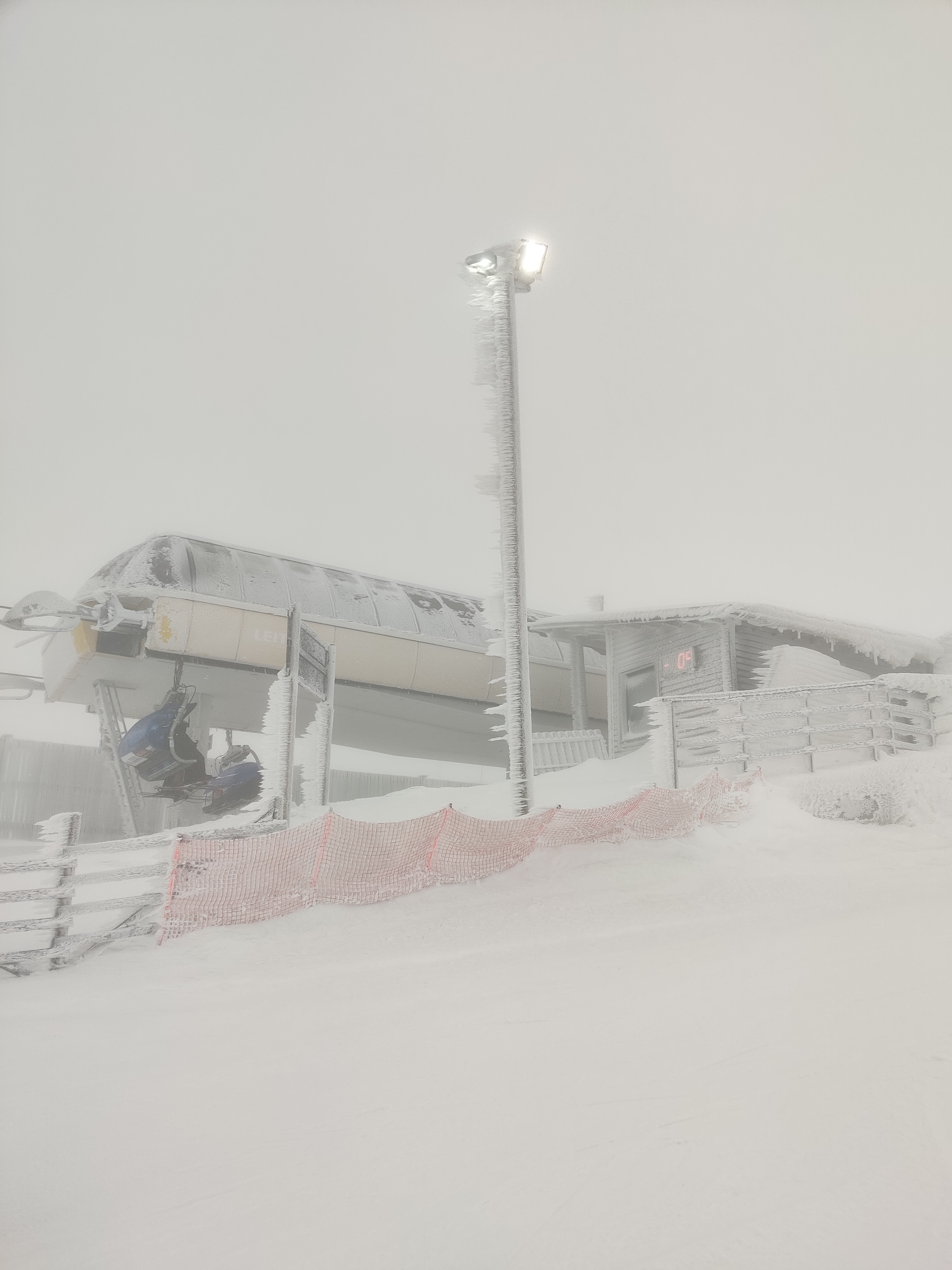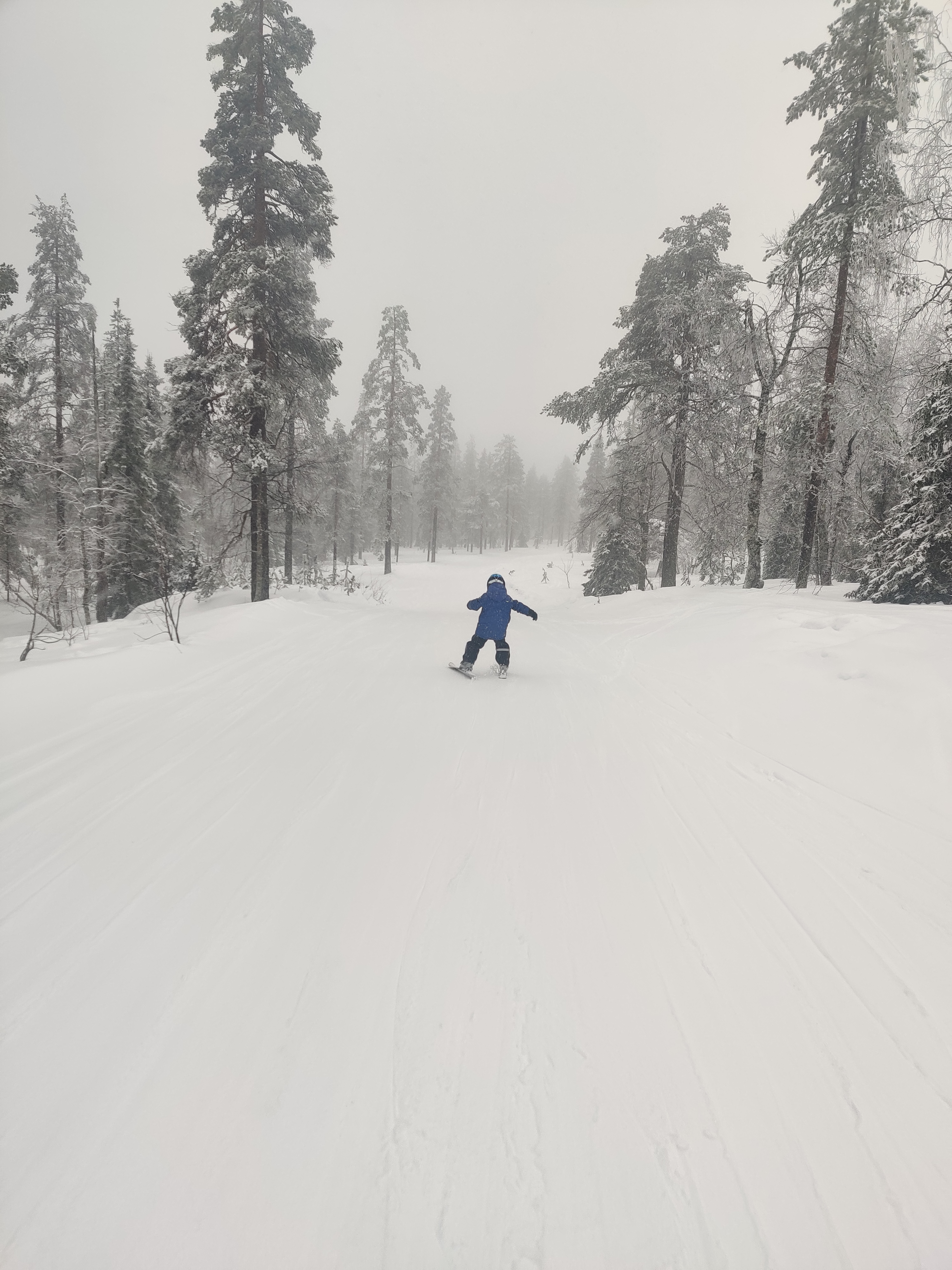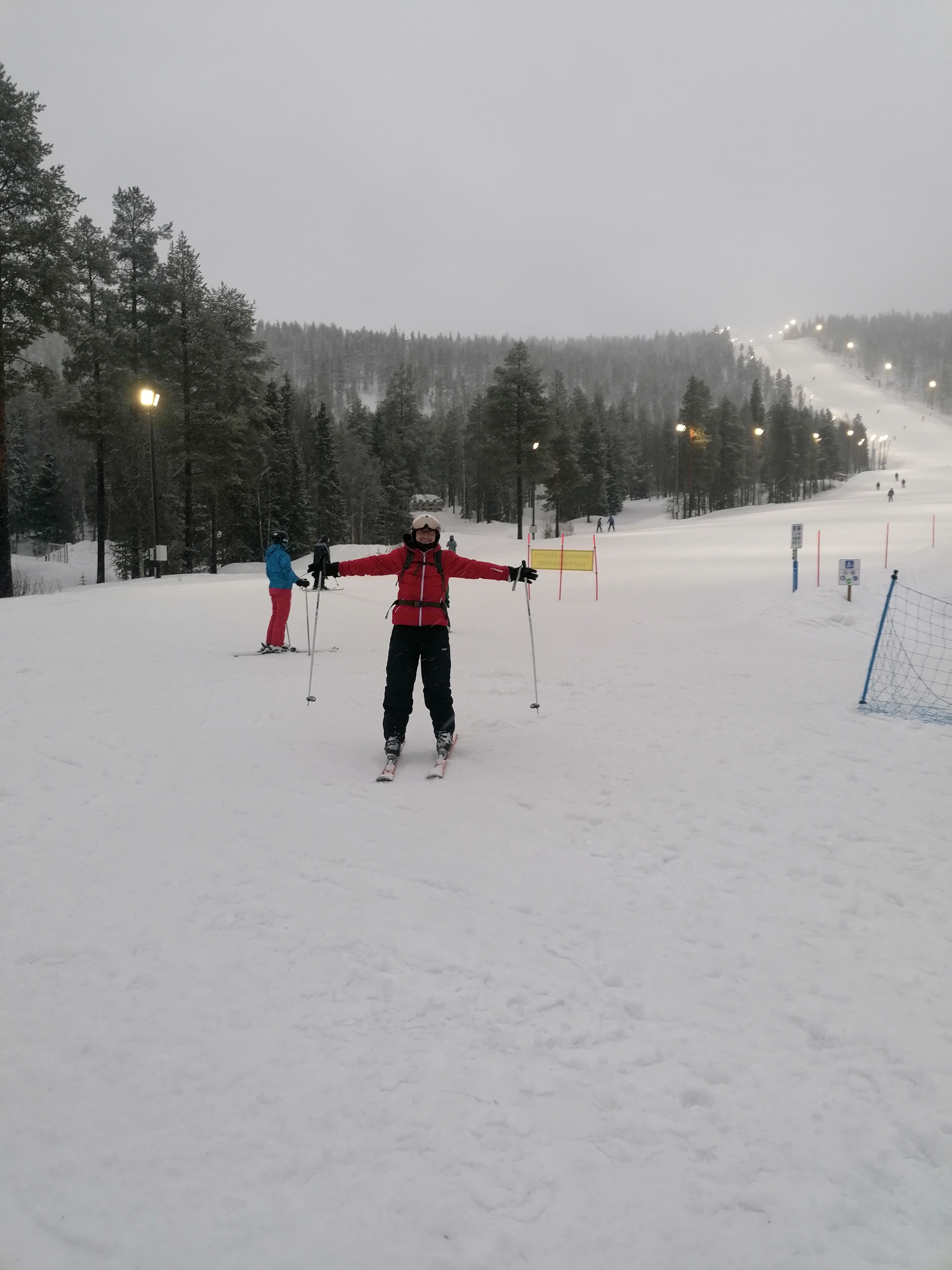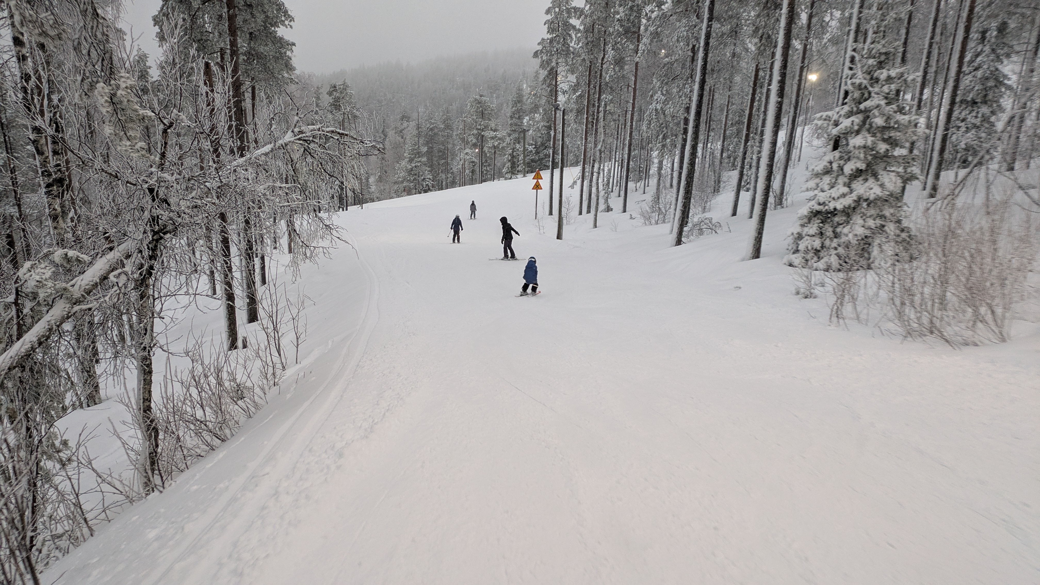Heute wollen wir noch einmal auf die Piste, das Skigebiet “Levi” austesten. Es ist immer noch bewölkt und schneit leicht. Nach dem Frühstück fahren wir ein paar Minuten bis zum Lift und lösen uns Skipässe für einen Tag.