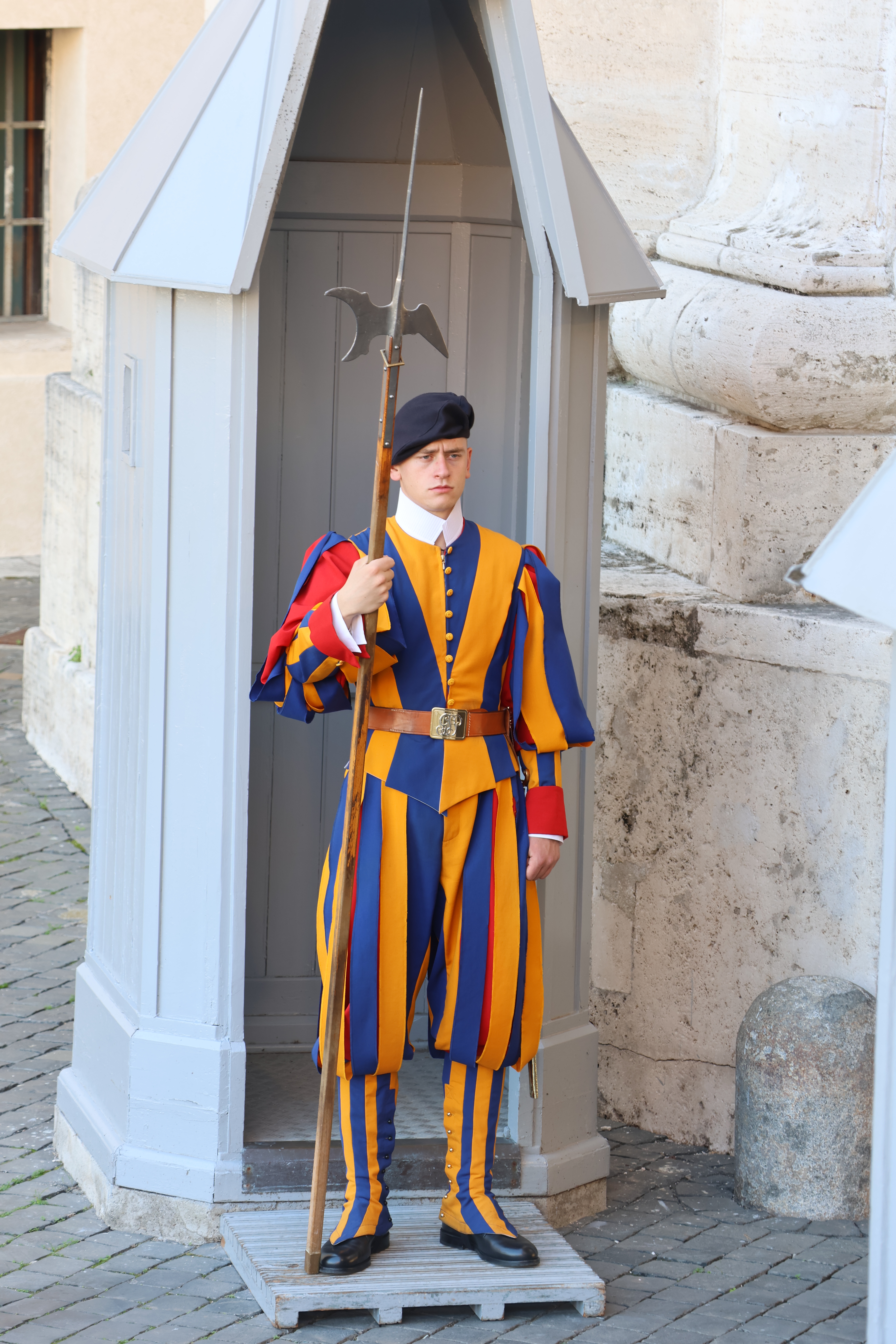 Auf dem Rückweg nehmen wir die Treppe, da am Fahrstuhl eine lange Schlange ansteht. Unten hält die Schweizer Garde rund um die Kirche Wache.